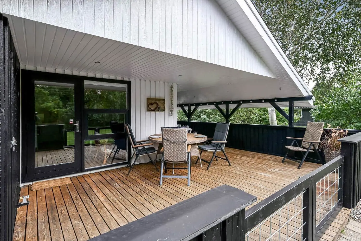 Von außen betrachtet handelt es sich bei diesem im Jahr 1988 erbauten Haus um ein ganz klassisches Holzferienhaus. Auch im Hausinneren ist der ganz typische, gemütliche Ferienhauscharme erhalten geblieben. Dennoch werden Sie bereits nach dem ersten Betreten bemerken, dass die hellen Räumlichkeiten in schönster Weise modernisiert und renoviert wurden. Während der letzten Renovierung im Jahr 2018 standen unter anderem das Badezimmer und die Küche im Mittelpunkt, sodass Sie sich nun auf ein stilvolles Interieur und gute Elektrogroßgeräte freuen dürfen. Die attraktive Küche ist offen mit dem Wohnraum verbunden, bei dem es sich um einen stimmungsvollen Aufenthaltsraum mit einem romantisch knisternden Kaminofen, einem Essplatz und einer schönen Sofaabteilung handelt. In diesem Raum werden Sie sicherlich zahllose entspannte und gemütliche Stunden im Kreise Ihrer Liebsten verbringen. Die weißen Holzverkleidungen an den Wänden und an der Decke verleihen dem Wohnraum einen ganz reizendes, behagliches Ambiente und tragen maßgeblich zur gemütlichen Stimmung in den drei Schlafzimmern bei. Insgesamt beherbergt dieses attraktive Ferienhaus bis zu sechs übernachtende Urlauber.