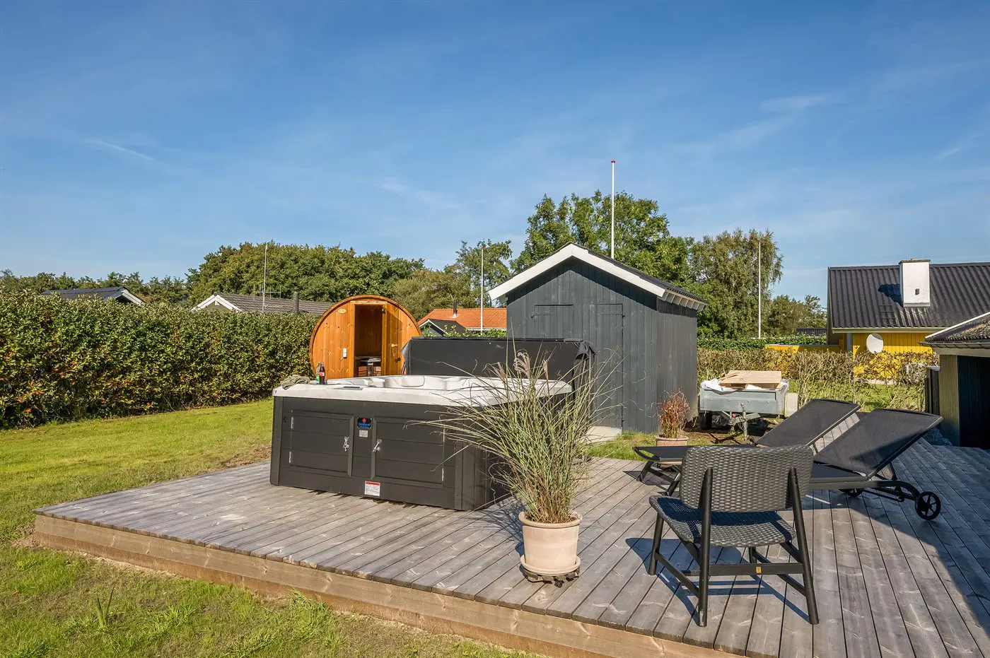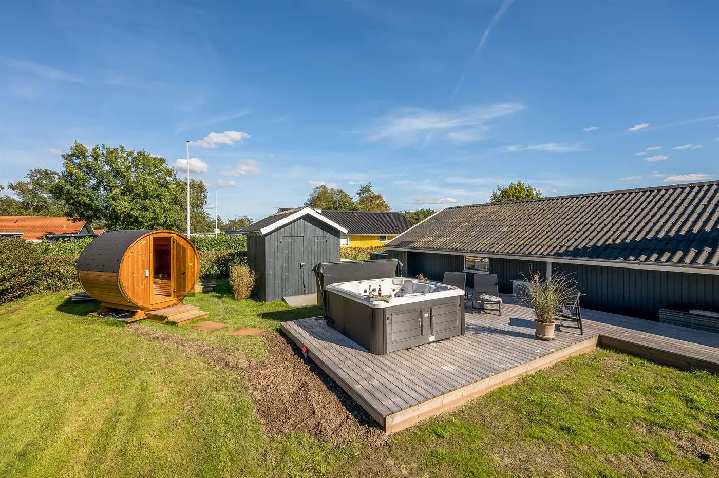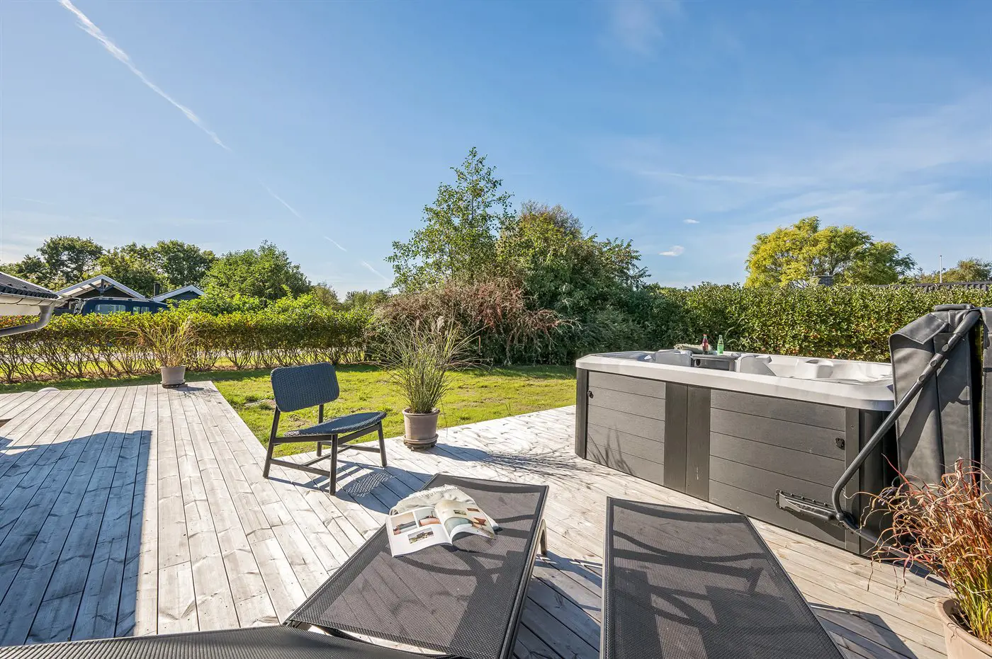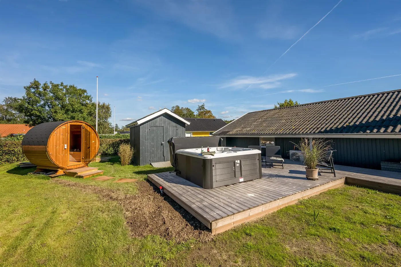 Für besondere Wohlfühlmomente könnt ihr auf der einladenden Terrasse entspannen, die Außensauna nutzen oder im sprudelnden Außen-Whirlpool die Seele baumeln lassen – und das am Abend mit einem herrlichen Blick auf den klaren Sternenhimmel.
