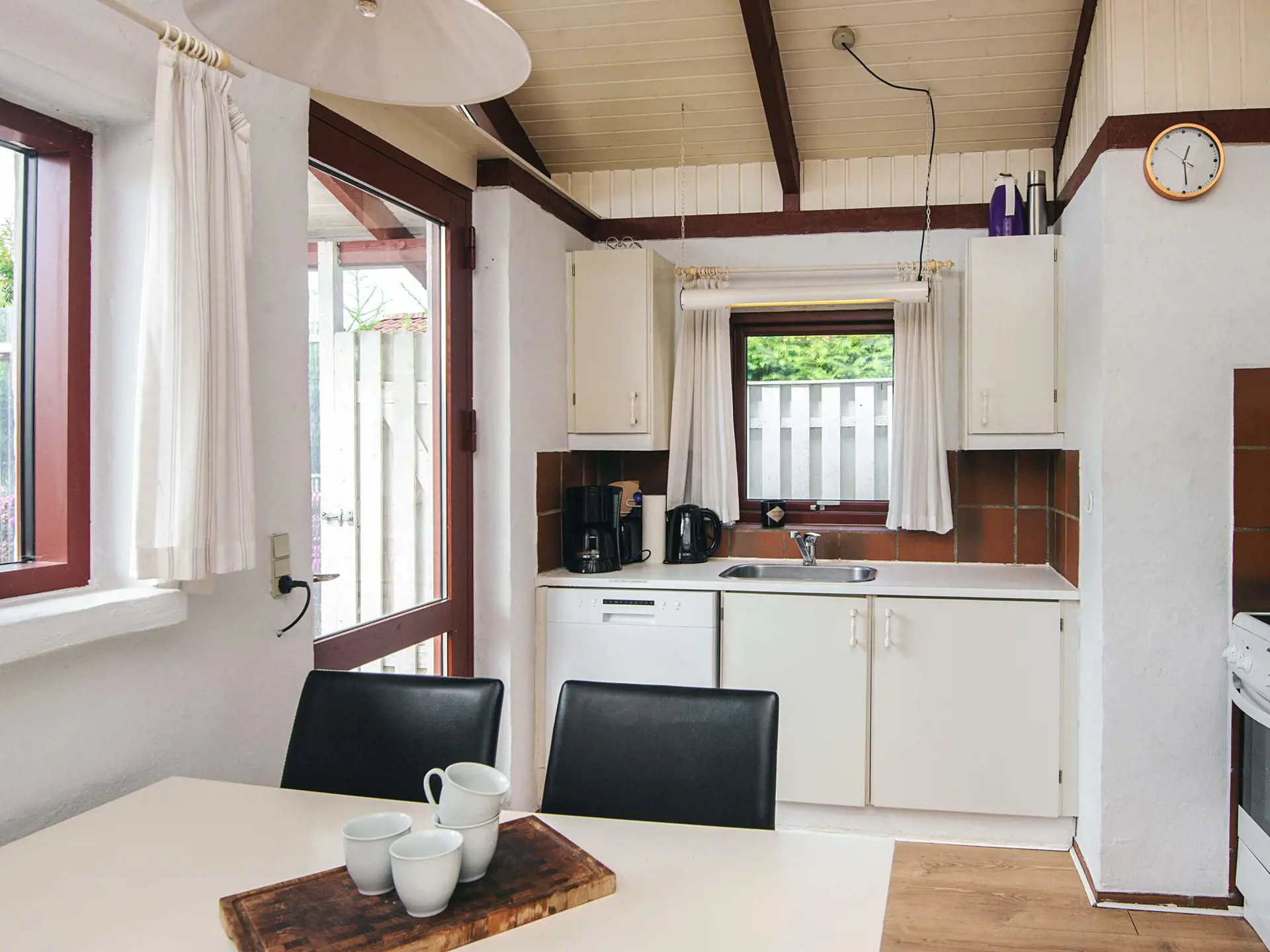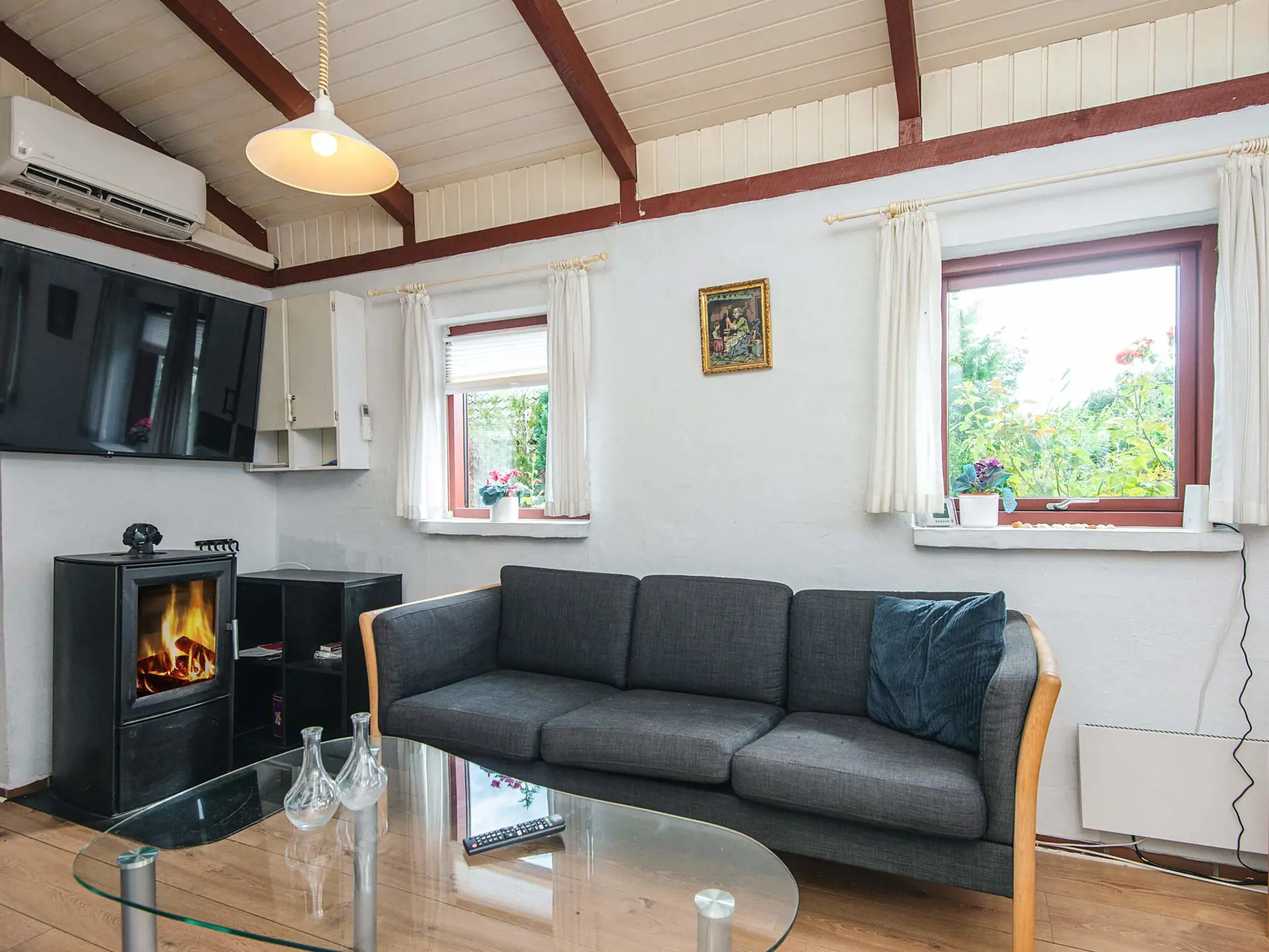 Im Inneren befindet sich ein großes Schlafzimmer mit einem Doppelbett und einem Doppelschlafsofa im Eingangsbereich, das flexible Schlafmöglichkeiten für bis zu vier Personen bietet. Das Badezimmer ist mit einer Waschmaschine und einem Trockner ausgestattet, was längere Aufenthalte angenehm und unkompliziert macht. Für die Beheizung sorgen ein Holzofen, der für Wärme und Charme sorgt, und eine energieeffiziente Wärmepumpe, die zu jeder Jahreszeit für Komfort sorgt.