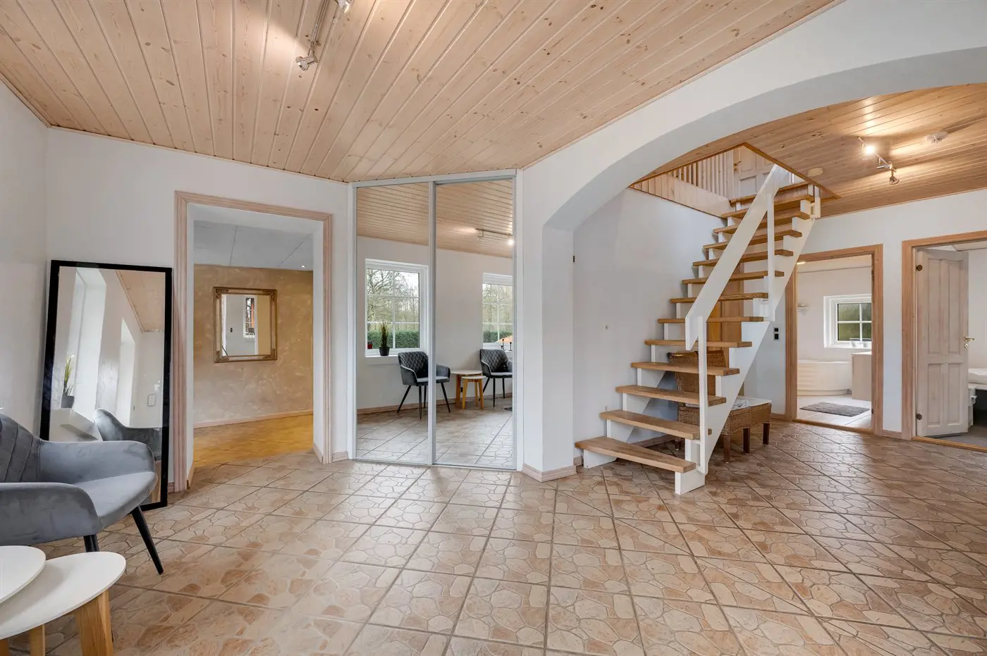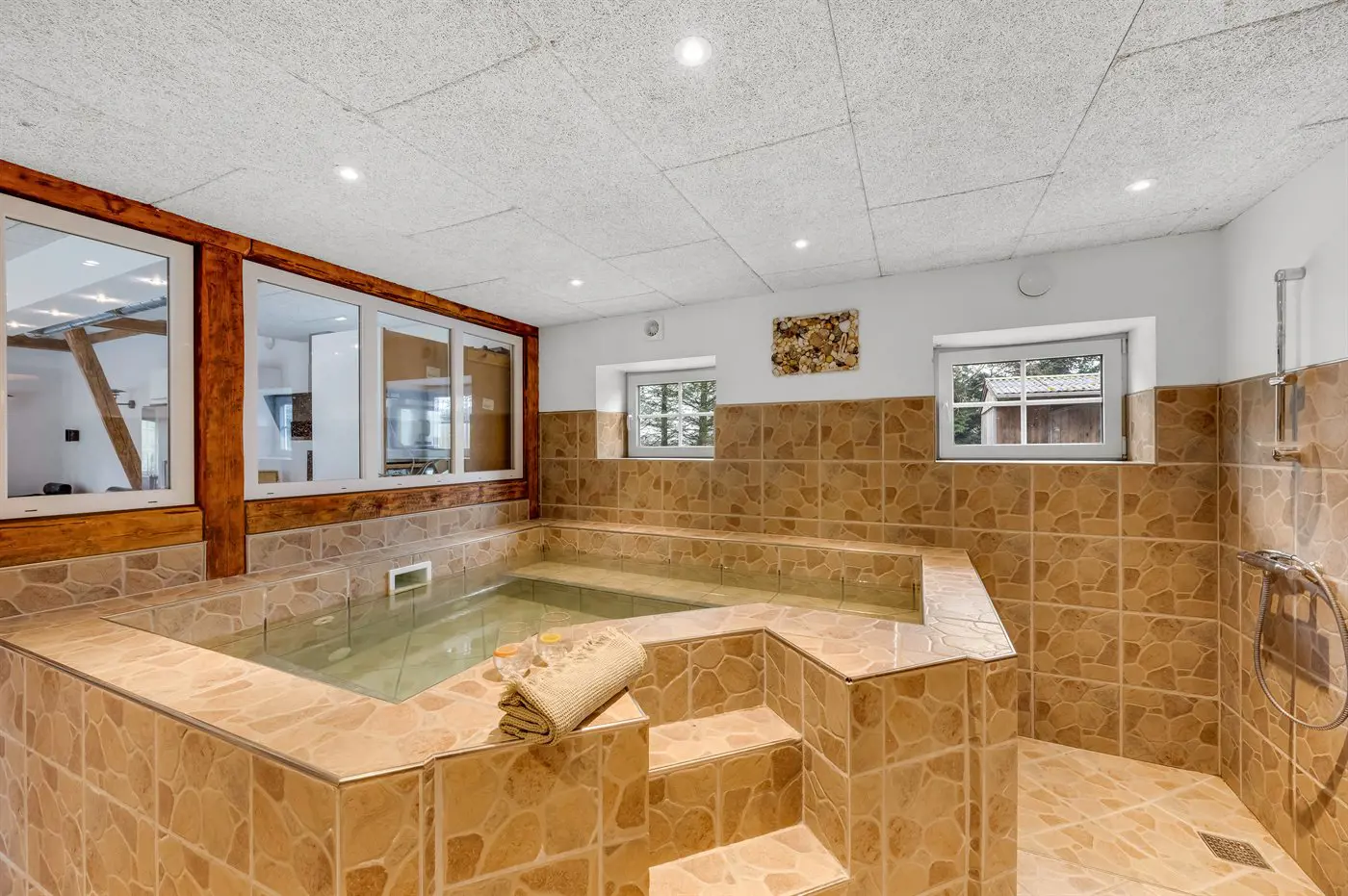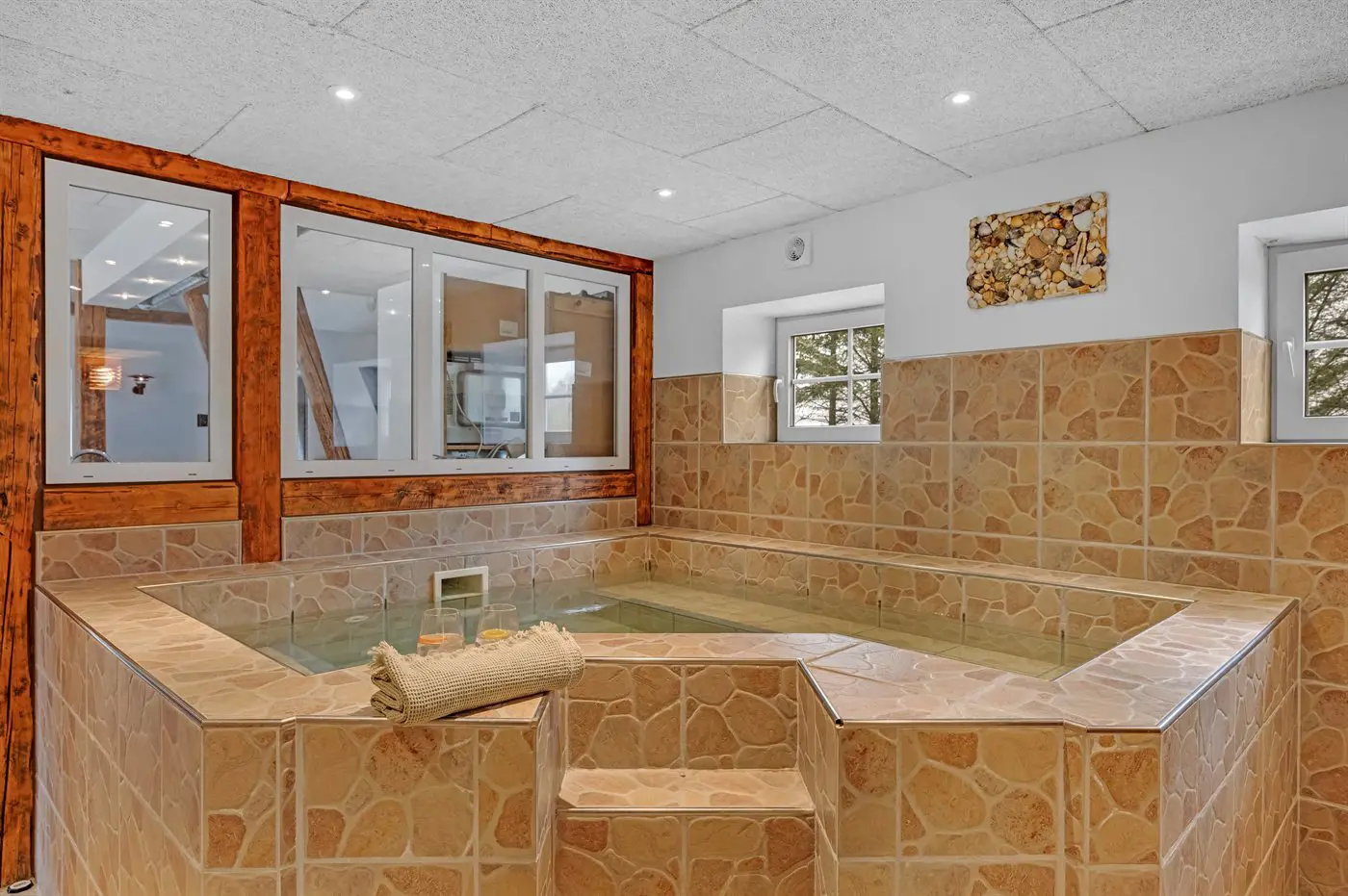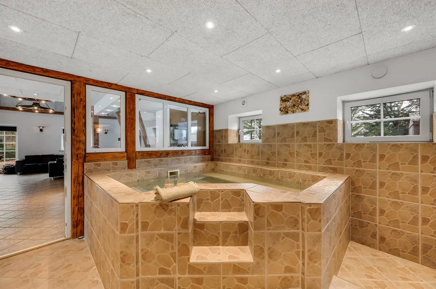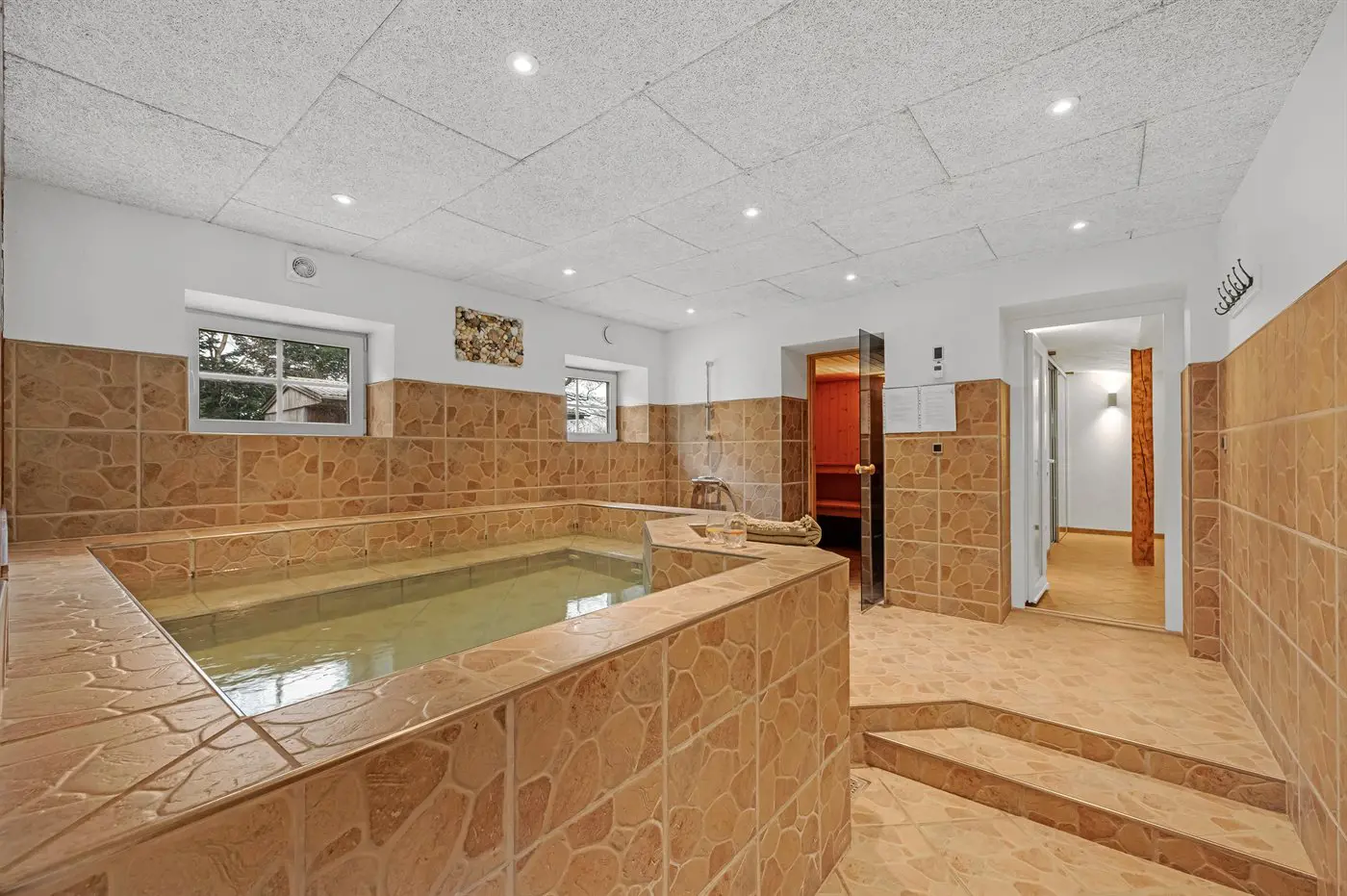 Das Haus bietet unter anderem ein schönes Indoor-Warmwasserbecken mit Standwasser – perfekt für Entspannung und Wohlbefinden das ganze Jahr über, unabhängig vom Wetter draußen. Hier vereinen sich Großzügigkeit, Komfort, Naturerlebnis und unterhaltsame Aktivitäten auf ganz besondere Weise.