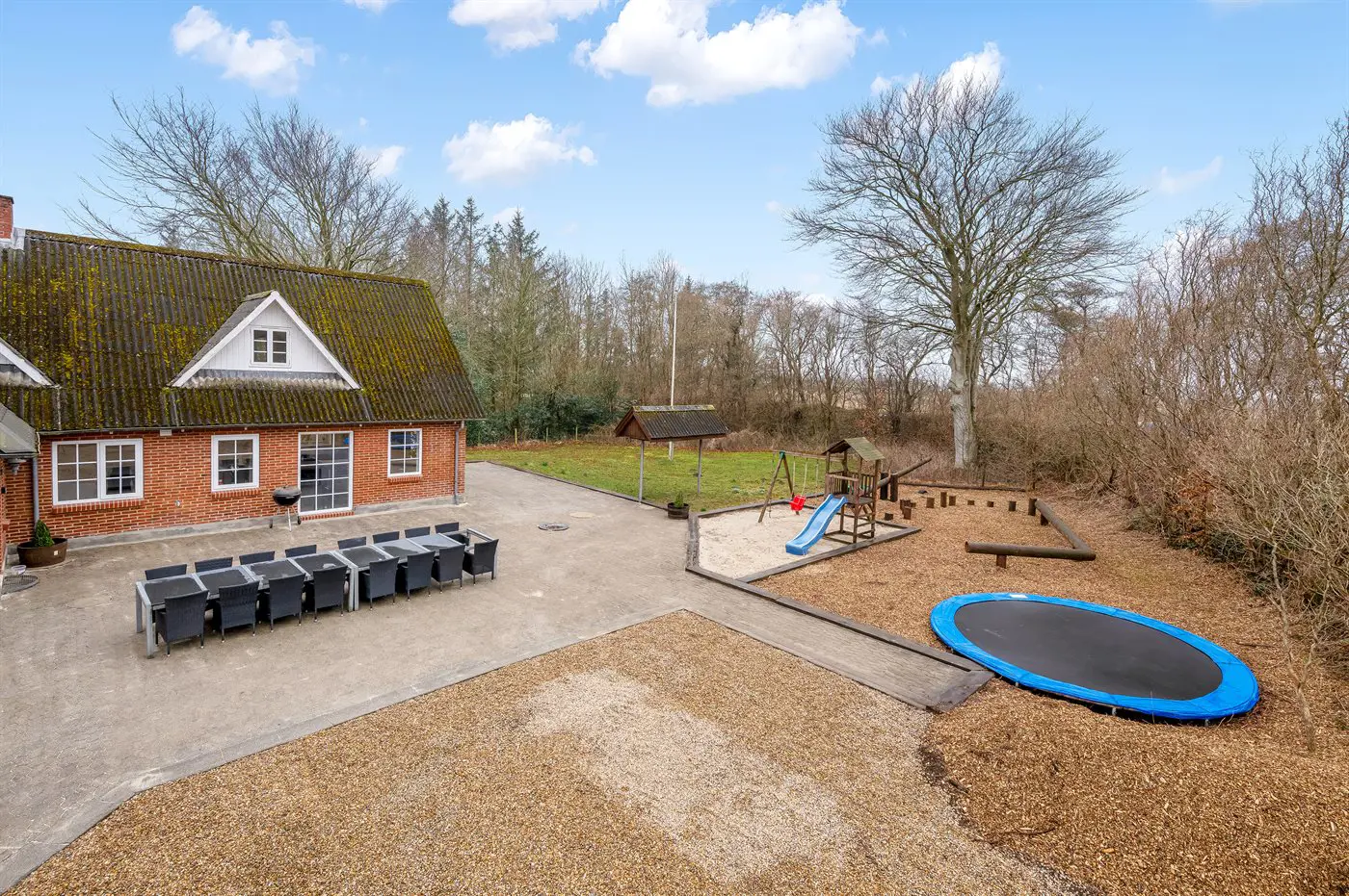 Die Ferienunterkunft liegt auf einem 23365 m² großen Naturgrundstück. Die Entfernung zum Meer beträgt 25000 m. Die Entfernung zum Fjord beträgt 9000 m. Die nächste Einkaufsmöglichkeit liegt 800 m entfernt. In einem Abstand von 10000 m gibt es einen Golfplatz. Es steht ein offenes Terrassenareal zur Verfügung. Sandkasten. Trampolin. Spielturm. Rutsche.Wippe. Fußballtor.Lagerfeuerstelle. Parkplatz auf dem Grundstück.