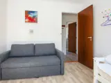 Von der Küche des Hauses aus gibt es einen offenen Zugang zum Ess- und Wohnbereich. Das Haus hat zudem zwei Schlafzimmer; eines mit Doppelbett und Kleiderschrank, das andere mit einem Einzelbett und einer doppelten Schlafcouch zum Ausklappen. Klimafreundlicher Wärmepumpe im Haus.