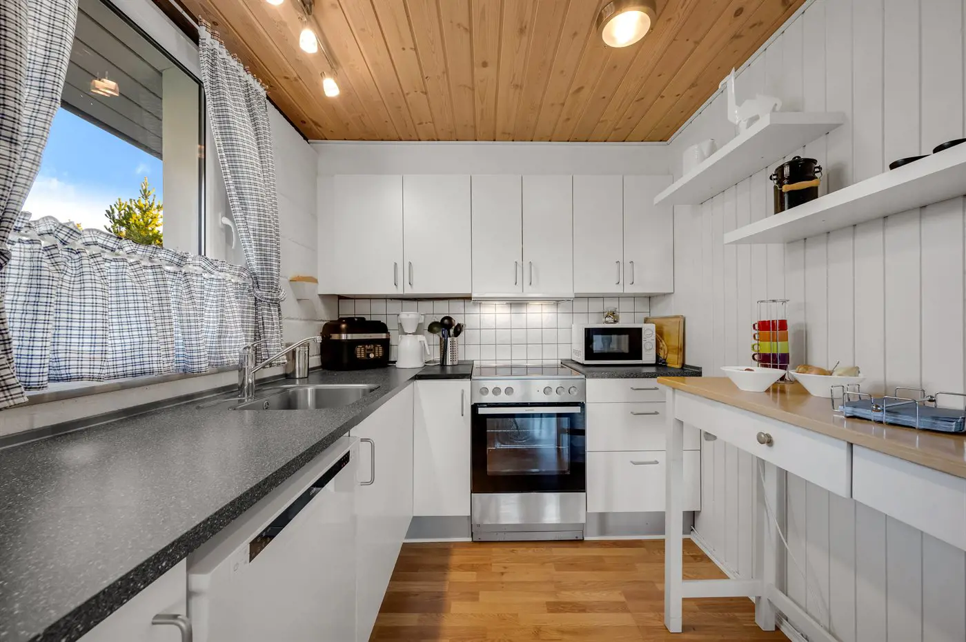 Die Küche ist mit Kühlschrank ausgestattet. Außerdem gibt es 4 Keramik-Kochfelder, Umluftofen, Mikrowelle, Airfryer sowie Geschirrspüler.