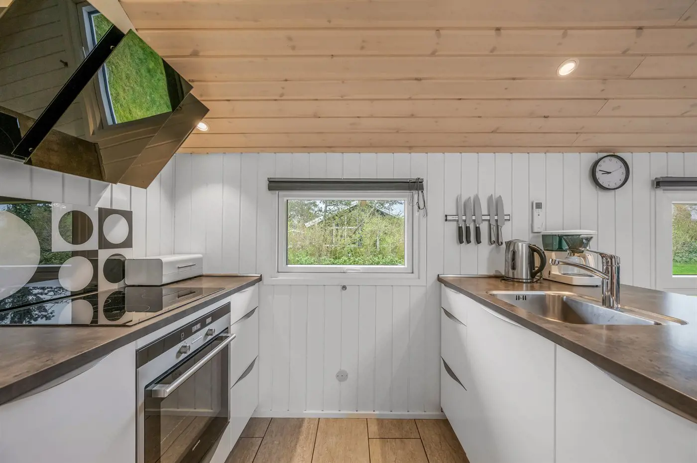 Die Küche ist mit Kühlschrank ausgestattet. Außerdem gibt es 4 Induktions-Kochzonen, Umluftofen, Mikrowelle sowie Geschirrspüler.