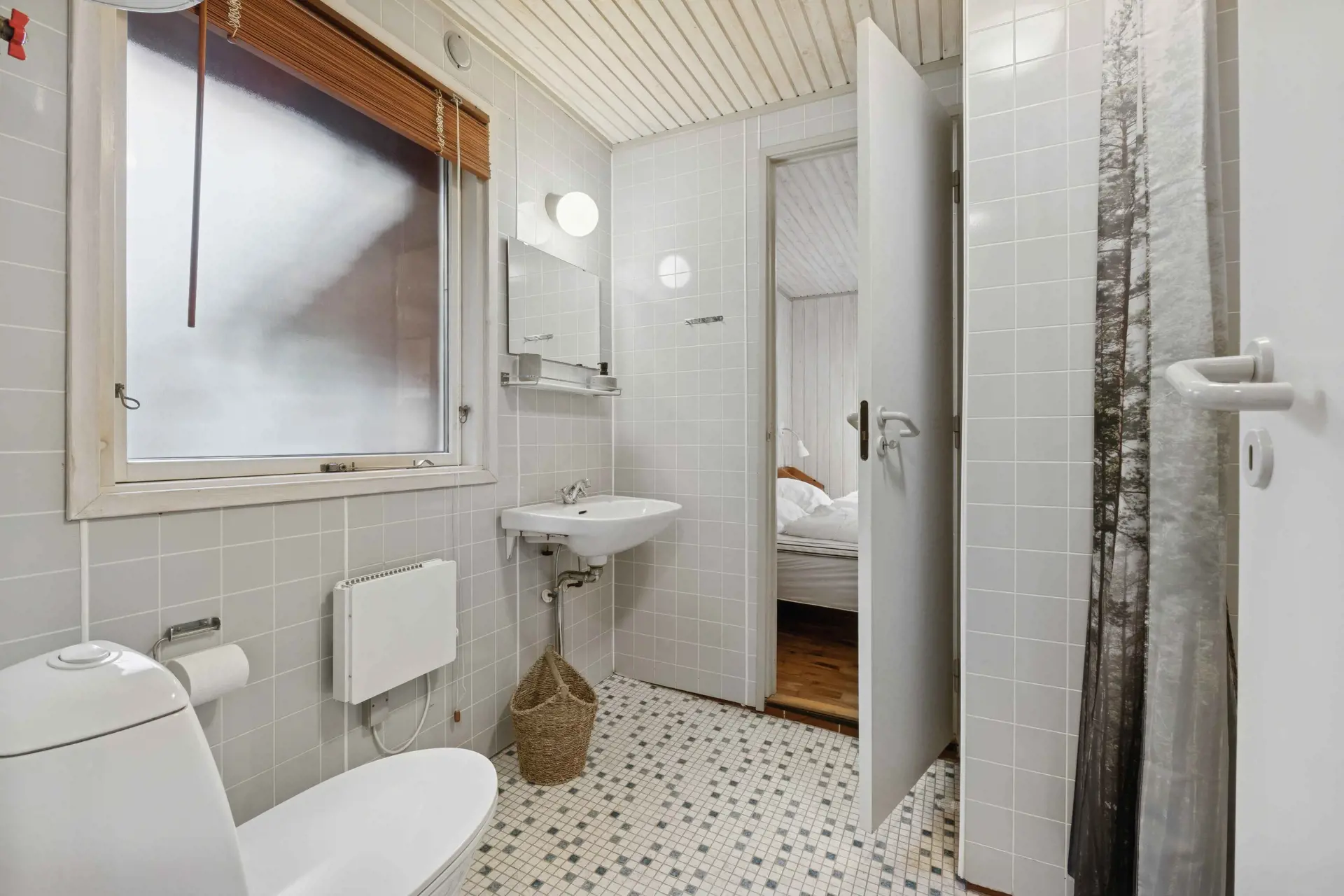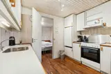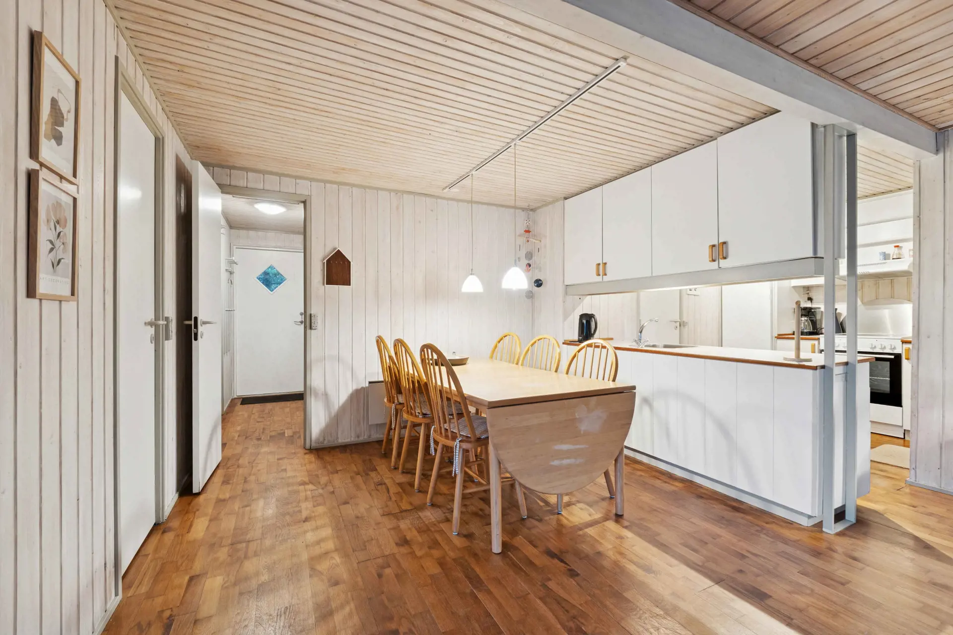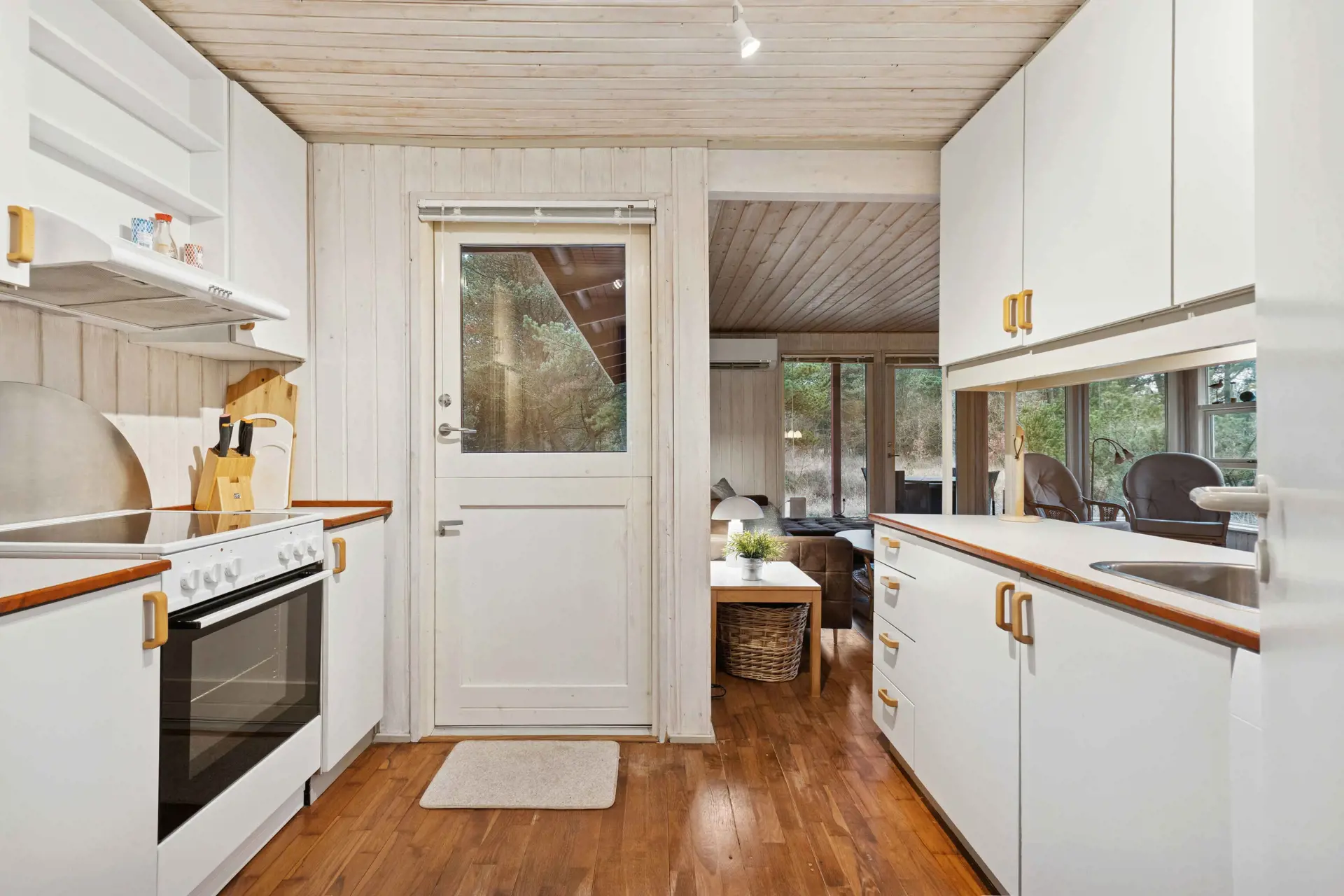 Im Inneren liegen Küche, Essbereich und Wohnzimmer in einem zusammenhängenden Raum. Ein Holzofen sorgt an kühlen Tagen für Behaglichkeit. Das Haus verfügt über drei Schlafzimmer: eines mit Doppelbett, eines mit Einzelbett und eines mit Etagenbett.