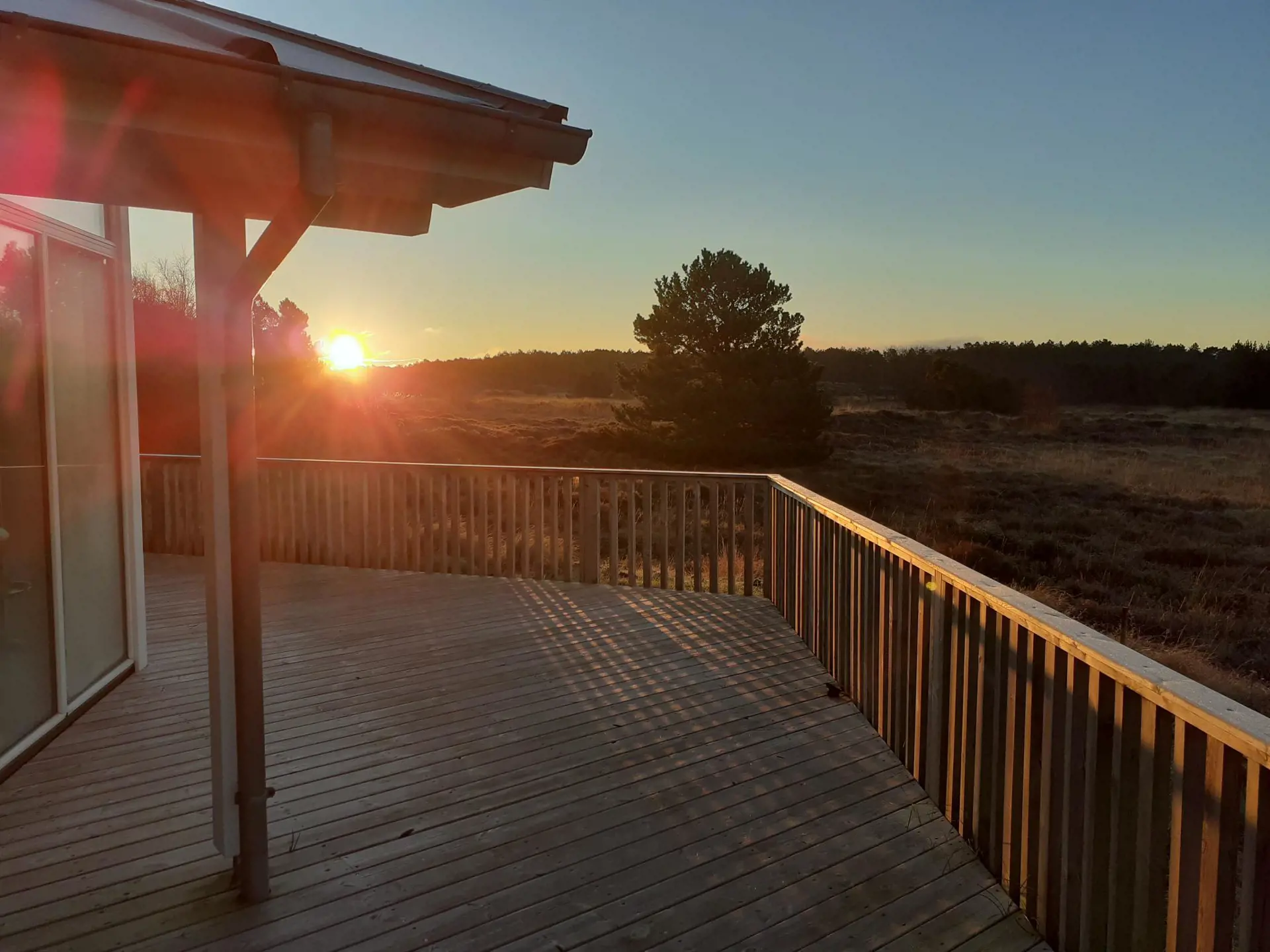 Die großzügige Terrasse mit schönen Gartenmöbeln ist teils überdacht und abgeschirmt – hier lässt sich immer ein Platz zum Relaxen in der Sonne – oder dem Schatten – finden. Das Grundstück ist besonders kinderfreundlich und mit Spielgeräten ausgestattet. Die Lage am Ende einer kleinen Sackgasse garantieren Ruhe und Erholung. Besonders im August, wenn die Heide blüht und einem riesigen lila Kissen ähnelt, werden ein Frühstück im Freien oder ein Grillabend zu einem ganz besonderen Urlaubserlebnis. Es gibt eine Außendusche, welche ihr von April bis November nutzen könnt.