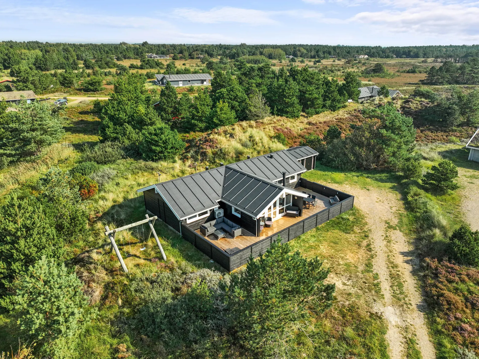 Vom Wohnzimmer des Ferienhauses aus habt ihr Zugang zur schönen Terrasse, die an warmen Sommertagen ein guter Treffpunkt für die ganze Familie ist. Die Terrasse ist umzäunt, so dass ihr euch keine Sorgen machen müsst, dass sich die Jüngsten zu weit wegbewegen. Für eure Kinder gibt es eine Schaukel auf dem großzügigen Naturgrundstück.