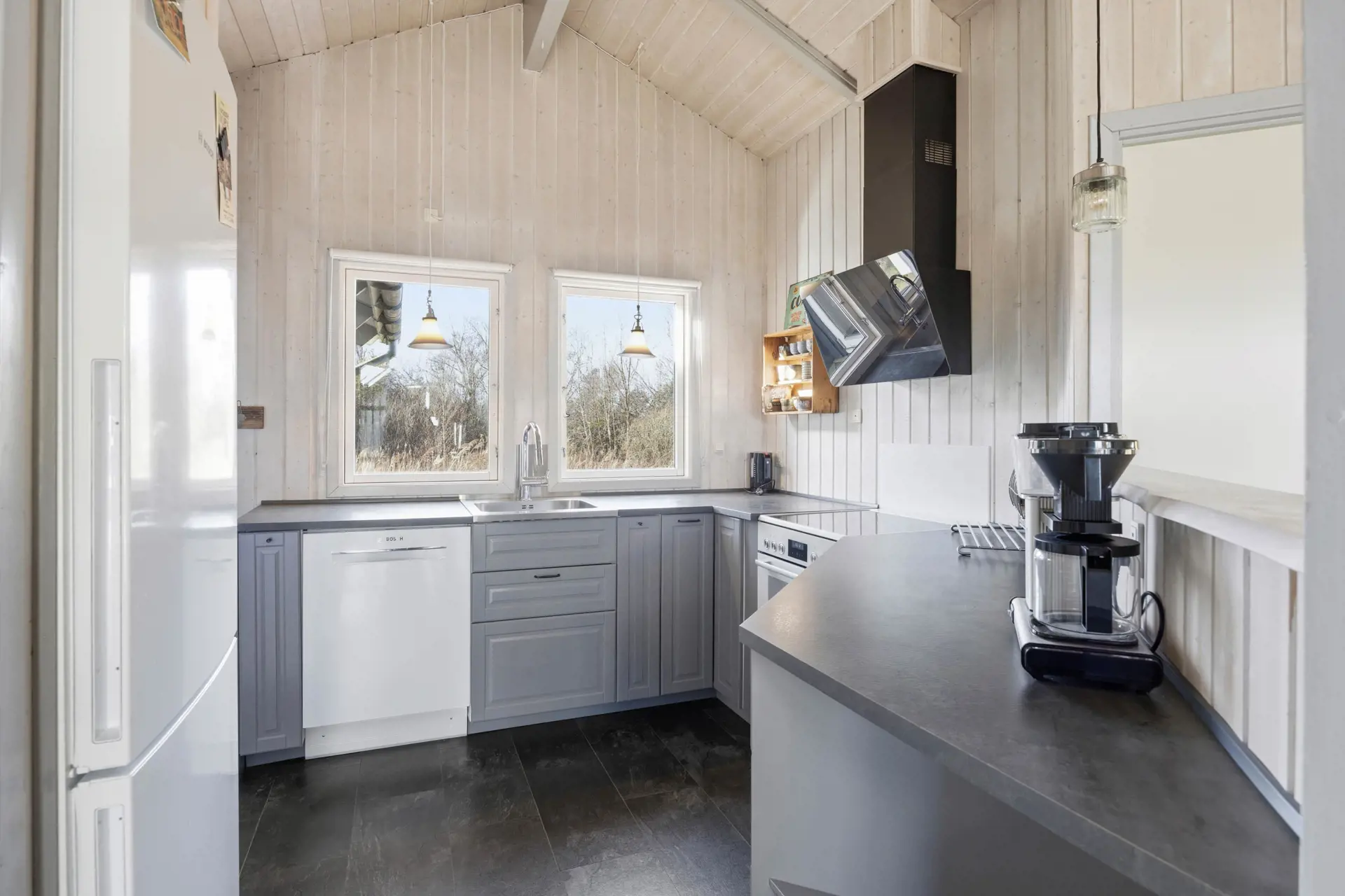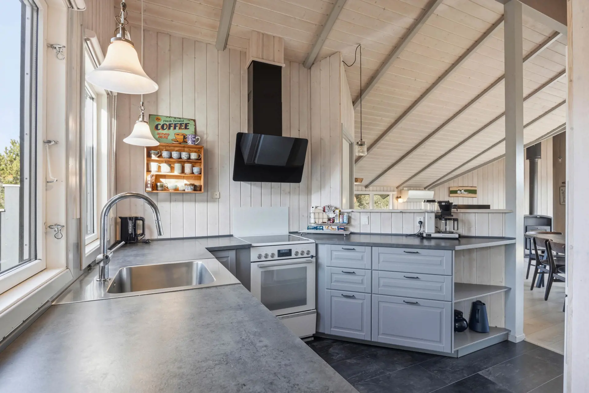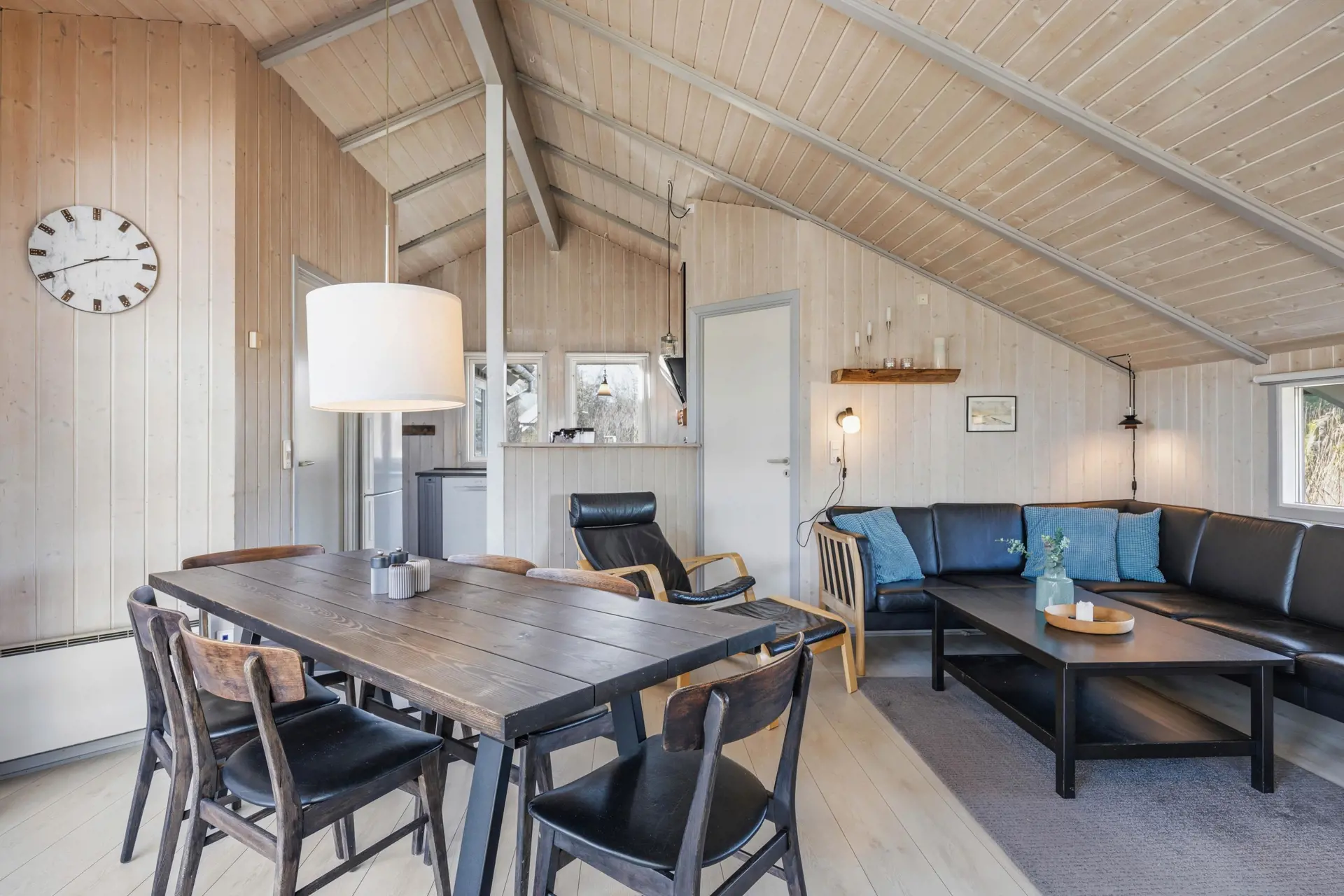 Das Ferienhaus verfügt über einen schönen Aufenthaltsraum, der Wohn- und Essbereich kombiniert und offen mit der voll ausgestatteten Küche verbunden ist. Zentral im Raum befindet sich der Kaminofen, sodass ihr ihn von allen Bereichen aus genießen könnt. Die Einrichtung ist in neutralen Farbtönen gehalten und durch die vielen Fenster strömt reichlich Tageslicht herein, was eine angenehme Atmosphäre schafft. Entspannt euch mit einem guten Buch, verbringt gemeinsame Zeit bei einem Brettspiel oder backt etwas Leckeres für den Nachmittagskaffee.