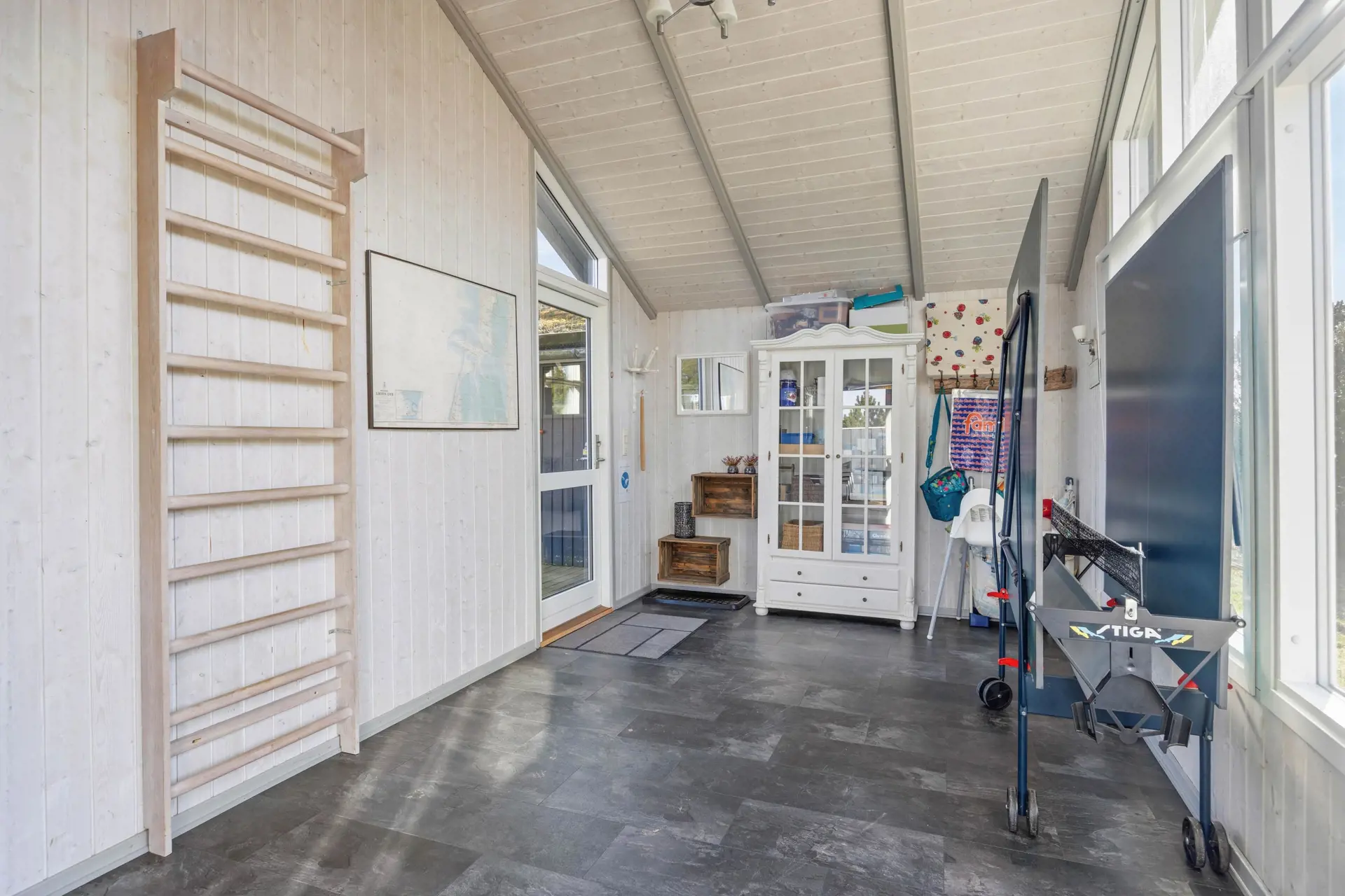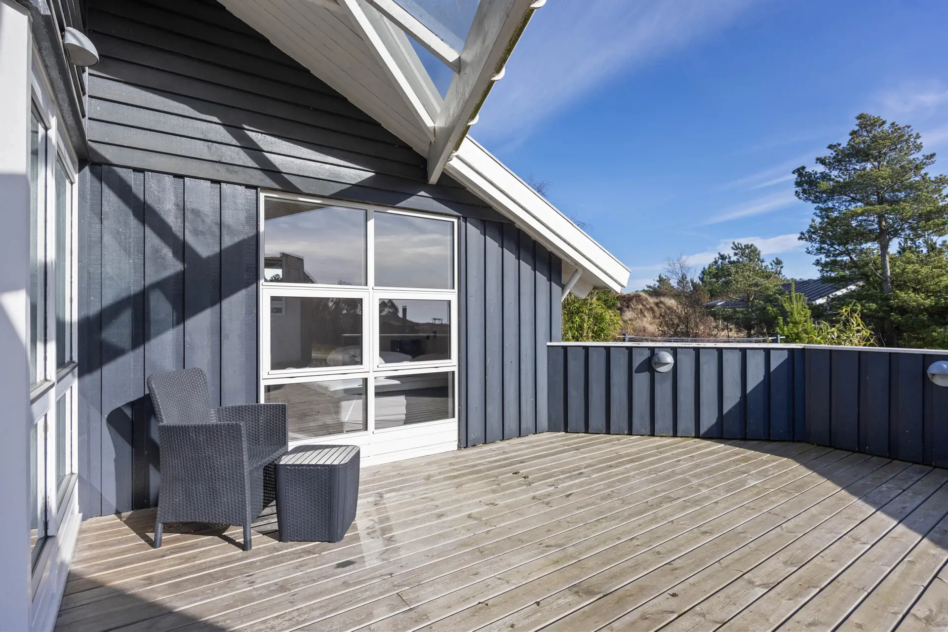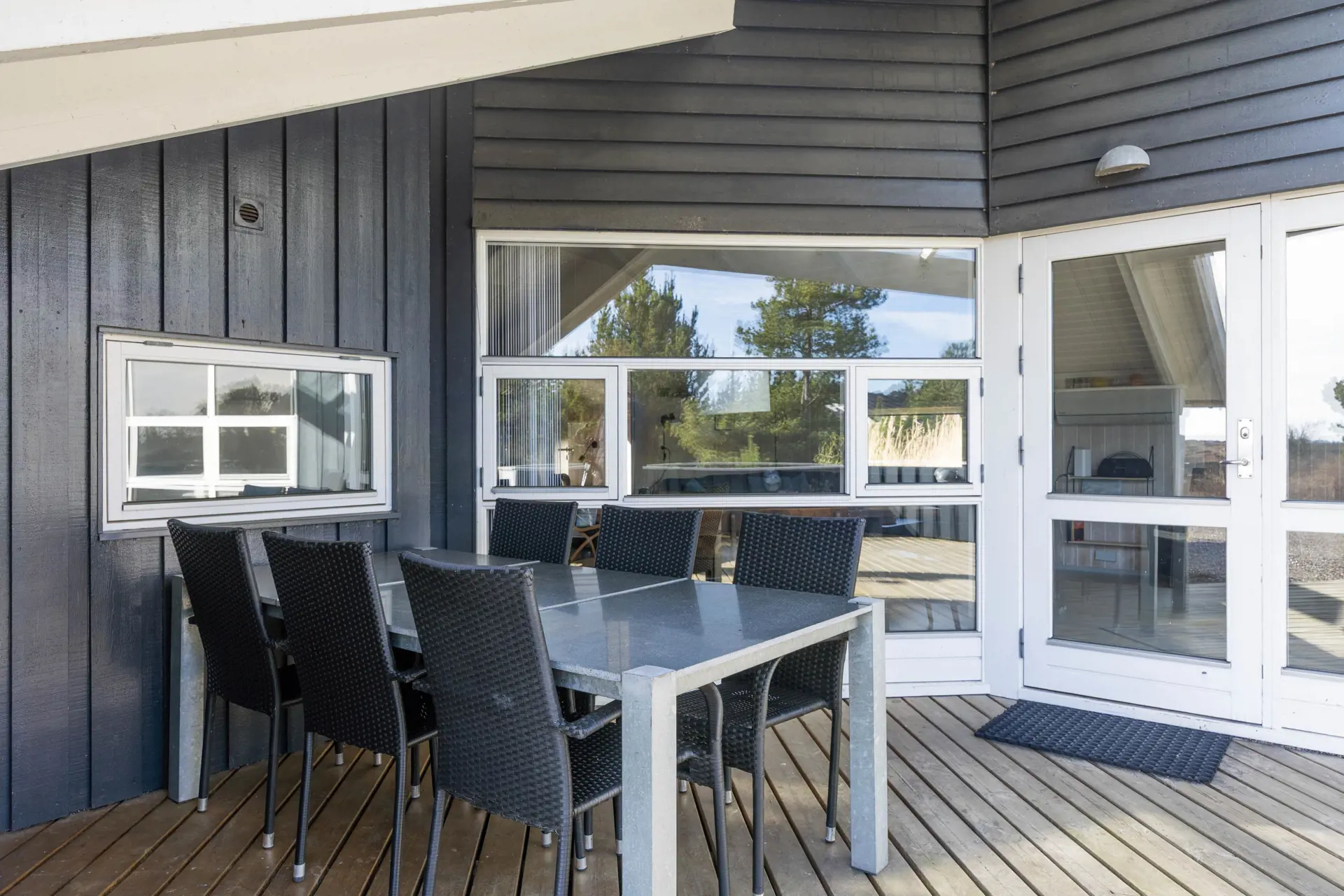 Ein besonders schöner Ort ist die geschlossene Terrasse auf der Ostseite des Hauses. Hier könnt ihr sonnige Tage in ruhiger und privater Atmosphäre genießen und in den Gartenmöbeln entspannen. Lasst den Tag mit einem köstlichen Grillgericht ausklingen und genießt den malerischen Sonnenuntergang am Strand, der nur 2.000 Meter von eurer Ferienadresse entfernt liegt.