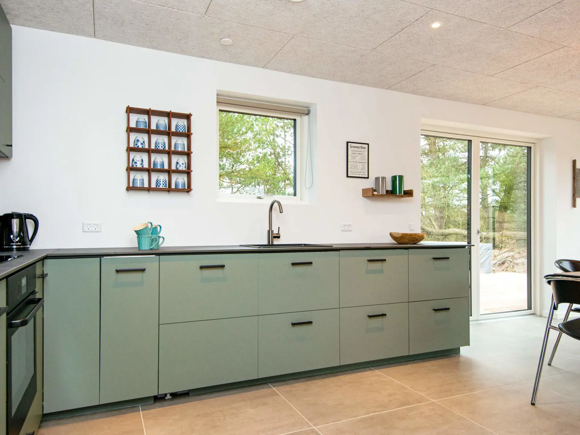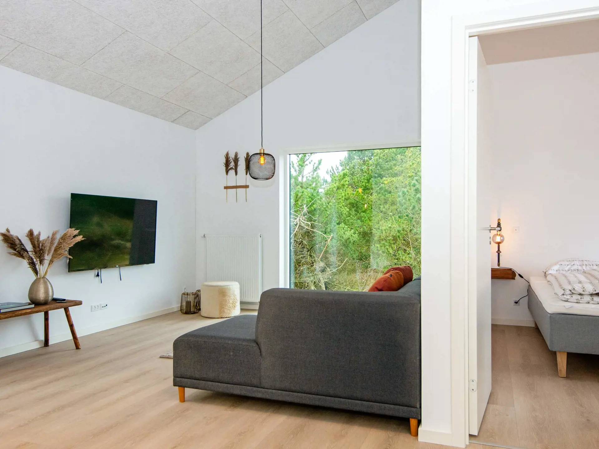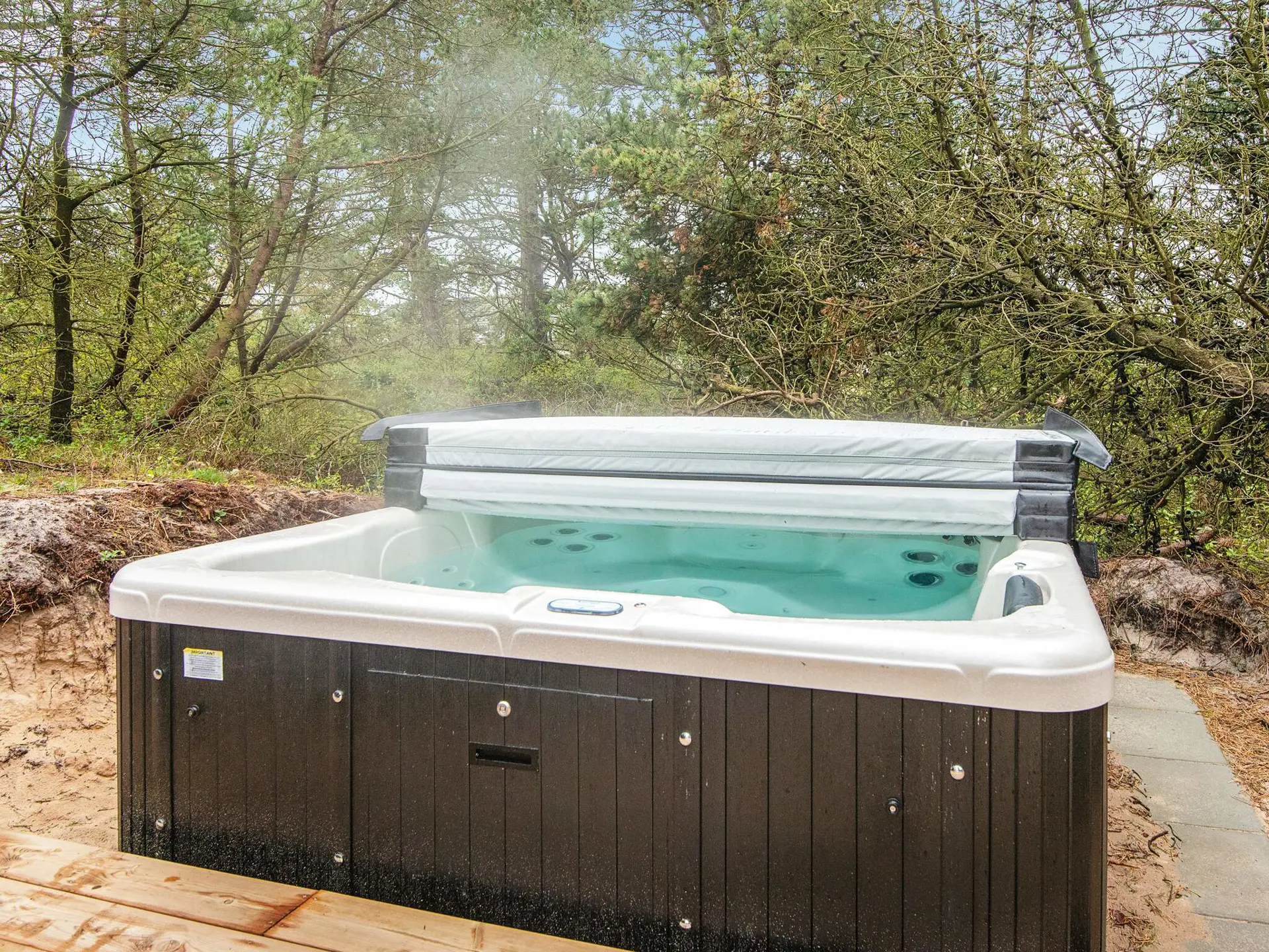 Das Ferienhaus auf hochwertigen Materialien ist mit modernem, komfortablem Mobiliar eingerichtet. Es gibt einen hellen Küchen-/Essbereich in offener Verbindung zum Wohnzimmer. Von hier aus gelangt man auf eine schöne, uneinsehbare Holzterrasse mit Grill und Gartenmöbeln, wo sich auch der ganzjährig nutzbare große Whirlpool des Hauses befindet.