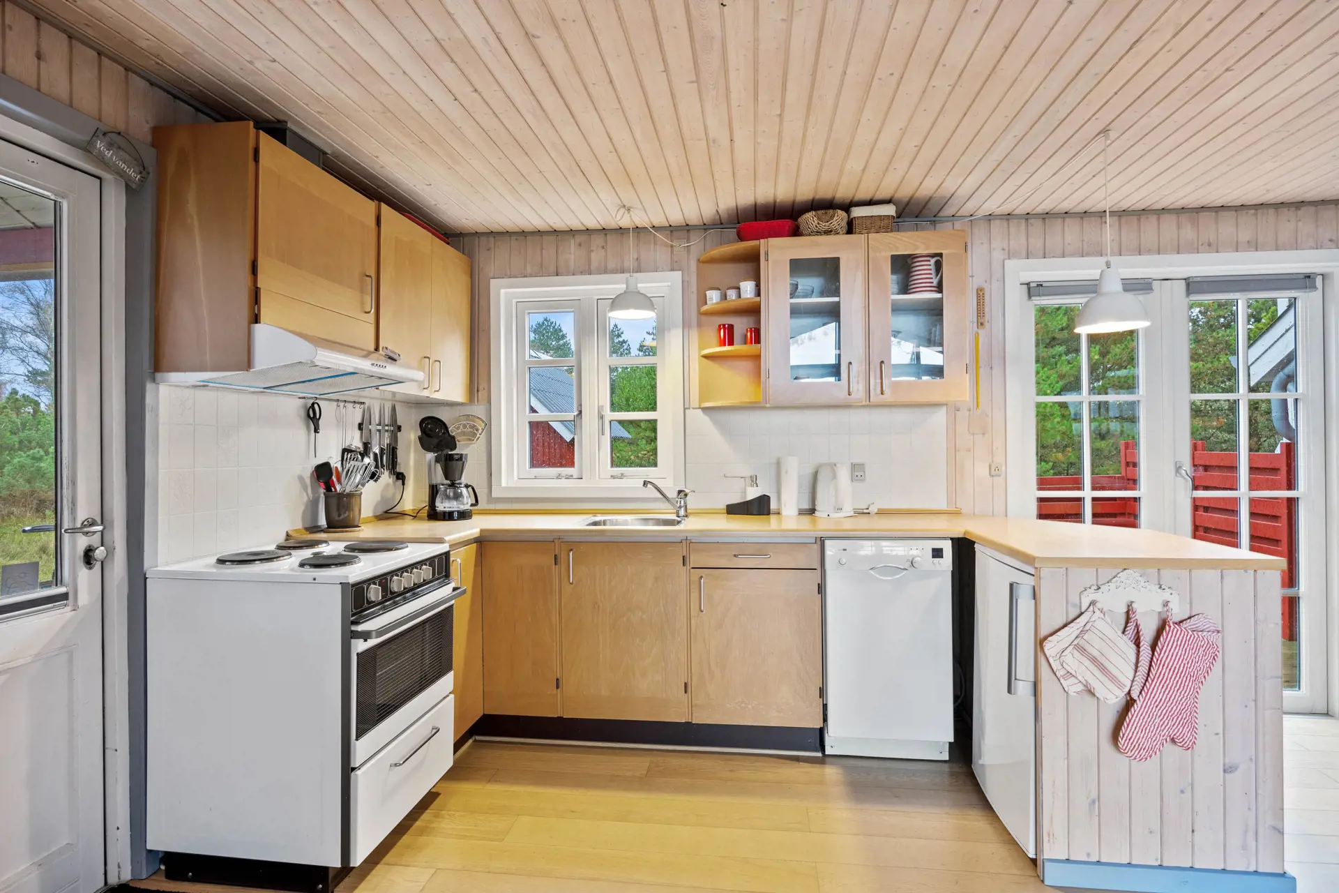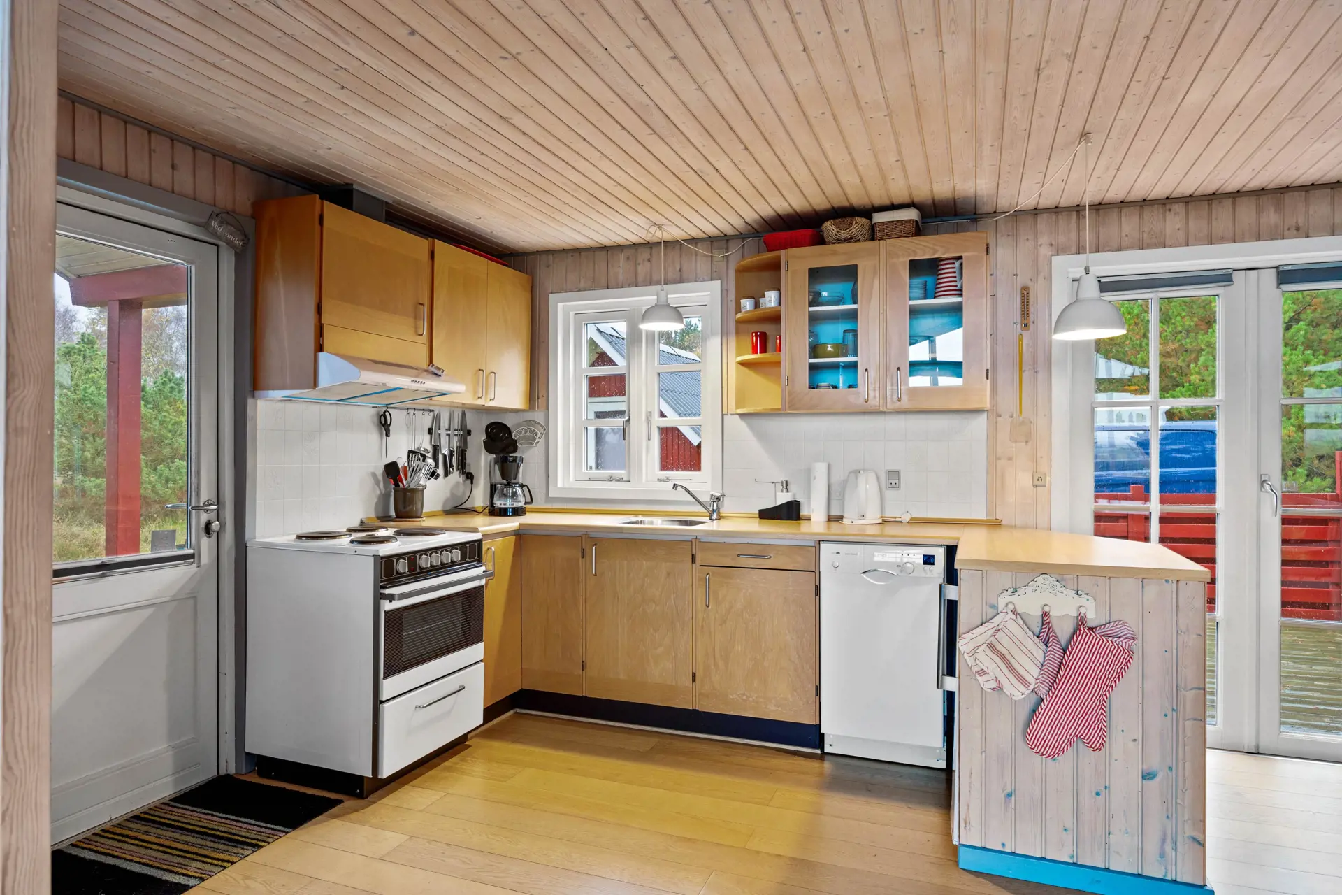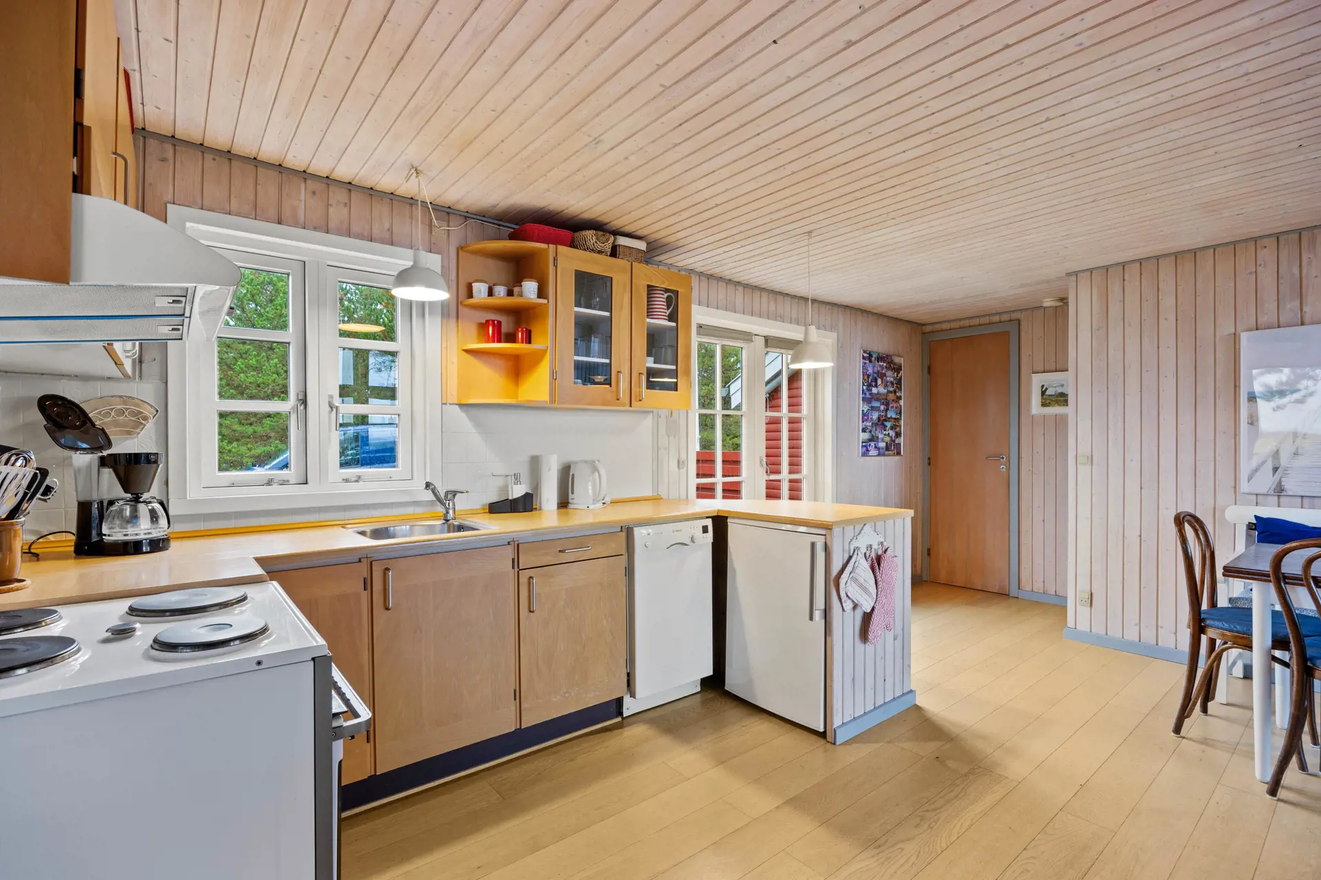 Gebaut 1952 und 2009 renoviert, verbindet das 62 m² große Haus klassischen Stil mit praktischer Ausstattung. Zwei Schlafzimmer bieten ein Doppelbett und ein Etagenbett. Der offene Wohn-Essbereich mit holzverkleideten Wänden schafft eine warme, entspannte Atmosphäre. Die Küche bietet neben der klassischen Ausstattung auch eine Spülmaschine sowie ein Gefrierfach im Kühlschrank. Eine Waschmaschine und ein Trockner stehen ebenfalls zur Verfügung. An kühlen Abenden sorgt der Kaminofen für wohlige Wärme, während die Terrasse zu entspannten Sonnenstunden und geselligen Grillabenden im Freien einlädt.