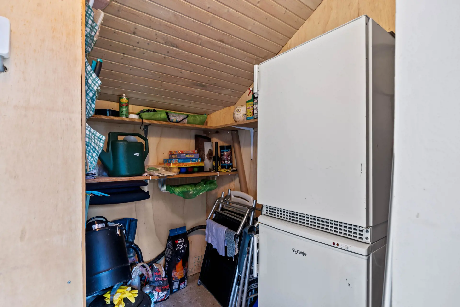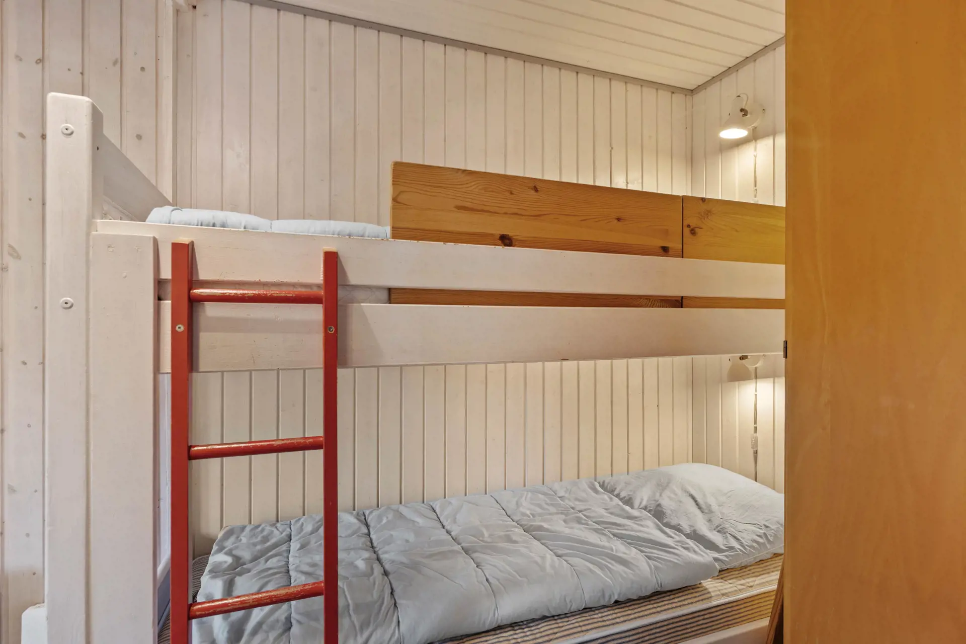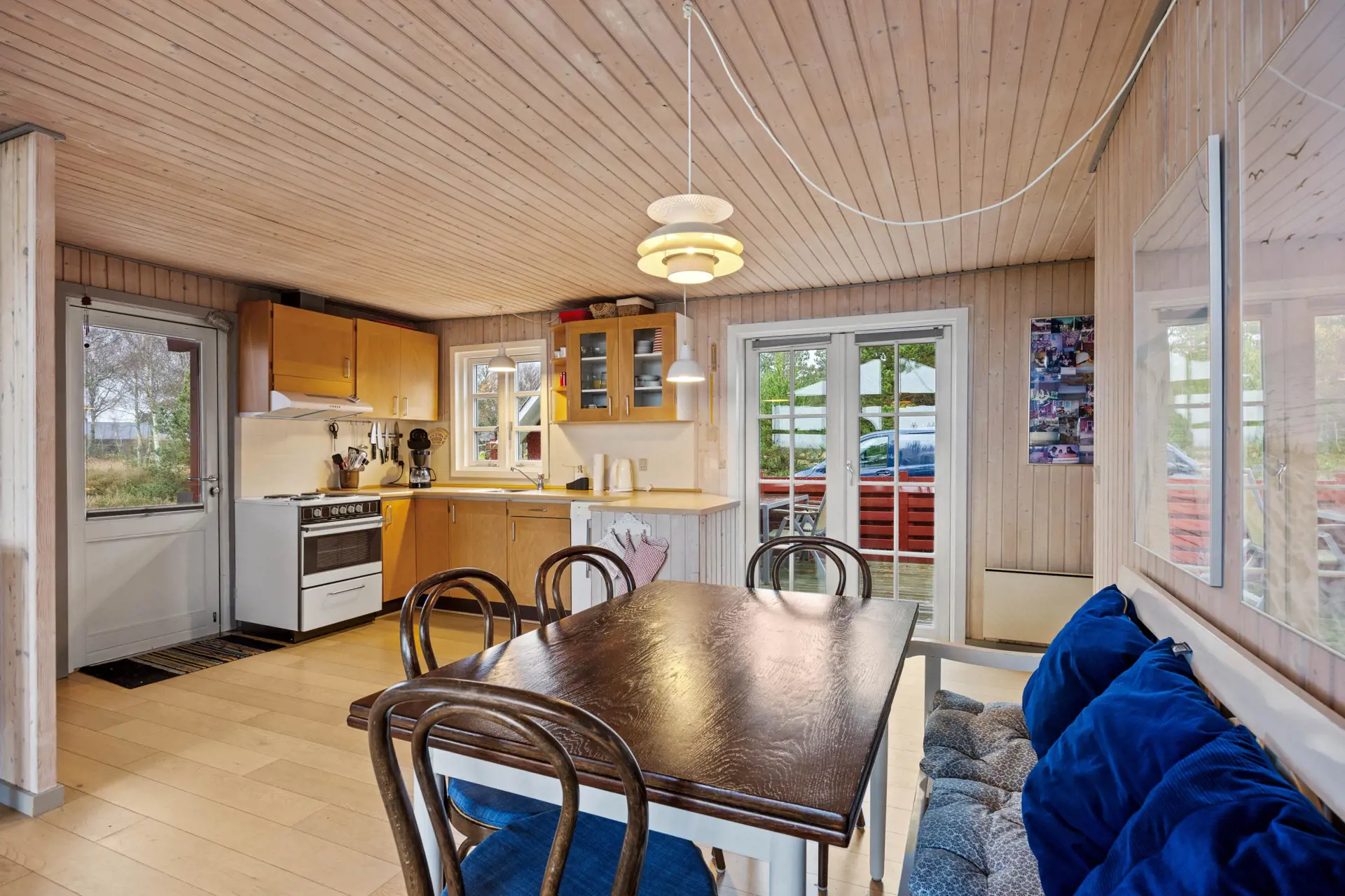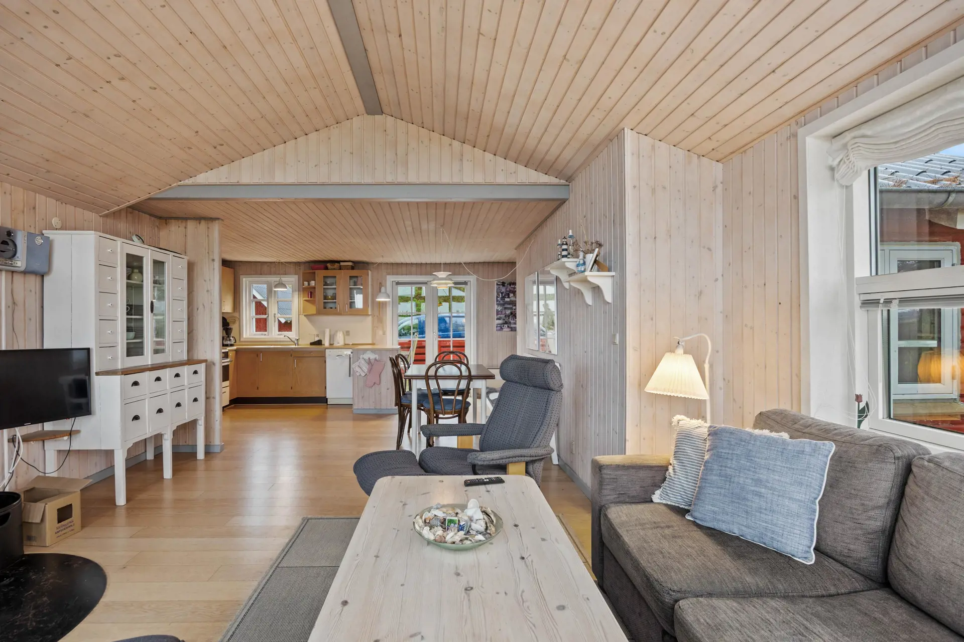 Gebaut 1952 und 2009 renoviert, verbindet das 62 m² große Haus klassischen Stil mit praktischer Ausstattung. Zwei Schlafzimmer bieten ein Doppelbett und ein Etagenbett. Der offene Wohn-Essbereich mit holzverkleideten Wänden schafft eine warme, entspannte Atmosphäre. Die Küche bietet neben der klassischen Ausstattung auch eine Spülmaschine sowie ein Gefrierfach im Kühlschrank. Eine Waschmaschine und ein Trockner stehen ebenfalls zur Verfügung. An kühlen Abenden sorgt der Kaminofen für wohlige Wärme, während die Terrasse zu entspannten Sonnenstunden und geselligen Grillabenden im Freien einlädt.