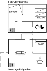 Die Schlafplätze verteilen sich auf 3 Schlafräume. 2 Schlafplätze in einem Doppelbett. 2 Schlafplätze in Einzelbetten. 2 Schlafplätze in einem Etagenbett.