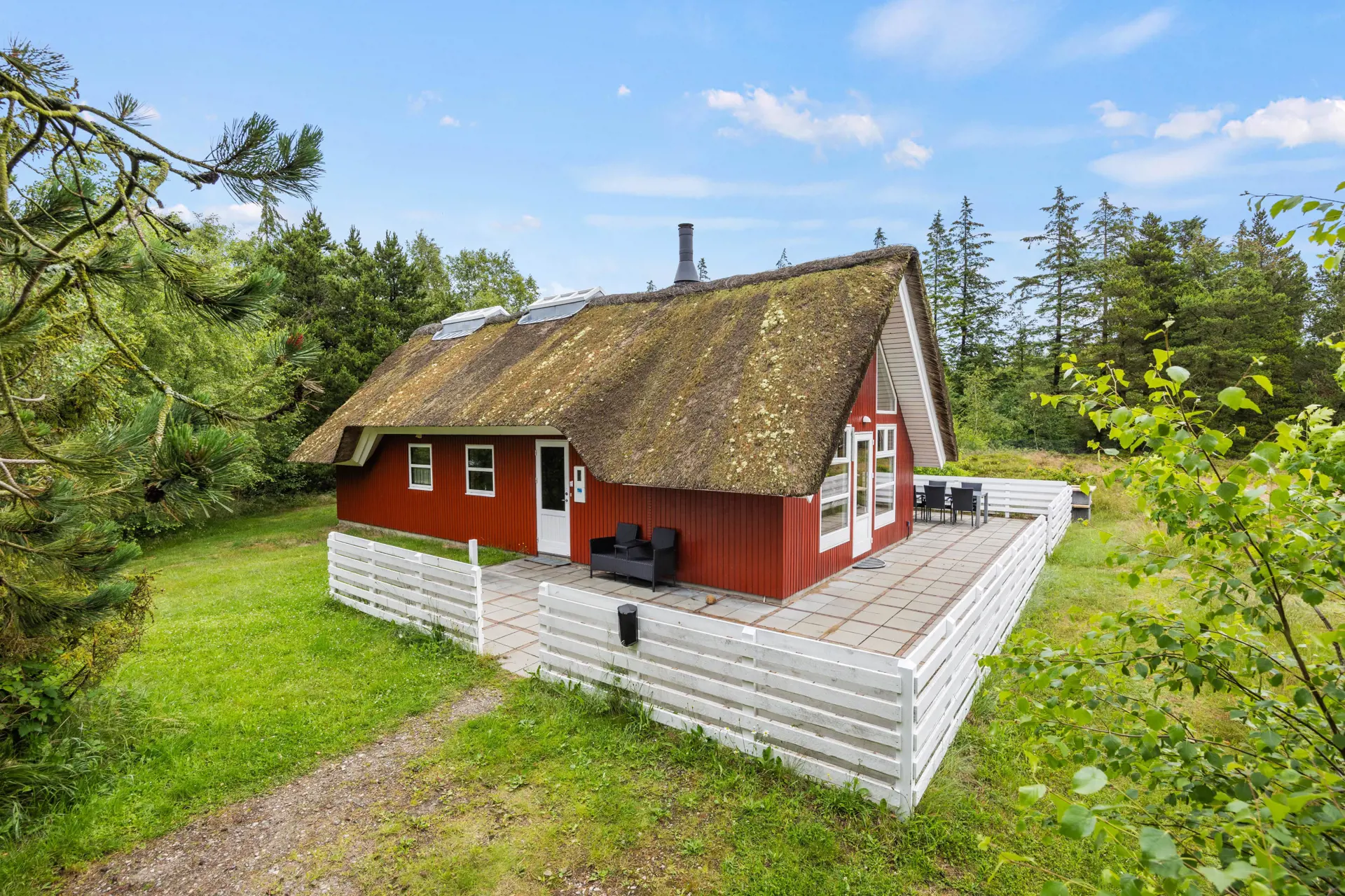 Das Haus liegt in sehr ruhiger Umgebung - auf einem Grundstück mit vor dem Wind schützenden Bäumen. Zum Haus gehört eine 65 m2 große in Richtung Osten, Süden und Westen gerichtete Terrasse mit Gartenmöbeln und Steingrill – hier könnt ihr den Sommer hindurch gemütliche Grillabende genießen.