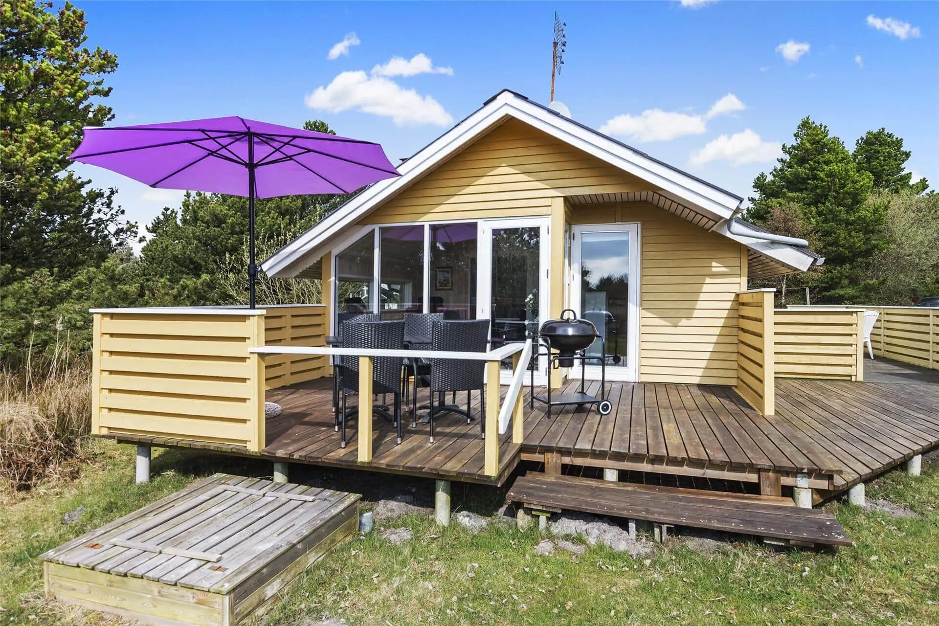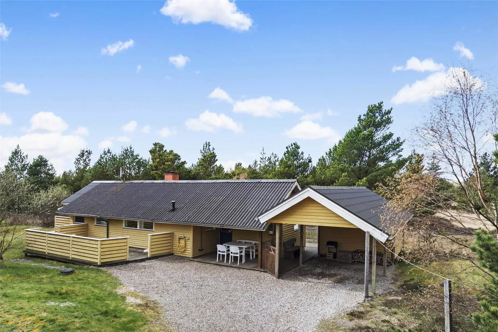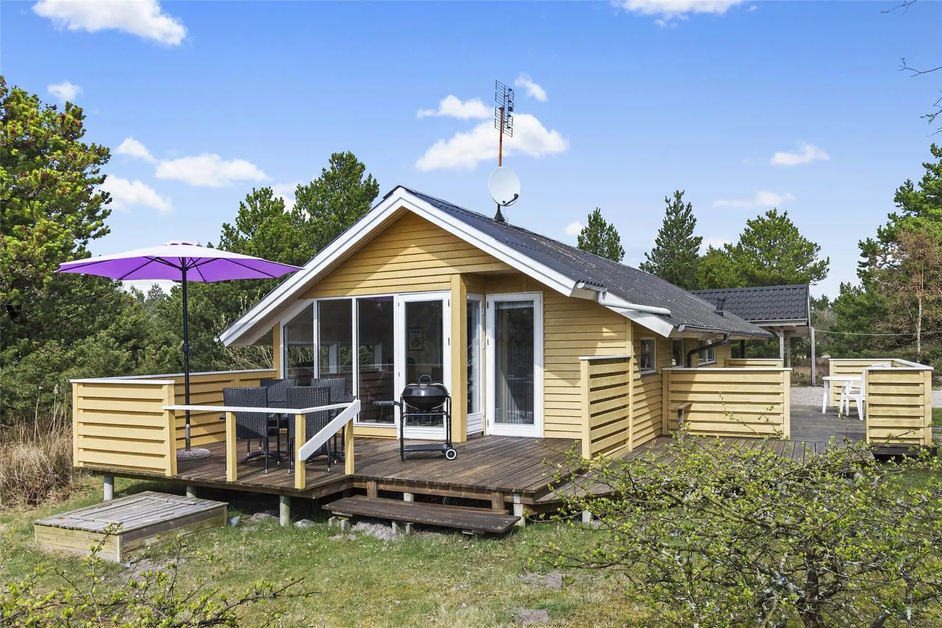 Da das Ferienhaus an einer kleinen Seitenstraße liegt, ist die Umgebung ruhig und der Verkehr ist sehr begrenzt. Als zusätzliches Plus liegt die wunderschöne Natur in unmittelbarer Nähe, denn von dem 2700 m² großen Grundstück aus schauen Sie direkt auf die weitläufige Landschaft. Den Ausblick können Sie unter anderem von einer der schönen Holzterrassen des Sommerhauses aus genießen, die mit ihrer Süd-West-Ausrichtung gut zum Sonnenbaden geeignet ist. Auf dem Grundstück befindet sich auch ein Carport, und um das Urlaubsleben noch mehr zu versüßen, stehen Ihnen ein Grill und bequeme Gartenmöbel zur Verfügung sowie Schaukeln und ein Sandkasten für die Kinder.
