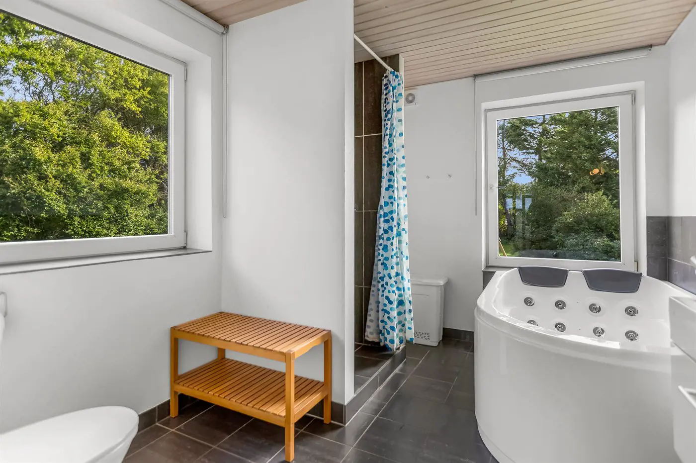 Es gibt 1 Badezimmer mit Fußbodenheizung, Duschnische und Toilette sowie 1 Badezimmer mit Badewanne und Toilette.