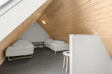 Im Obergeschoss befinden sich drei Schlafzimmer sowie ein weiteres Badezimmer mit Badewanne und Duschnische. Von einem der Schlafzimmer aus hast du Zugang zu einer großen Dachterrasse. Zudem gibt es ein geräumiges offenes Obergeschoss mit eigenem Fernseher. Der Großteil der Räume bietet einen wunderschönen Blick auf das Wattenmeer.