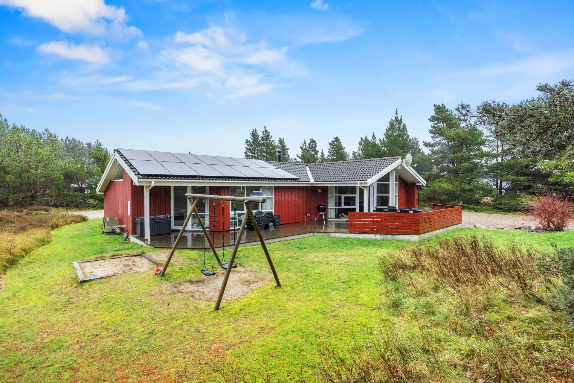 Euer Feriendomizil liegt eingebettet zwischen Büschen und Bäumen, auf einem ca. 2500 qm großen Naturgrundstück. Hier könnt ihr eure Privatsphäre auf der teils überdachten Terrasse genießen und euch in den bequemen Gartenmöbeln entspannen. Eure Kinder können derweil schaukeln, Trampolin springen und im Sandkasten spielen. Auch ein eigenes Beachvolleyballfeld steht euch für euer Familienturnier zur Verfügung. Zum Abschluss des Urlaubstages könnt ihr dann noch den Grill anwerfen und euch ein leckeres BBQ zubereiten, welches ihr dann an der frischen Luft genießen könnt. Am Ferienhaus steht euch zudem eine Lademöglichkeit für euer E-Auto zur Verfügung.