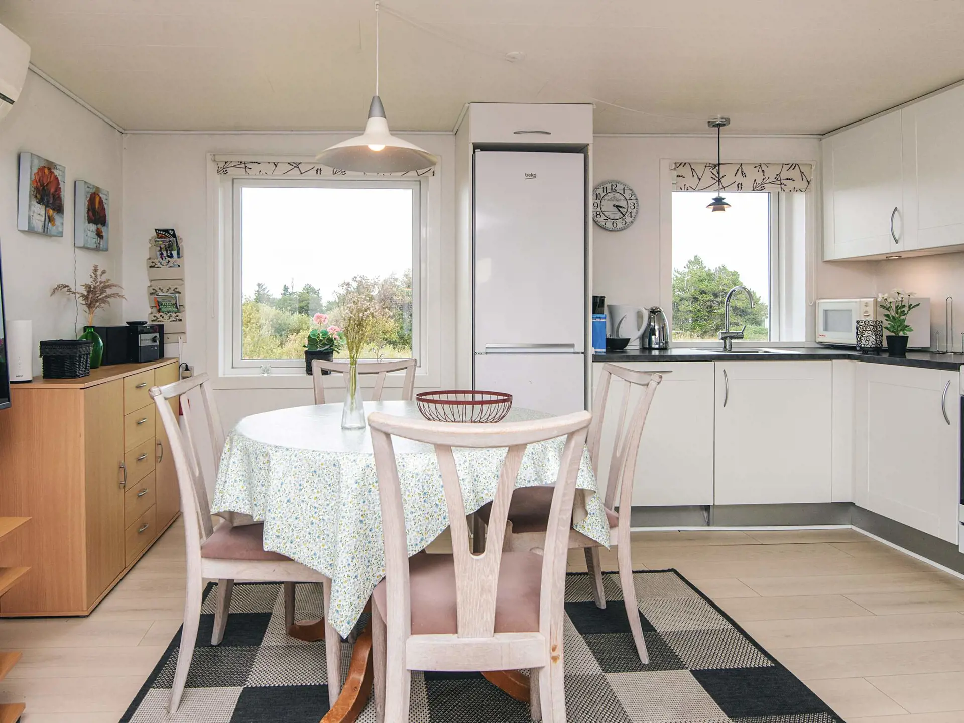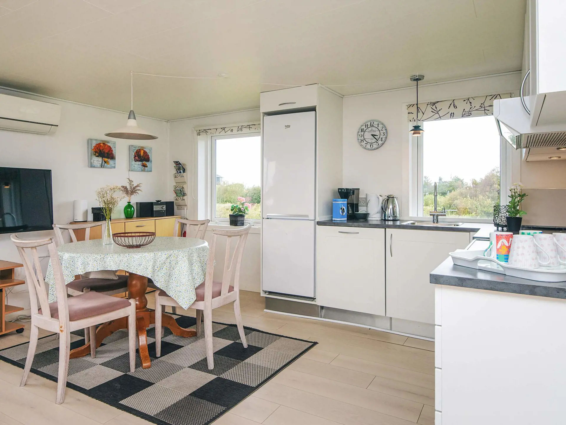 Dieses Ferienhaus liegt in der Nähe vom Strand. Es gibt u.a. ein Bad mit Dusche und Fußbodenheizung, einen kombinierten Küchen-/Aufenthaltsbereich mit Holzofen, drei Schlafzimmer und eine Glasveranda für gemütliche Stunden. Die Waschmaschine befindet sich in der Garage, die nicht für Autos gedacht ist. Die abgeschirmte Terrasse mit Gartenmöbeln lädt zu schönen Sonnenstunden ein und Kinder freuen sich über Schaukel und Sandkasten.