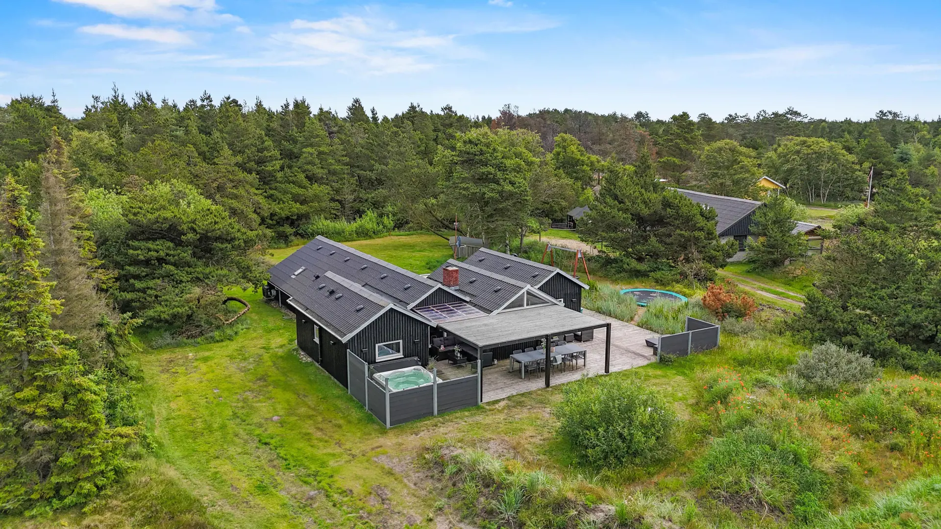 Vom Esszimmer habt ihr direkten Zugang zu einer schönen Holzterrasse mit Außenwhirlpool, Gartenmöbeln und einem Grill. Hier könnt ihr die Sonne genießen, das warme Wasser oder es euch auf der überdachten Terrasse im Loungesofa gemütlich machen. Macht es euch gemütlich mit einem kalten Getränk, während die Sonne langsam untergeht und die Sterne an den Himmel ziehen.