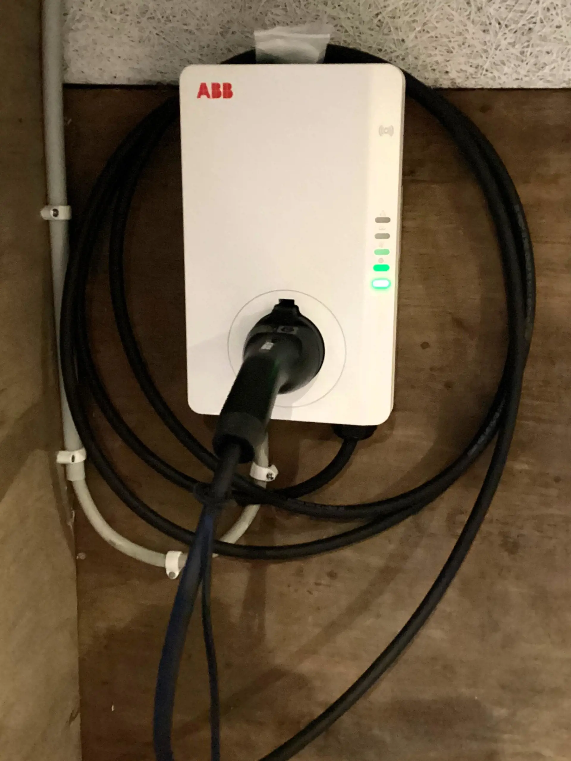 Am Haus ist außerdem eine Ladestation für Elektrofahrzeuge installiert. Es handelt sich um eine ABB-Ladestation mit fest installiertem Ladekabel, die ihr während eures Aufenthalts frei nutzen köt.