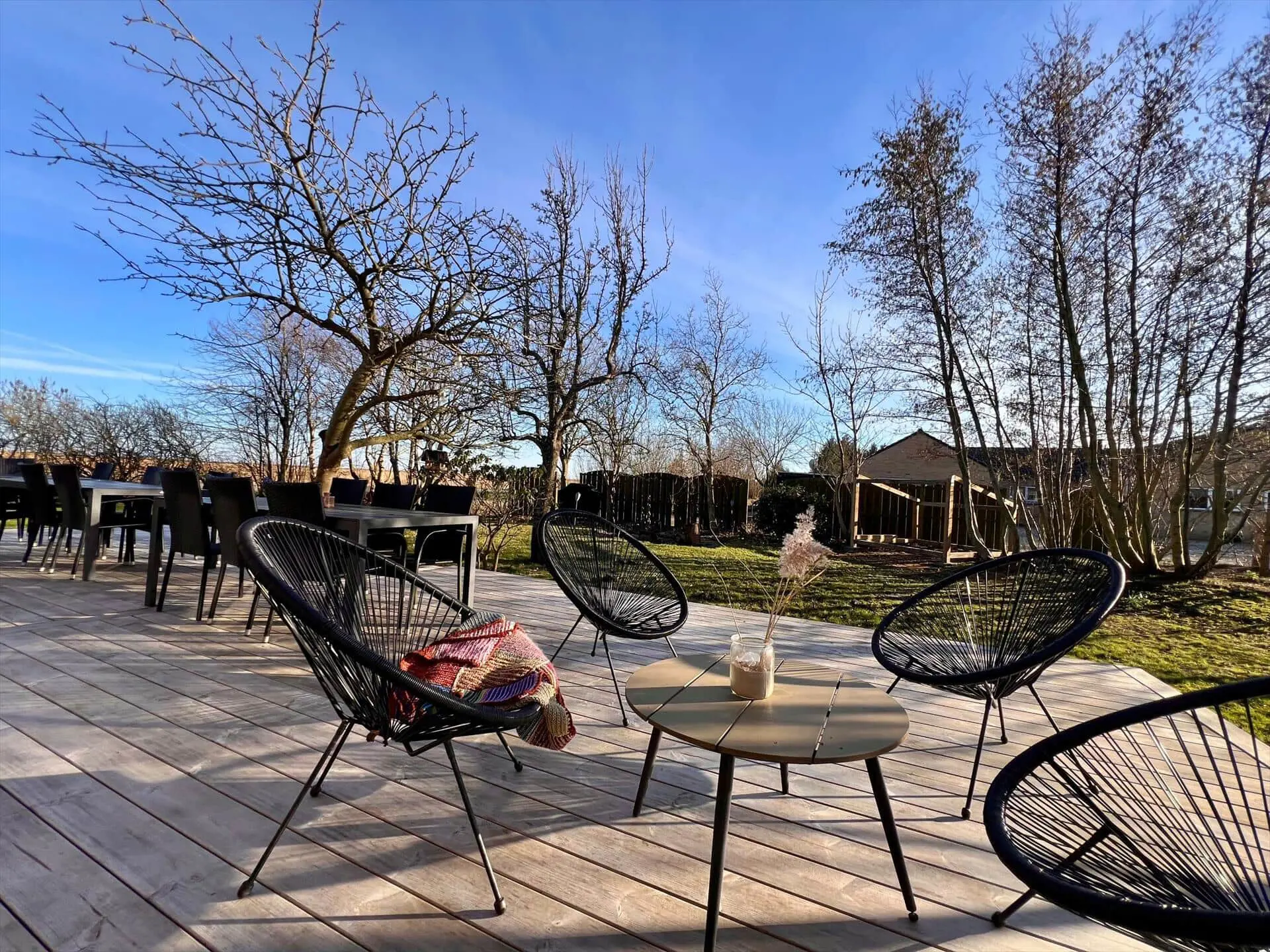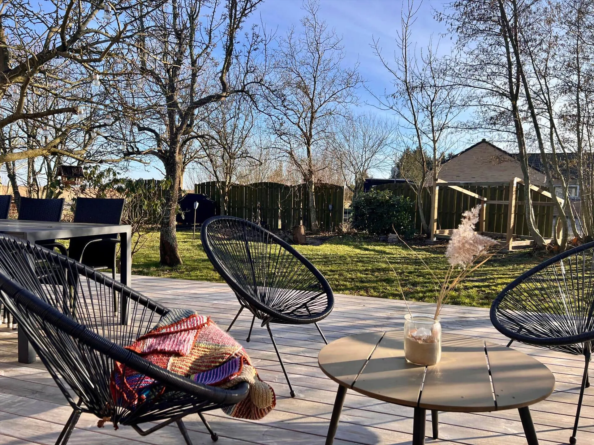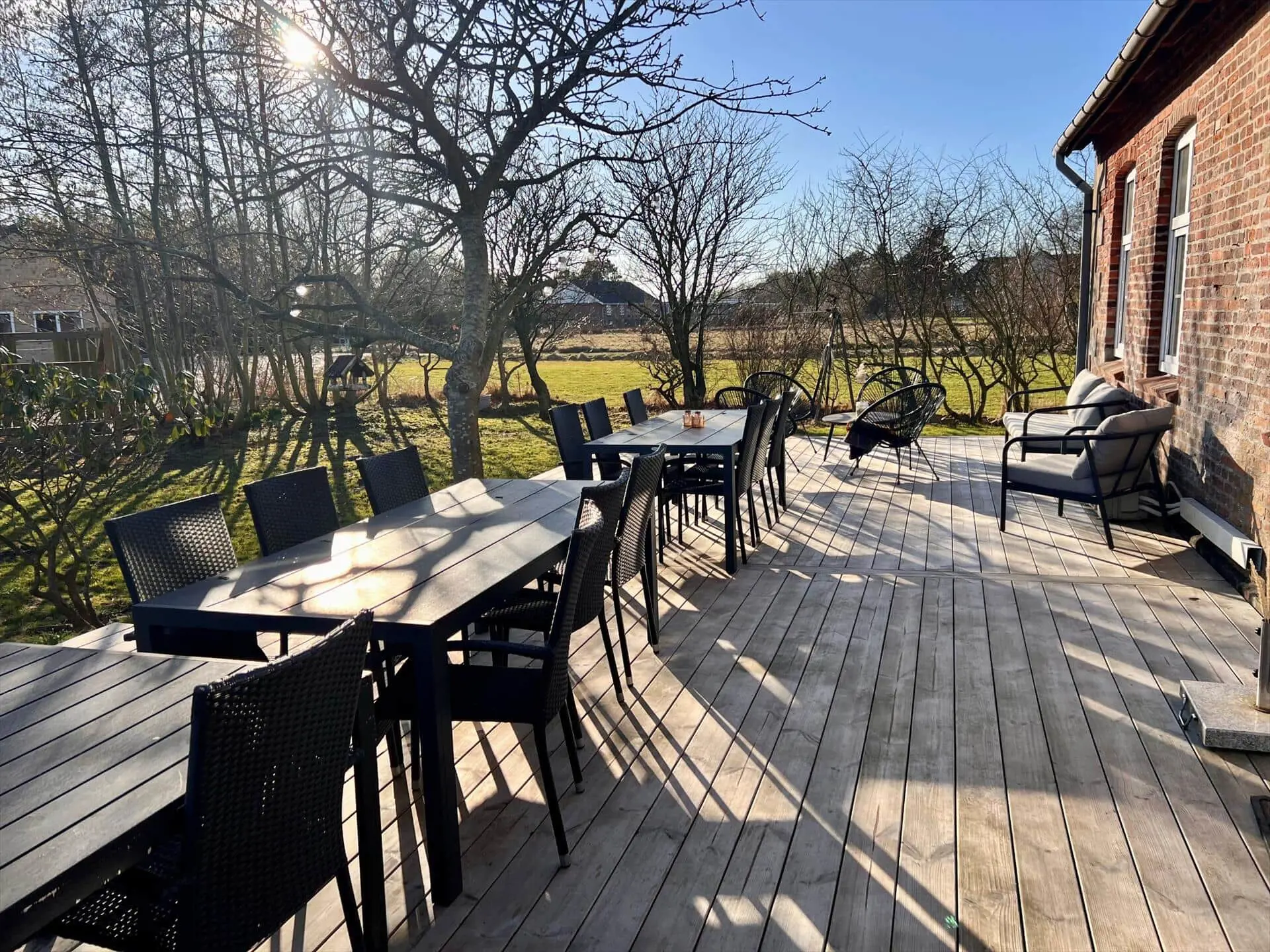 Rund um das Anwesen gibt es mehrere gute Terrassen zur Auswahl. Wenn du also eine entspannende Pause in der Sonne einlegen oder an einem hellen Sommerabend draußen sitzen möchtest, gibt es mehrere Möglichkeiten. Auf einer Terrasse gibt es einen Grill, den du natürlich fleißig nutzen kannst, wenn du Würstchen, Maiskolben oder andere frisch gegrillte Köstlichkeiten liebst. Auf dem geschotterten Hof können problemlos mehrere Autos geparkt werden, und außerdem besteht die Möglichkeit, Elektroautos aufzuladen. Die Rasenflächen auf dem großen Naturgelände laden zum Spielen, Entspannen und Ballspielen ein. Für die Kleinsten gibt es Schaukeln und einen Sandkasten, und vielleicht gelingt es den Jüngsten ja sogar, die Erwachsenen zu einem gemeinsamen Fußballspiel herauszufordern.