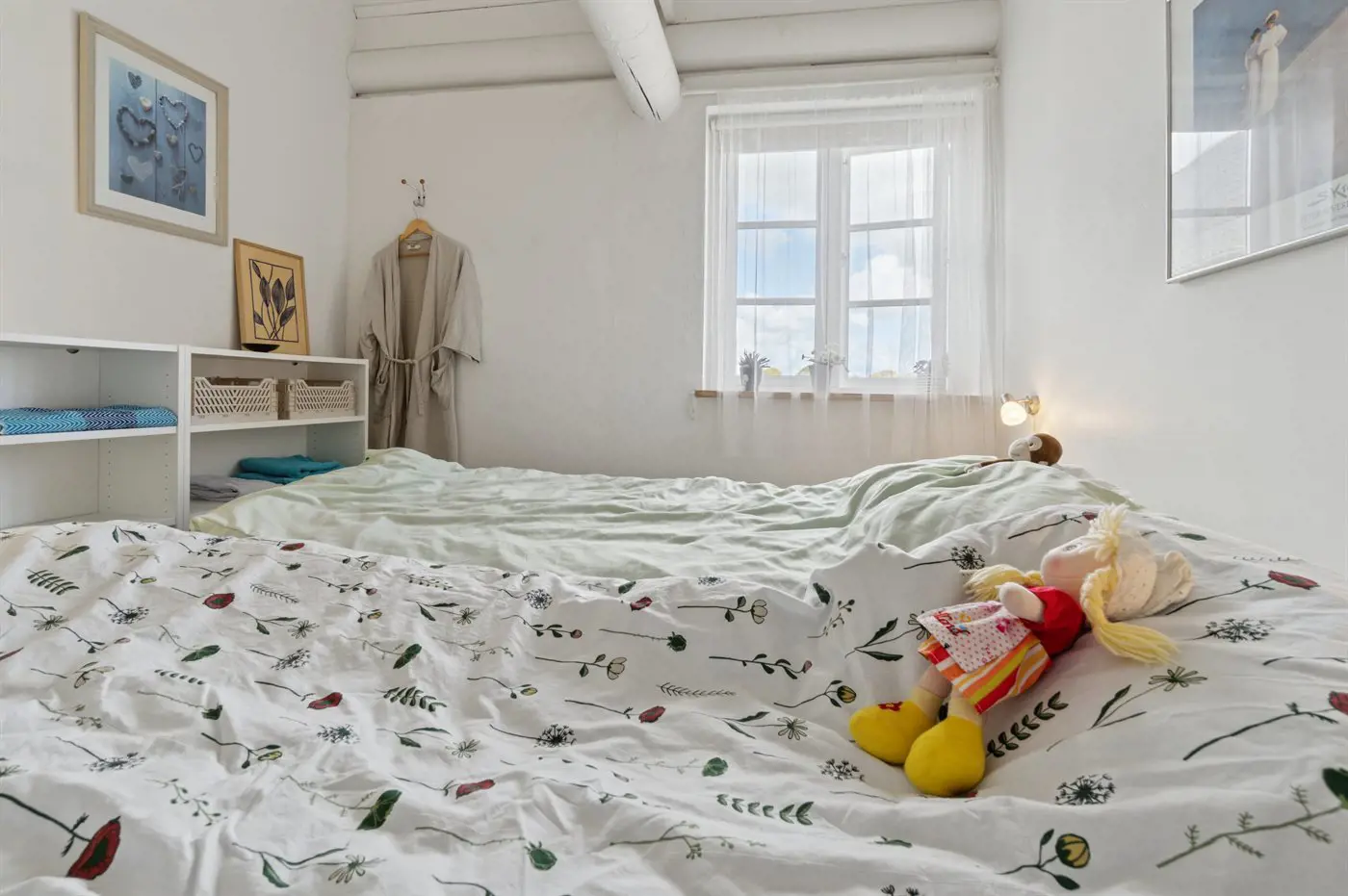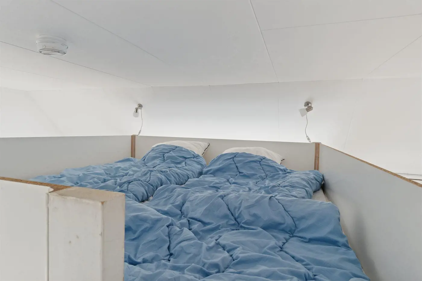 Es gibt einen Schlafraum. 2 Schlafplätze in einem Doppelbett. 2 Schlafplätze auf Matratzen. 2 von diesen Schlafplätzen befinden sich im offenen Obergeschoss.