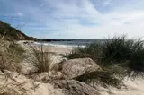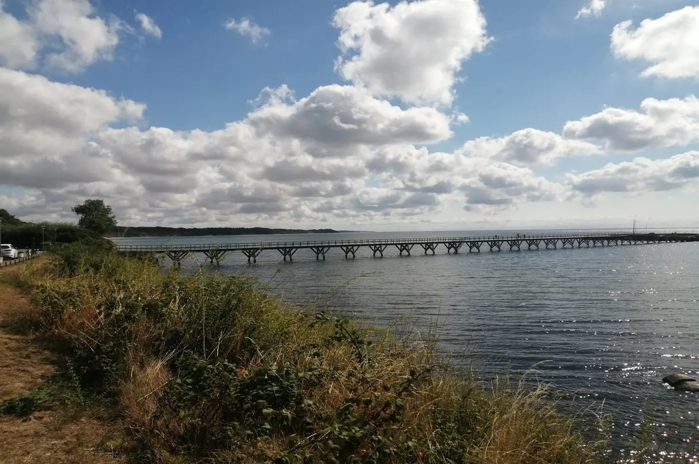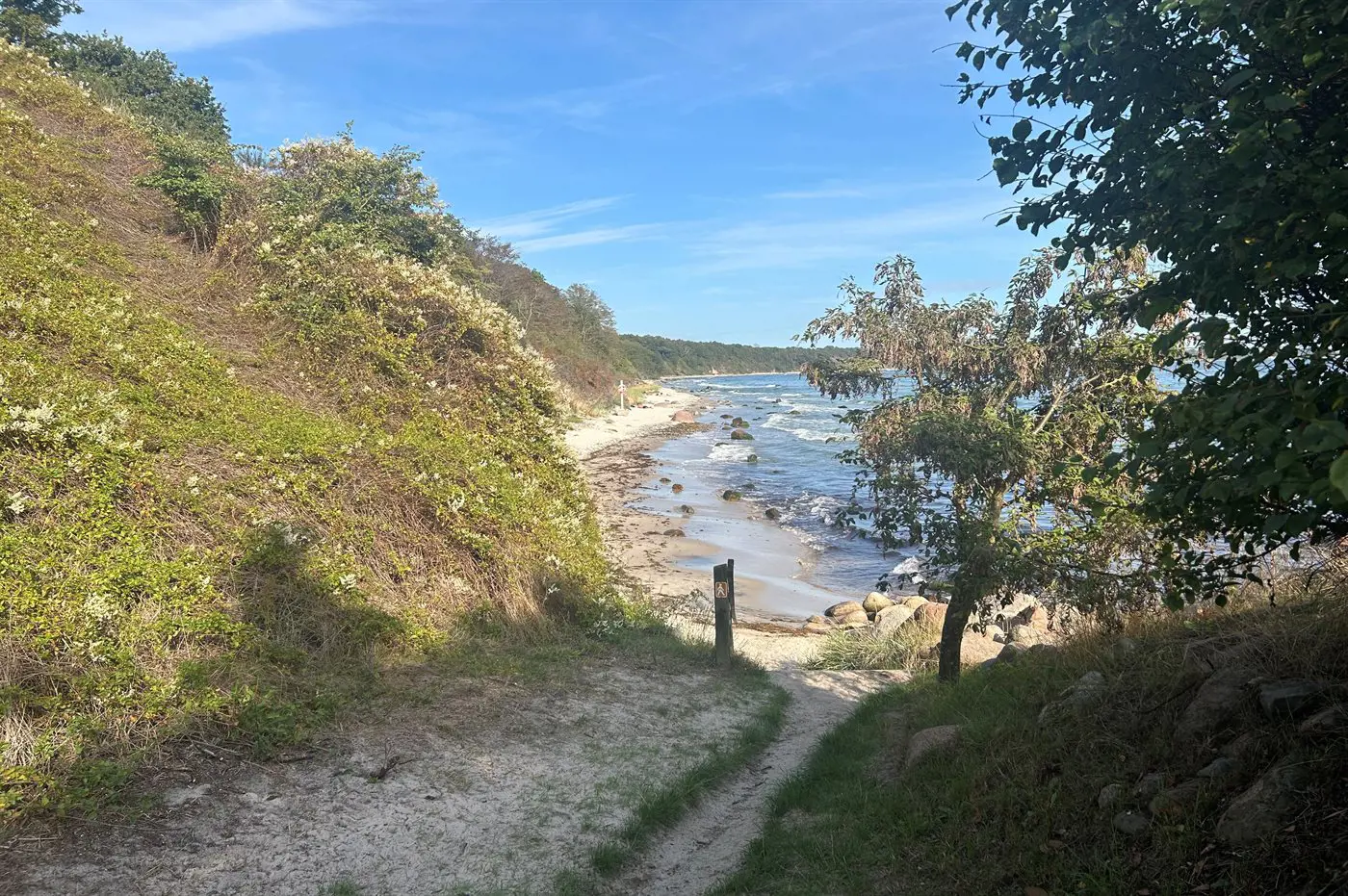 Die Küste bei Arnager hat stellenweise einen schmalen Sandstrand. Etwas weiter findest du jedoch einen nahezu ungestörten Sandstrand unterhalb der Klippe, die Schutz von der Landseite bietet – so kannst du das Meer, die Wellen und vielleicht sogar das Leben im kleinen Hafen aus der Ferne genießen.