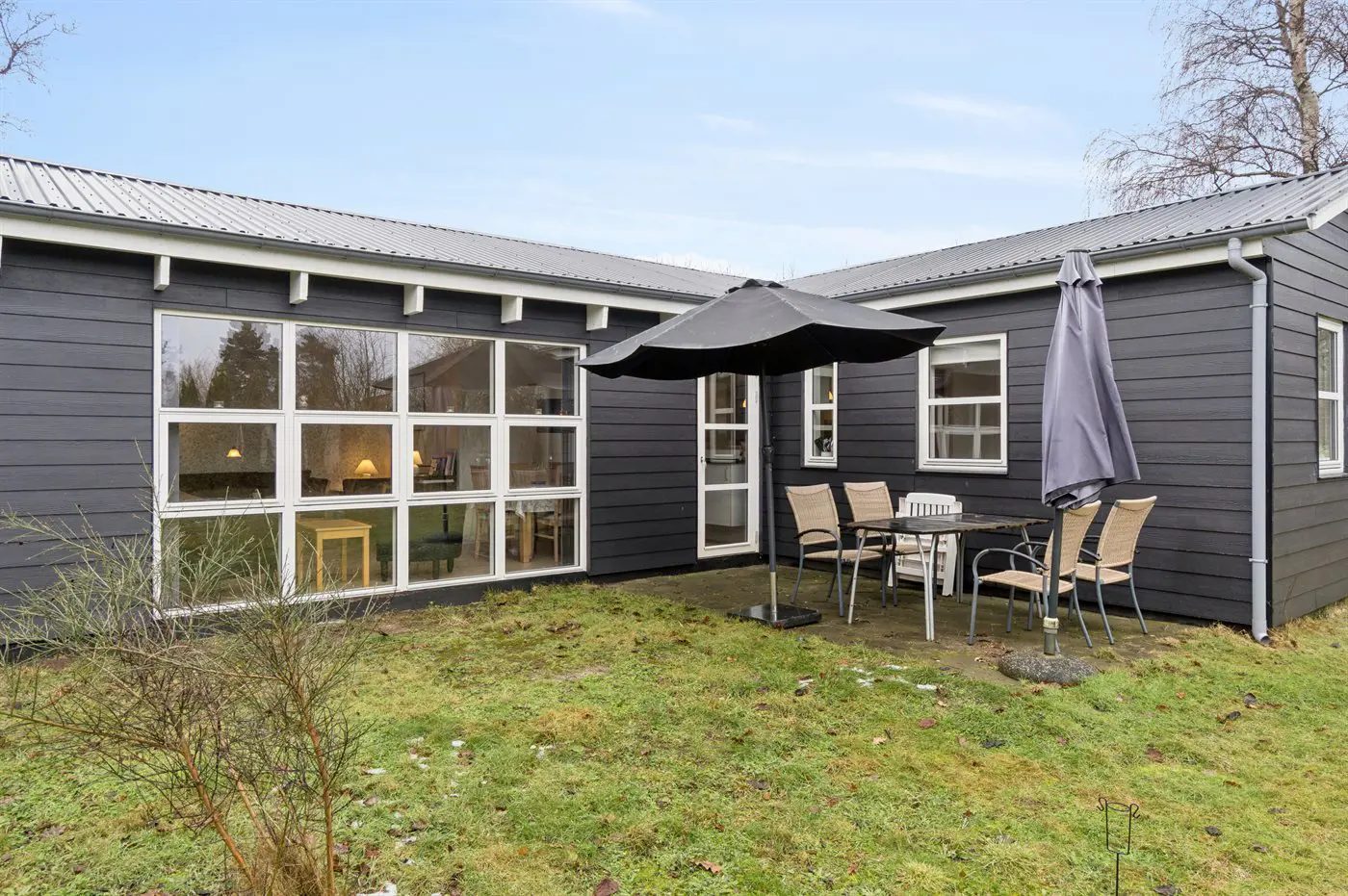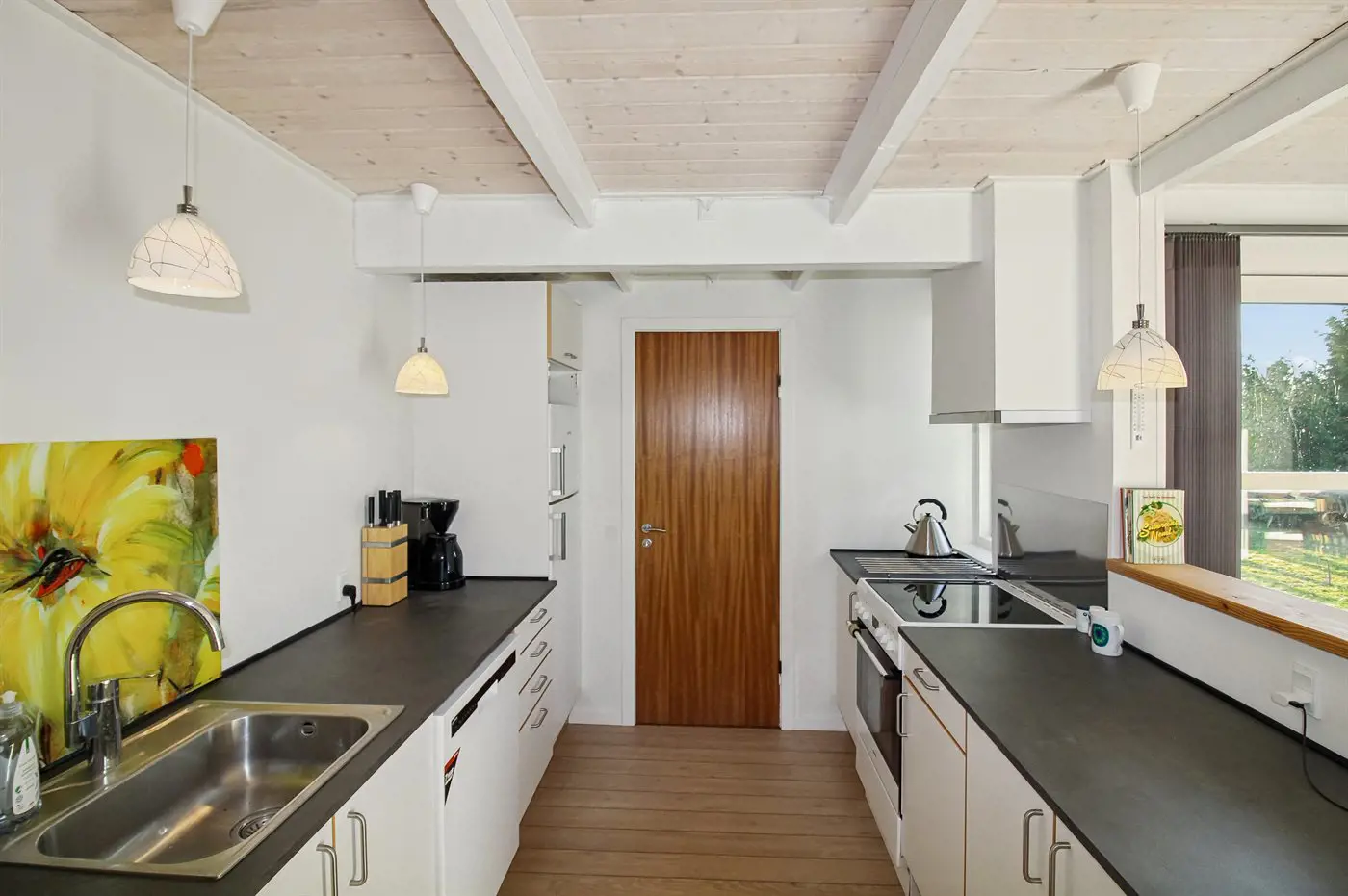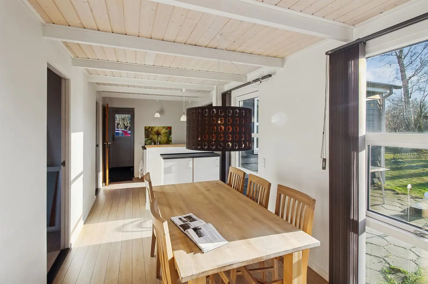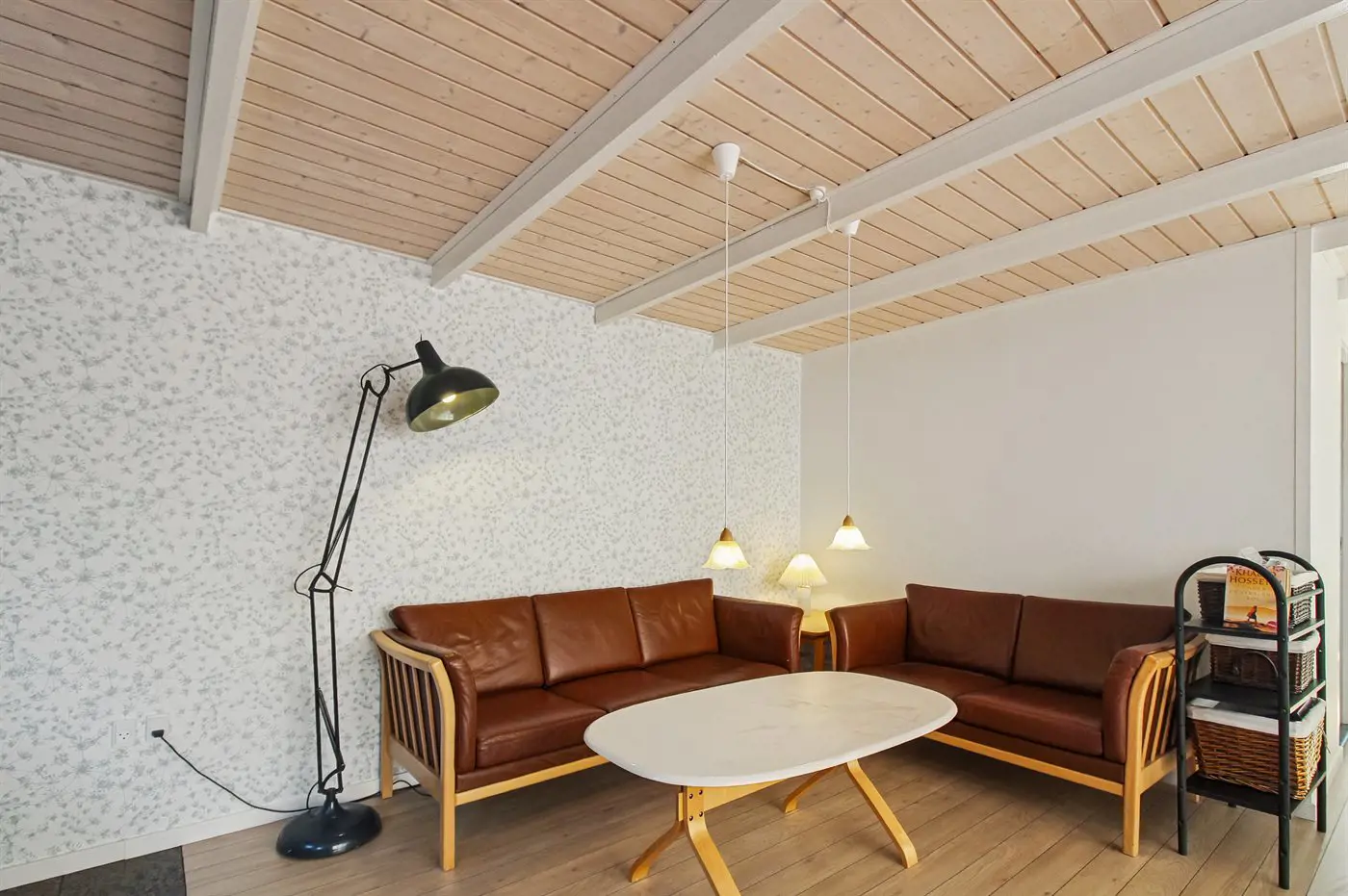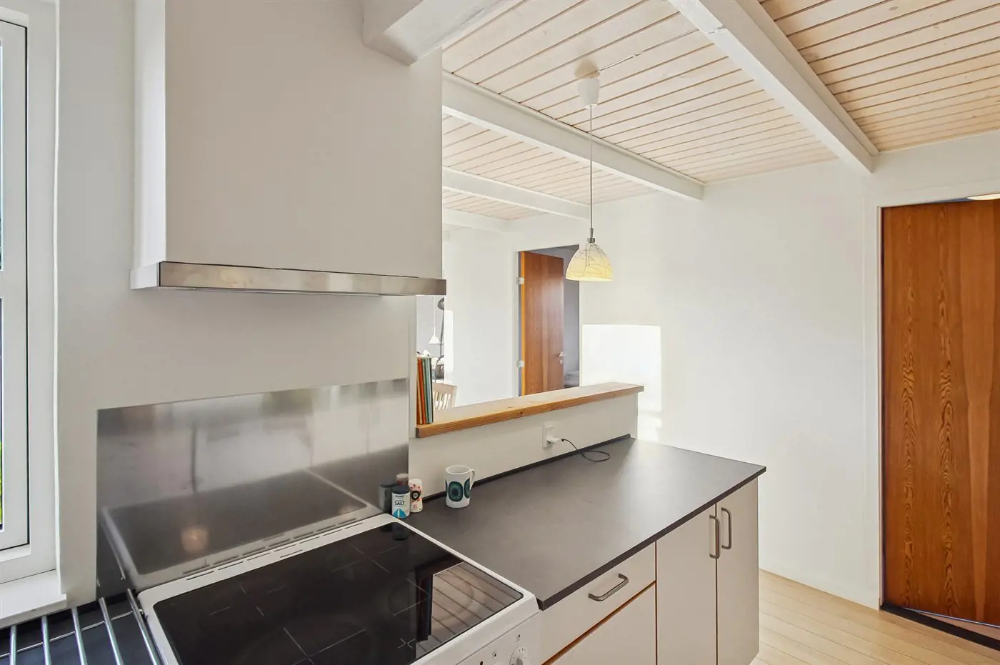 Das große Wohnzimmer des Ferienhauses hat einen direkten Zugang zur Steinterrasse, wo du – wenn das Wetter es zulässt – dein Mittagessen genießen kannst. Innen erwarten dich helle Wände, aufgehellte Holzdecken und ein schöner Holzfußboden. Neben der Wärmepumpe kannst du auch den Kaminofen nutzen, um die große Wohnküche zu beheizen. Zusätzlich zu den drei Schlafzimmern gibt es einen Hauswirtschaftsraum, der mit dem Eingangsbereich kombiniert ist. Ein separater kleiner Raum mit Waschmaschine ist ebenfalls vorhanden. Das Badezimmer ist gepflegt und modern.