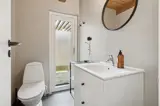 Es gibt 1 Badezimmer mit Duschnische und 2 Toiletten, davon 1 Gästetoilette. Fußbodenheizung in 1 Badezimmer.