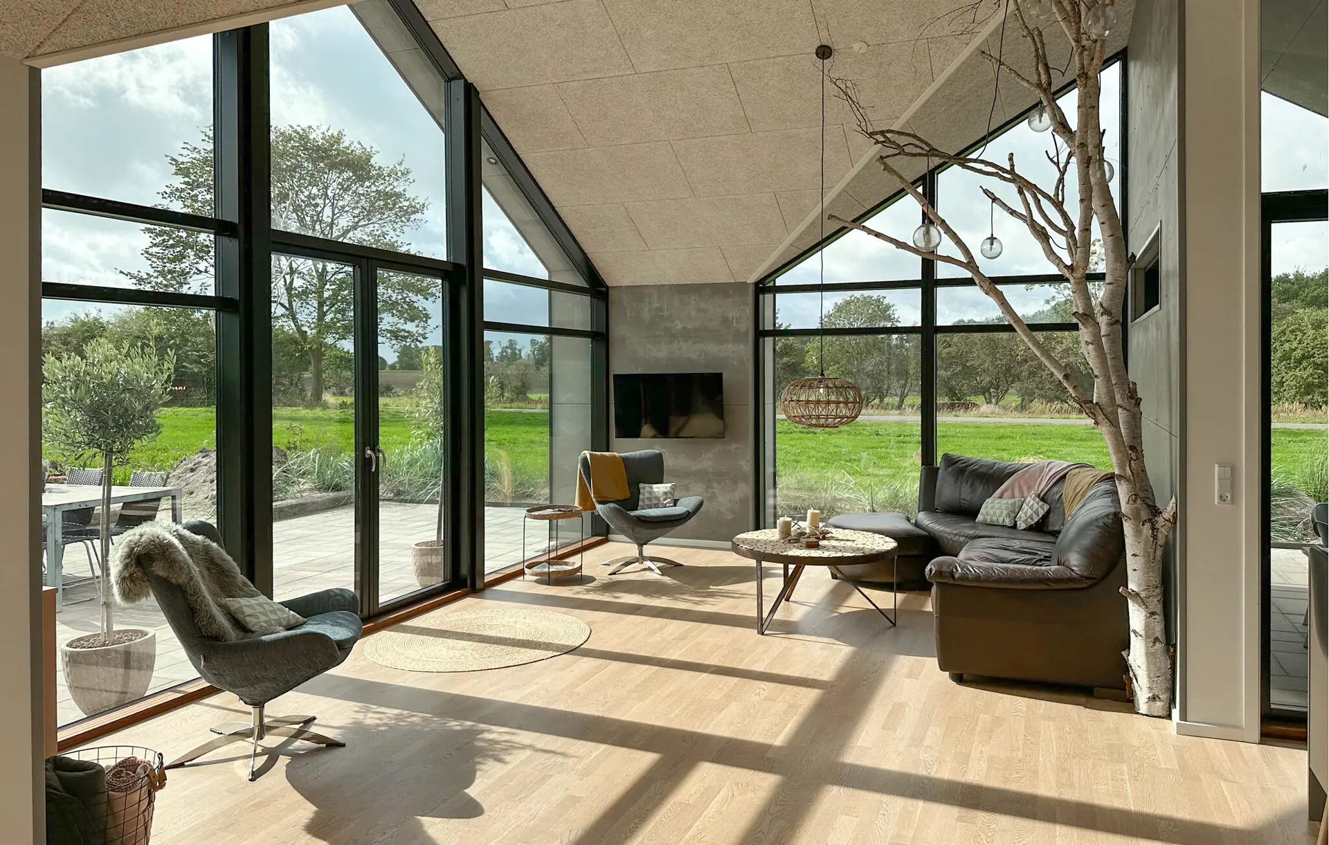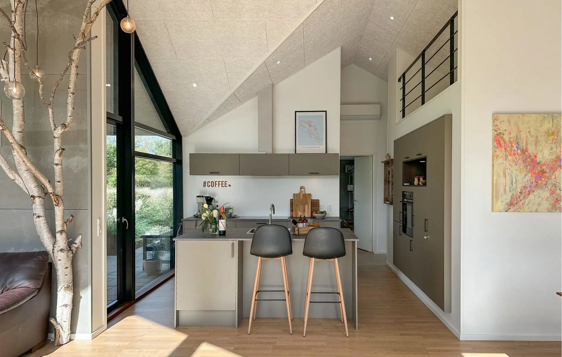 Dieses architektonisch reizvolle Ferienhaus verwöhnt Sie dank großer Fensterfronten mit viel natürlichem Licht und verspricht gemütliche Tage in seinem stilvoll eingerichteten Wohnbereich. Freuen Sie sich aufs Kochen köstlicher Mahlzeiten in der offenen Küche und auf gemeinsame Essen am behaglich beleuchteten Esstisch. Im geräumigen Wohnzimmer lockt ein komfortables Sofa, um gute Gespräche bei einem Glas Wein zu genießen.