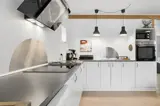 Die Küche ist mit Kühlschrank ausgestattet. Außerdem gibt es 4 Keramik-Kochfelder, Umluftofen, Mikrowelle sowie Geschirrspüler.