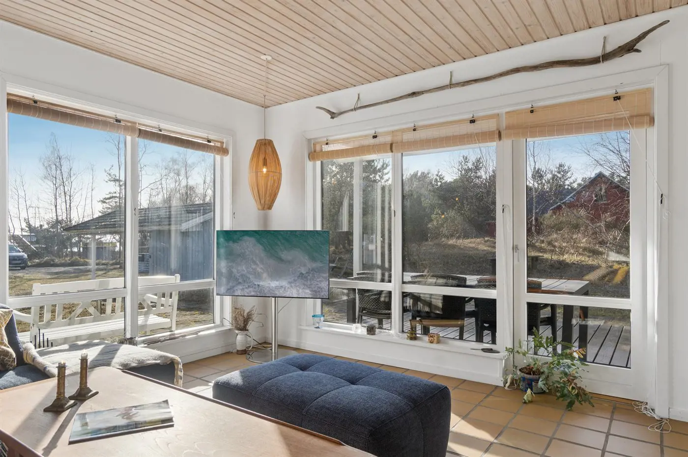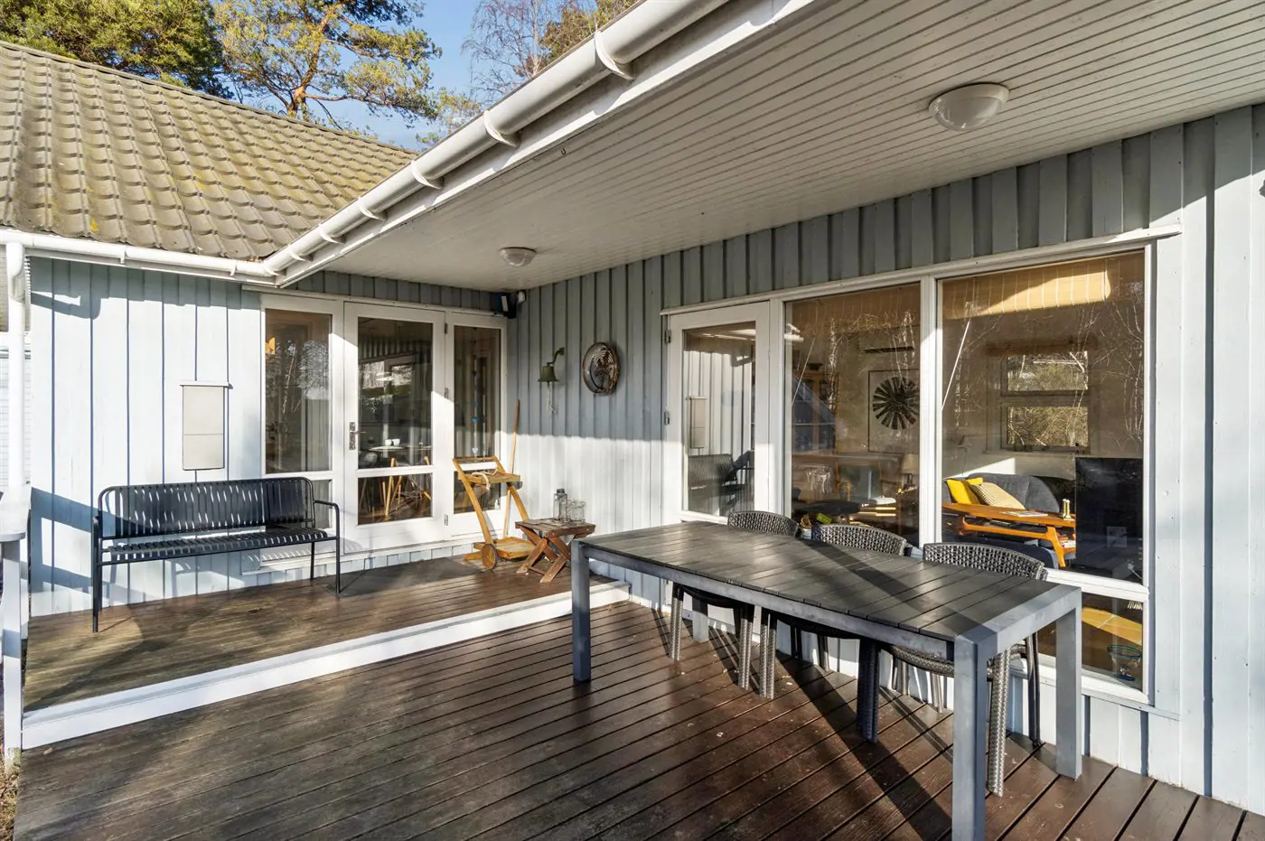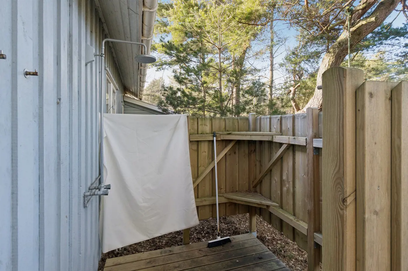 Auf den einladenden Terrassen kannst du Stunden im Freien und den Ausblick auf das ruhige Naturgrundstück genießen. Außerdem gibt es eine Außendusche – perfekt für warme Sommertage.