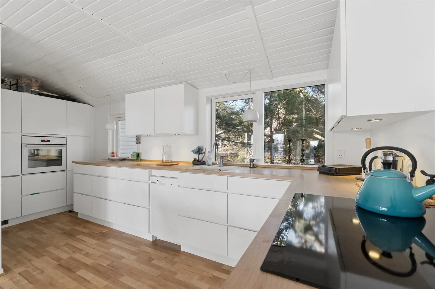 Die Küche ist mit Kühlschrank ausgestattet. Außerdem gibt es 4 Induktions-Kochzonen, Umluftofen, Mikrowelle sowie Geschirrspüler.