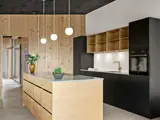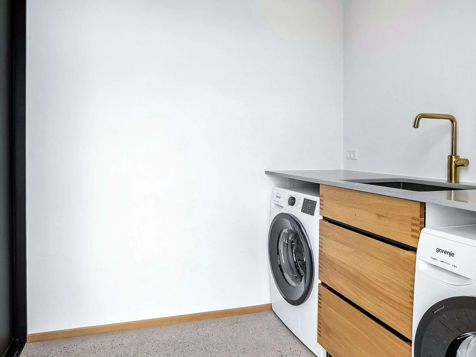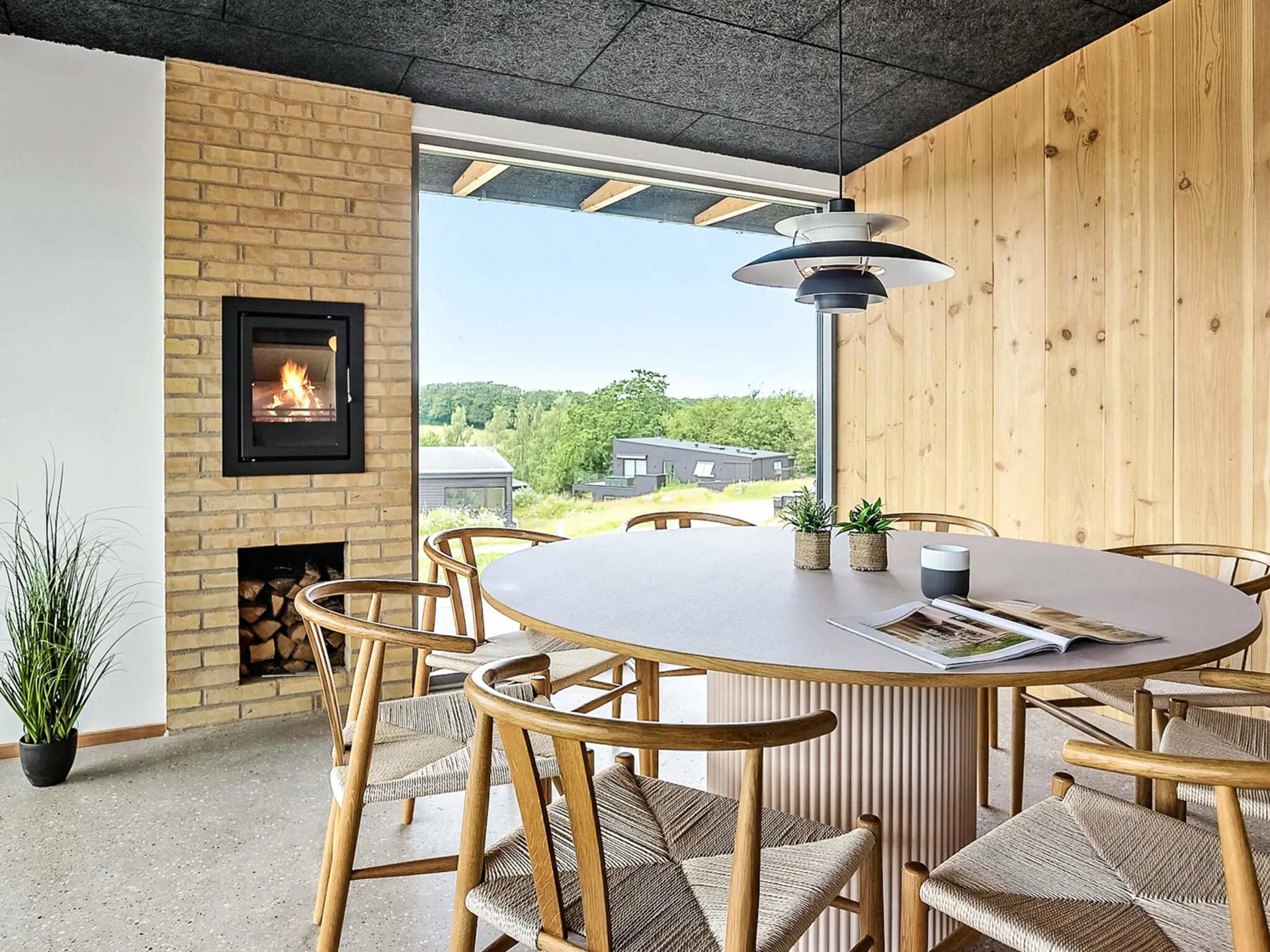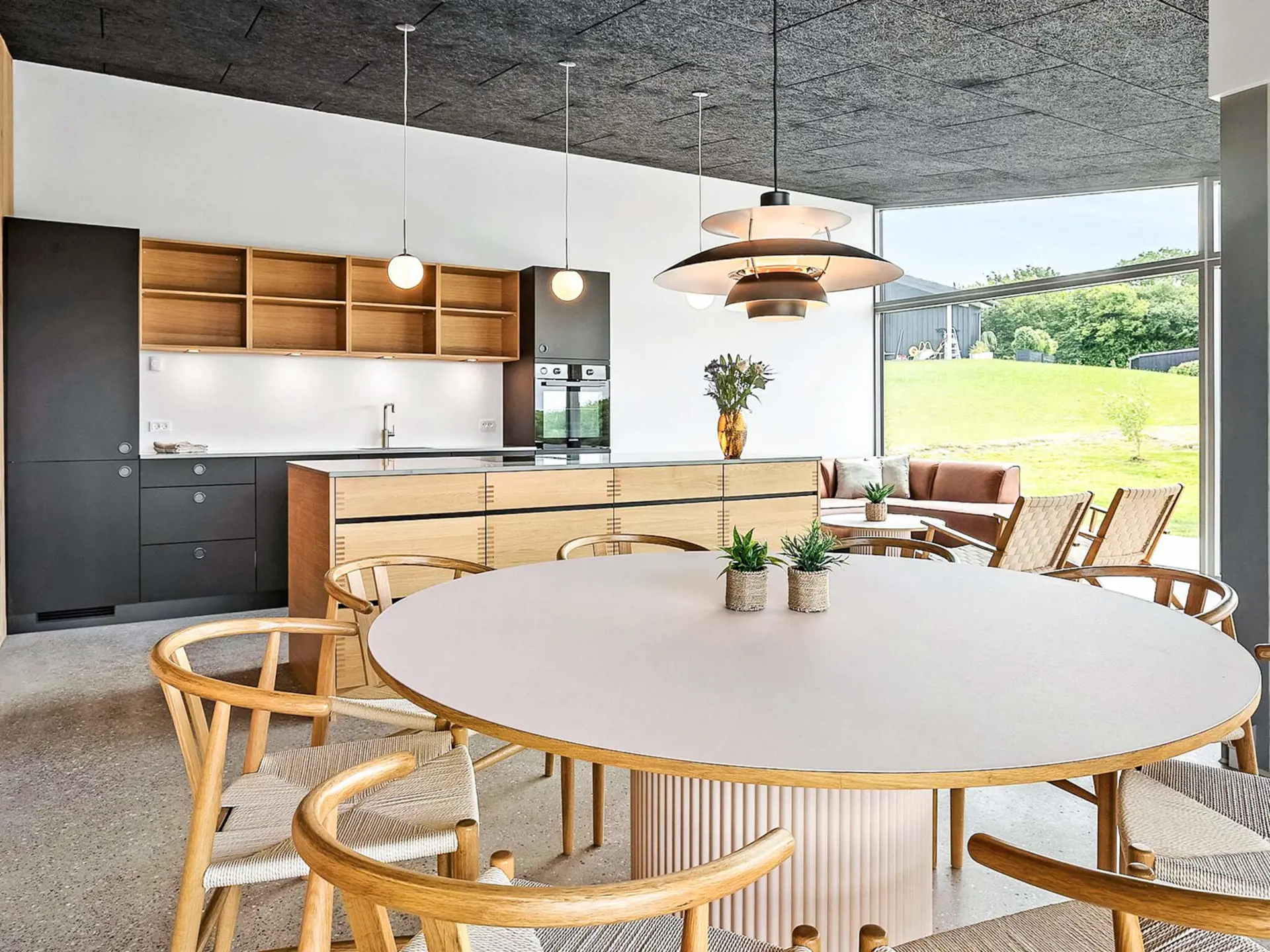 Im Inneren erwartet Sie ein helles und stilvolles Ferienhaus mit einem durchdachten Materialkonzept. Die polierten Betonböden, die mit breiten Douglasienholzdielen verkleideten Wände und die schwarzen Troldtekt-Decken schaffen ein exklusives und modernes Ambiente. Die großen Fenster lassen viel Licht und Natur herein und vermitteln ein fantastisches Raumgefühl. Das Herzstück des Hauses ist die elegante Eichenküche, die komplett ausgestattet ist und zum gemeinsamen Kochen und Verweilen einlädt.