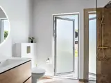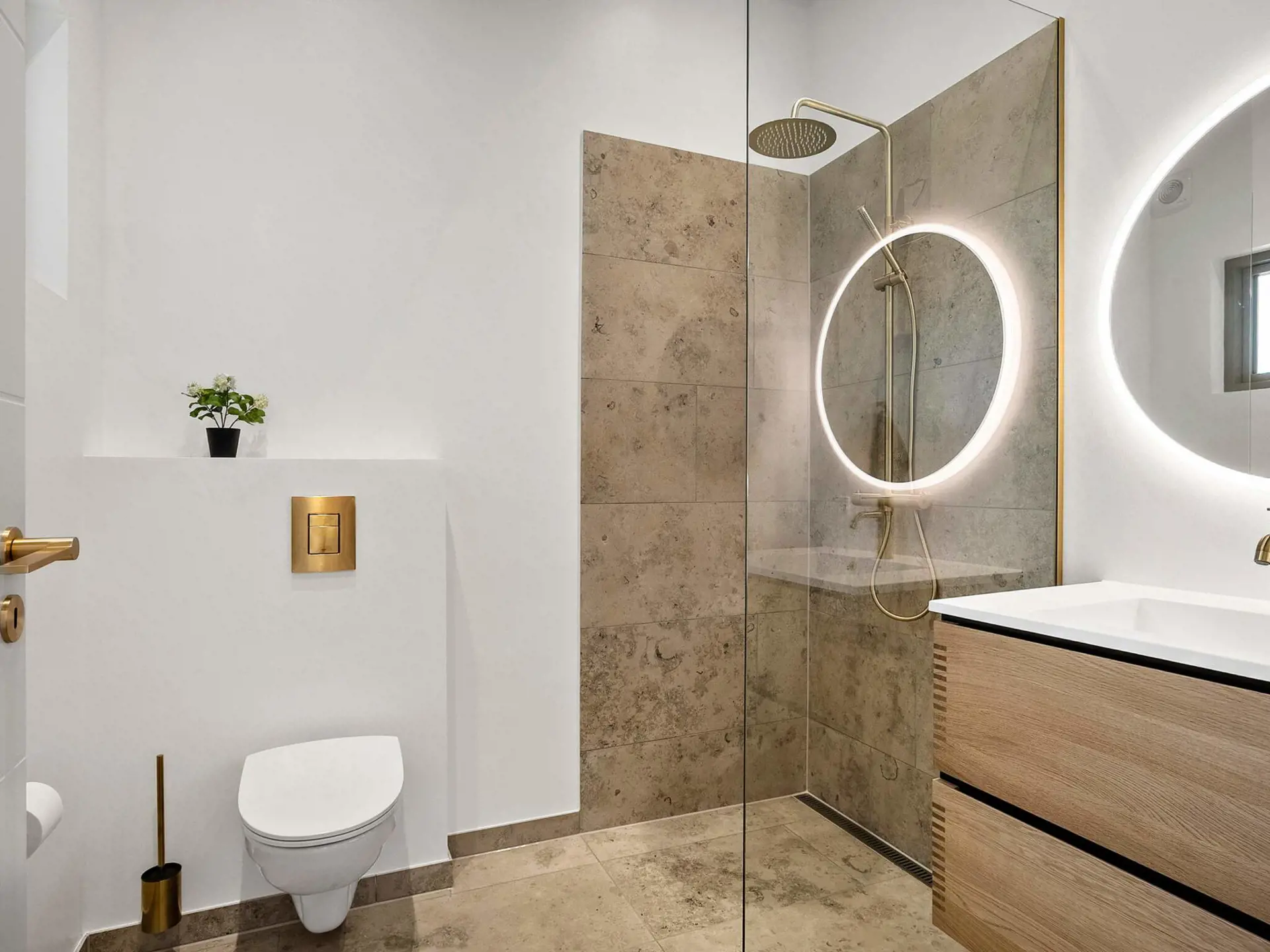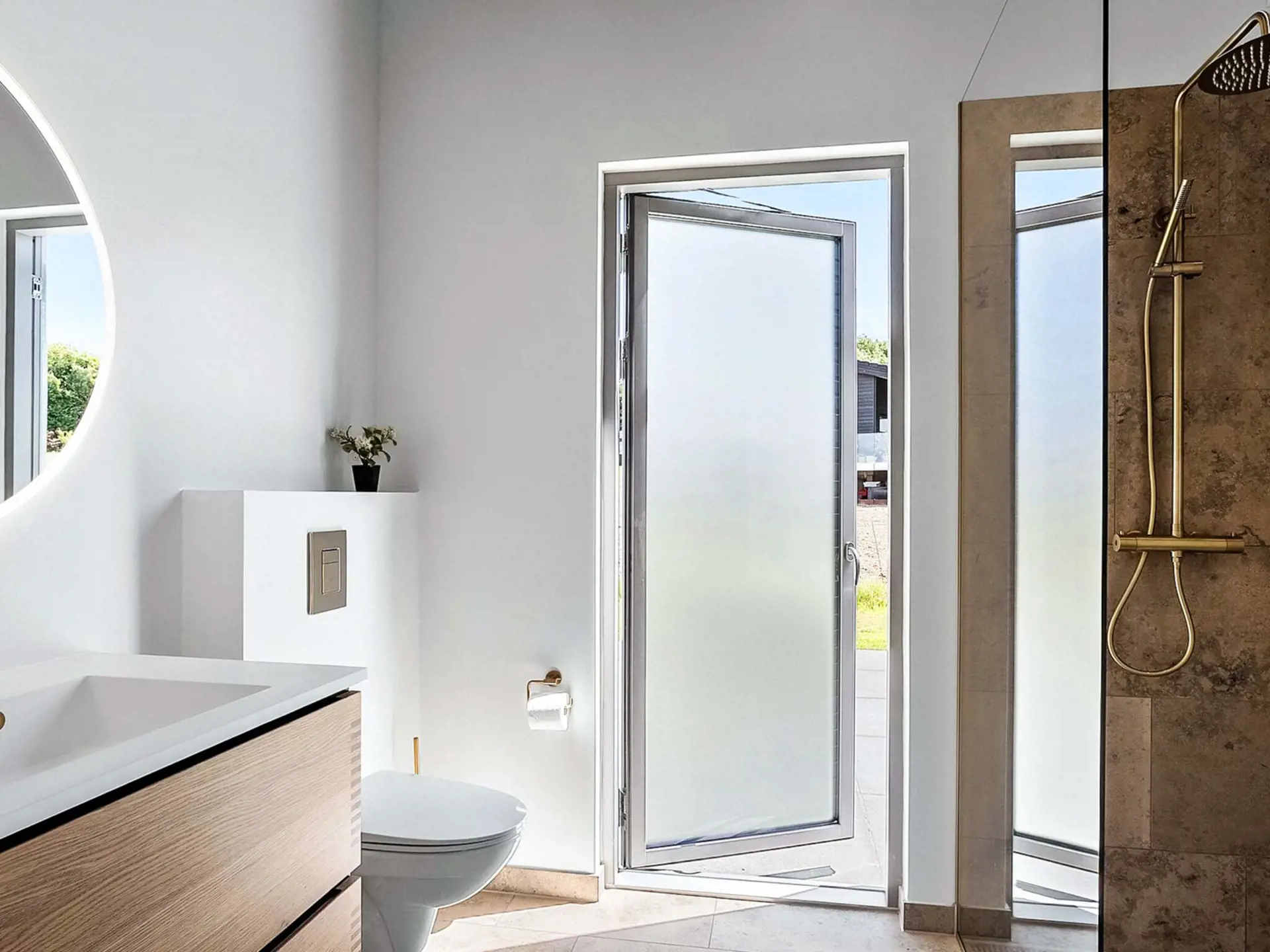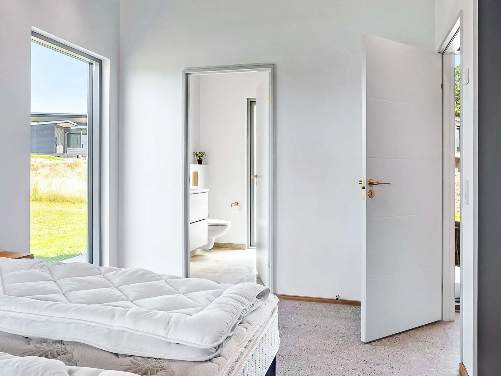 Das Ferienhaus verfügt über vier komfortable Schlafzimmer und zwei schöne Badezimmer – eines davon mit direktem Zugang von einem der Zimmer. Die Badezimmer sind mit exklusiven Naturgranitfliesen, frei hängenden WCs und stilvollen Details ausgestattet. Im gesamten Ferienhaus sorgt eine angenehme Fußbodenheizung für behagliche Wärme.