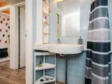 Es ist innen wohnlich eingerichtet und gut ausgestattet, mit u.a. 43 Zoll Smart-TV, Kabel-TV und kostenlosem WLAN. Oben auf dem unter dem Dach steht ein zweiter, kleiner Fernseher bereit.