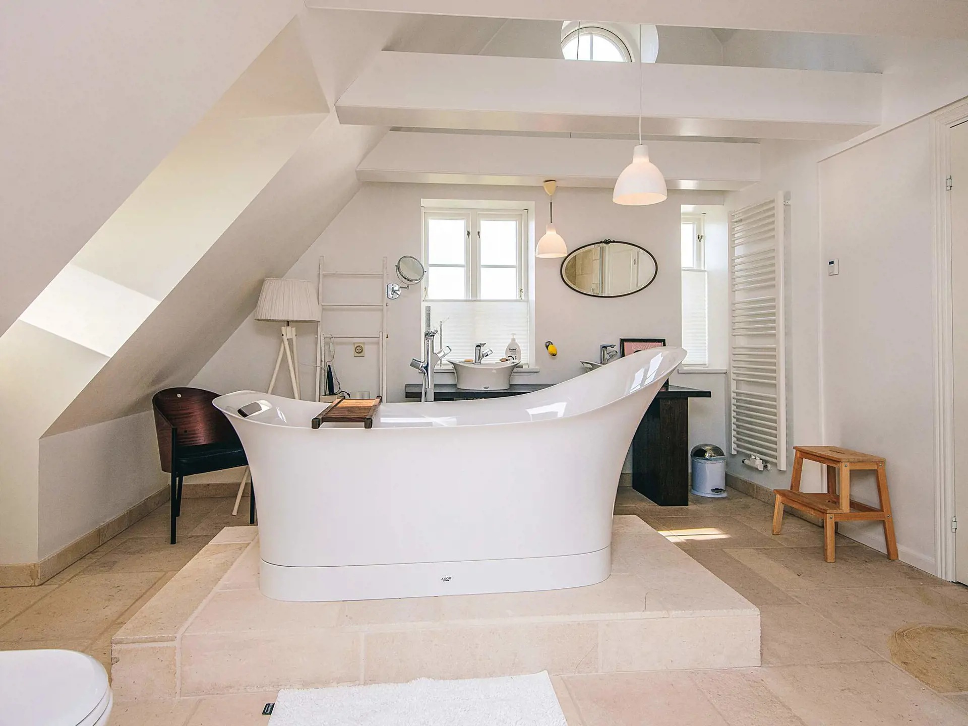 Oben im Dachgeschoss befindet sich ein kombinierter Wohn-/Schlafraum mit Sitzgelegenheit, TV und Doppelbett, sowie ein großes Bad mit strategisch platzierter Badewanne, von der sich ein bezaubernder Meerblick bietet.