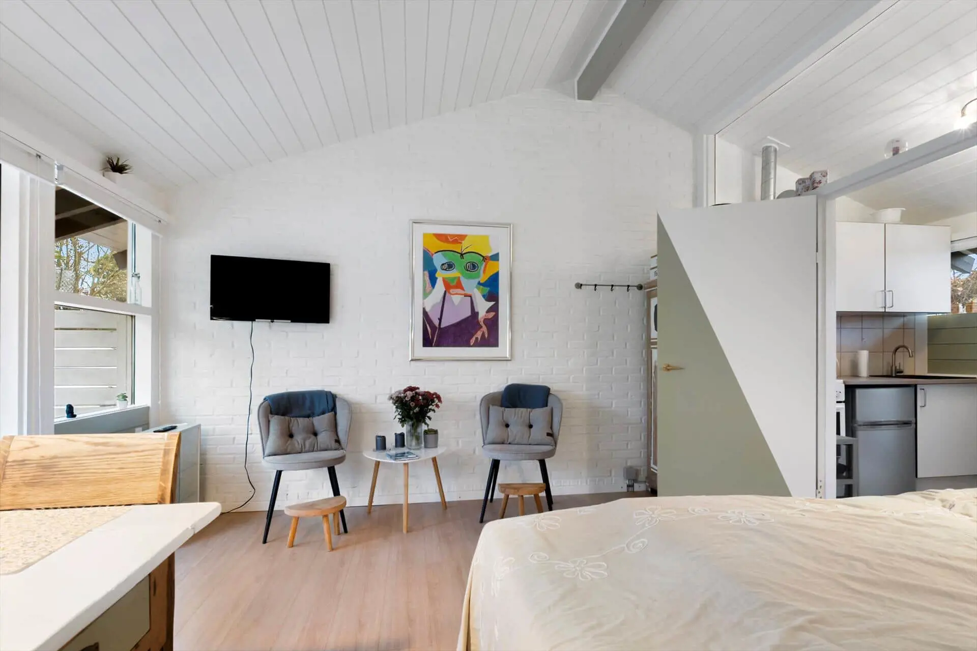 Wenn Sie diese schön renovierte Ferienwohnung betreten, werden Sie sofort von einer hellen und einladenden Atmosphäre empfangen. Die geschmackvolle Einrichtung und Ausstattung schaffen eine heimelige Atmosphäre, in der Sie sich vollkommen entspannen können. Der offene Wohnbereich mit großen Fenstern bietet Ihnen nicht nur einen Blick auf die Terrasse, sondern lässt auch viel Tageslicht herein. Hier können Sie gemütliche Stunden mit Familie und Freunden verbringen, sei es bei Mahlzeiten am langen Esstisch oder beim Entspannen auf dem Sofa nach einem aktiven Tag. Das bequeme Bett sorgt dafür, dass Sie gut schlafen und jeden Tag bereit für neue Erlebnisse sind.