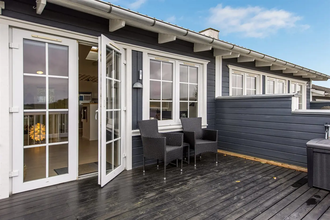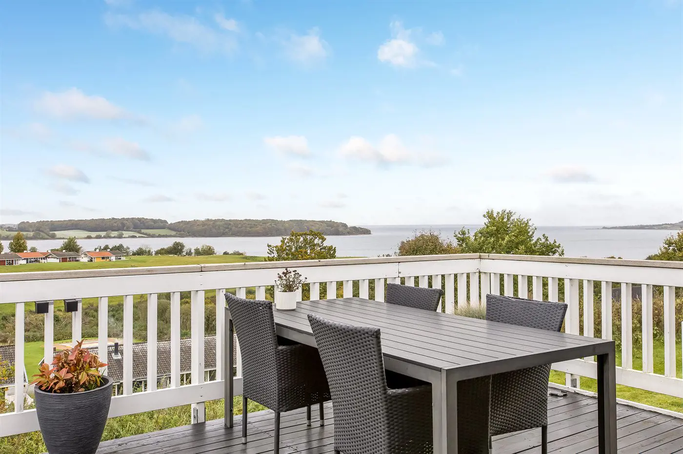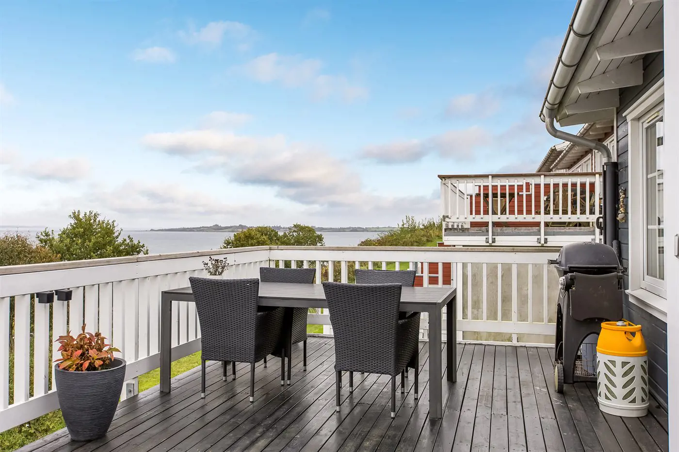 Draußen könnt ihr auf dem gemütlichen, nach Osten ausgerichteten Balkon schöne Stunden an der frischen Luft genießen – mit einem herrlichen Blick auf das Wasser, wo ihr die vorbeifahrenden Schiffe beobachten könnt. Außerdem gibt es eine nette, nach Süden und Westen ausgerichtete Terrasse – hier könnt ihr es euch z. B. mit einem guten Buch gemütlich machen und die ruhigen Abende genießen.