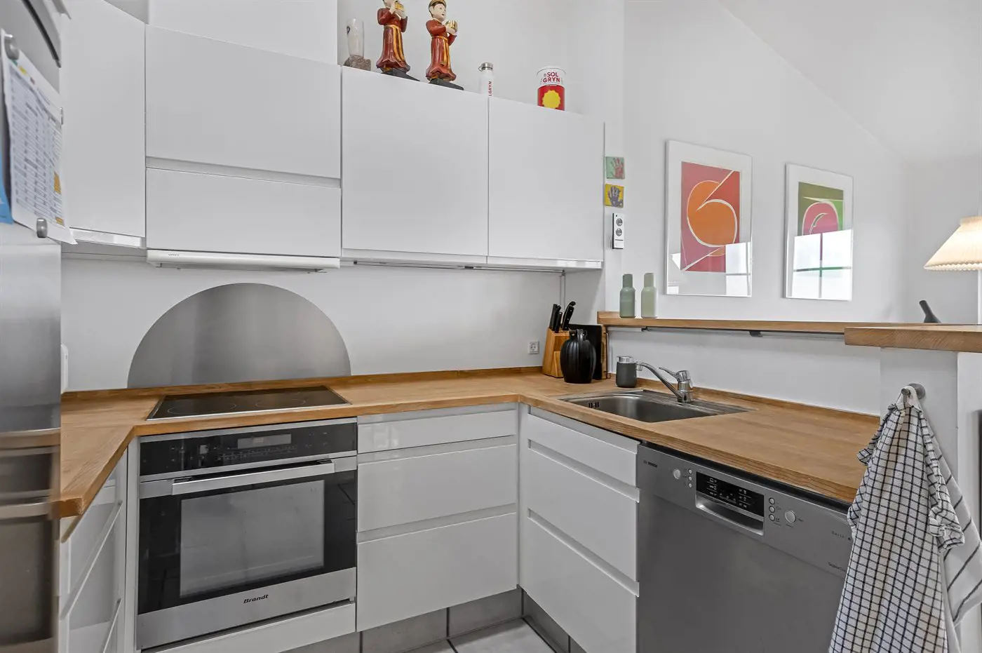 Die Küche ist mit Kühlschrank ausgestattet. Außerdem gibt es 4 Induktions-Kochzonen, Umluftofen, Mikrowelle sowie Geschirrspüler. Fußbodenheizung in der Küche.