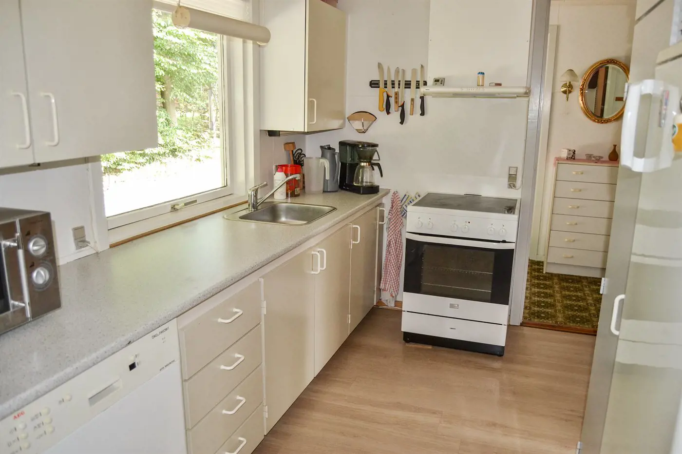 Die Küche ist mit Kühlschrank ausgestattet. Außerdem gibt es 4 Induktions-Kochzonen, Umluftofen, Mikrowelle, Airfryer sowie Geschirrspüler.