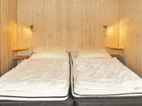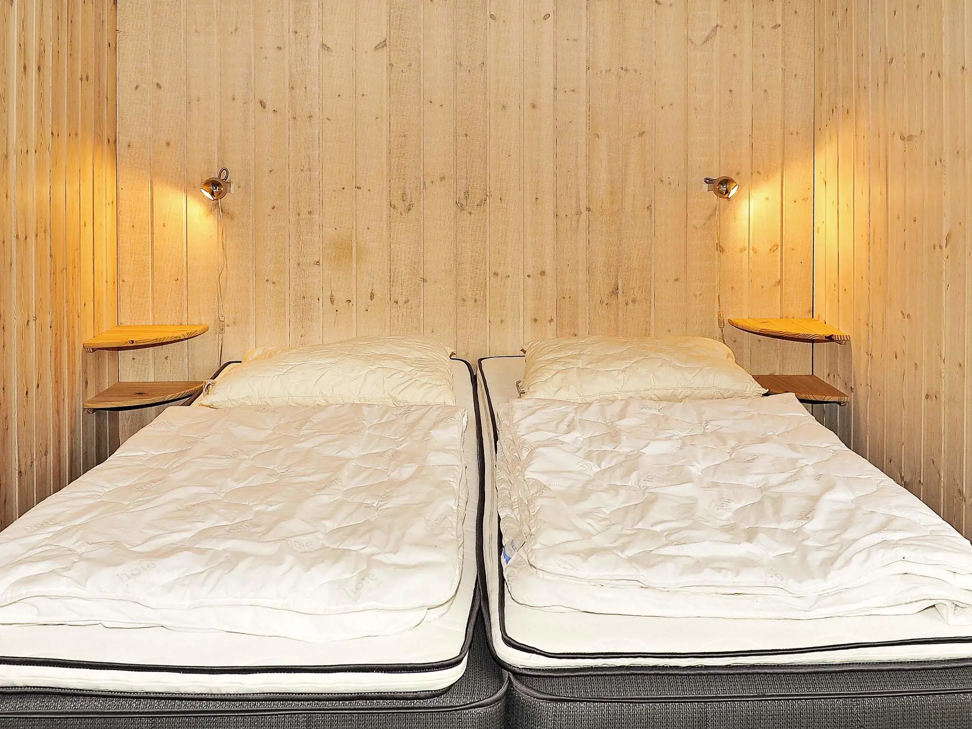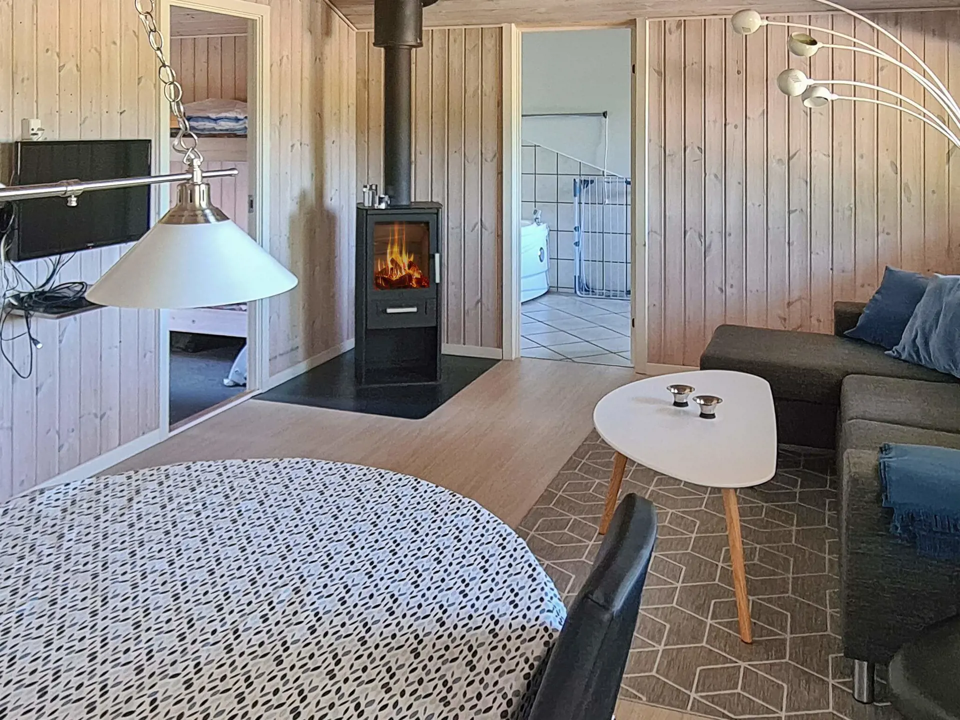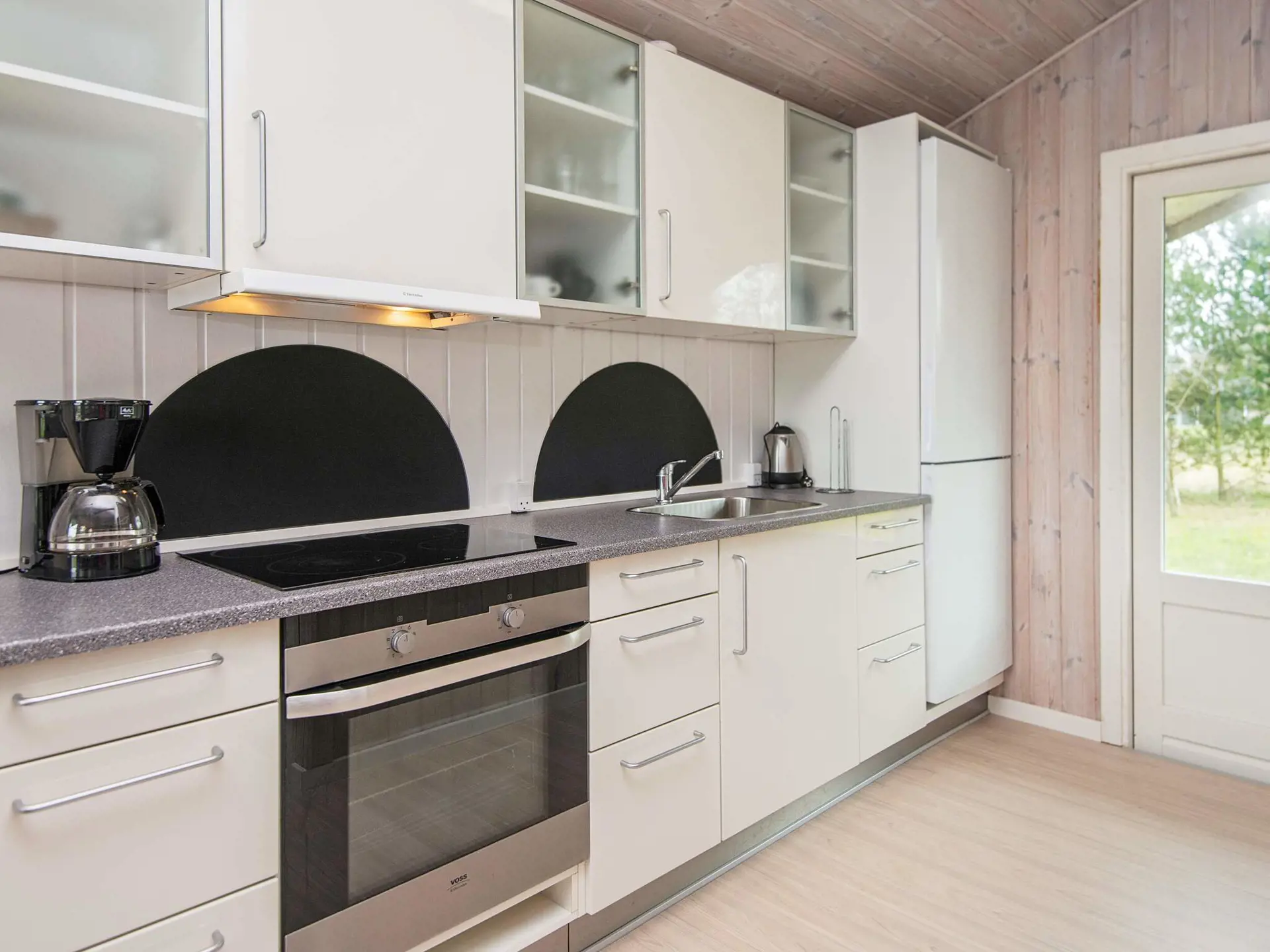 Das Ferienhaus selbst ist komfortabel eingerichtet und verfügt über zwei Schlafzimmer; eines mit Doppelbett, das zweite mit Etagenbett. Im Bad sind auch Waschmaschine und Wäschetrockner untergebracht. Offener Küchen-/Wohnbereich mit Ess- und Sitzecke für das Familienleben sowie Holzofen und klimafreundlicher Wärmepumpe. Der Raum bietet Zutritt zur großen, überdachten Veranda des Hauses.