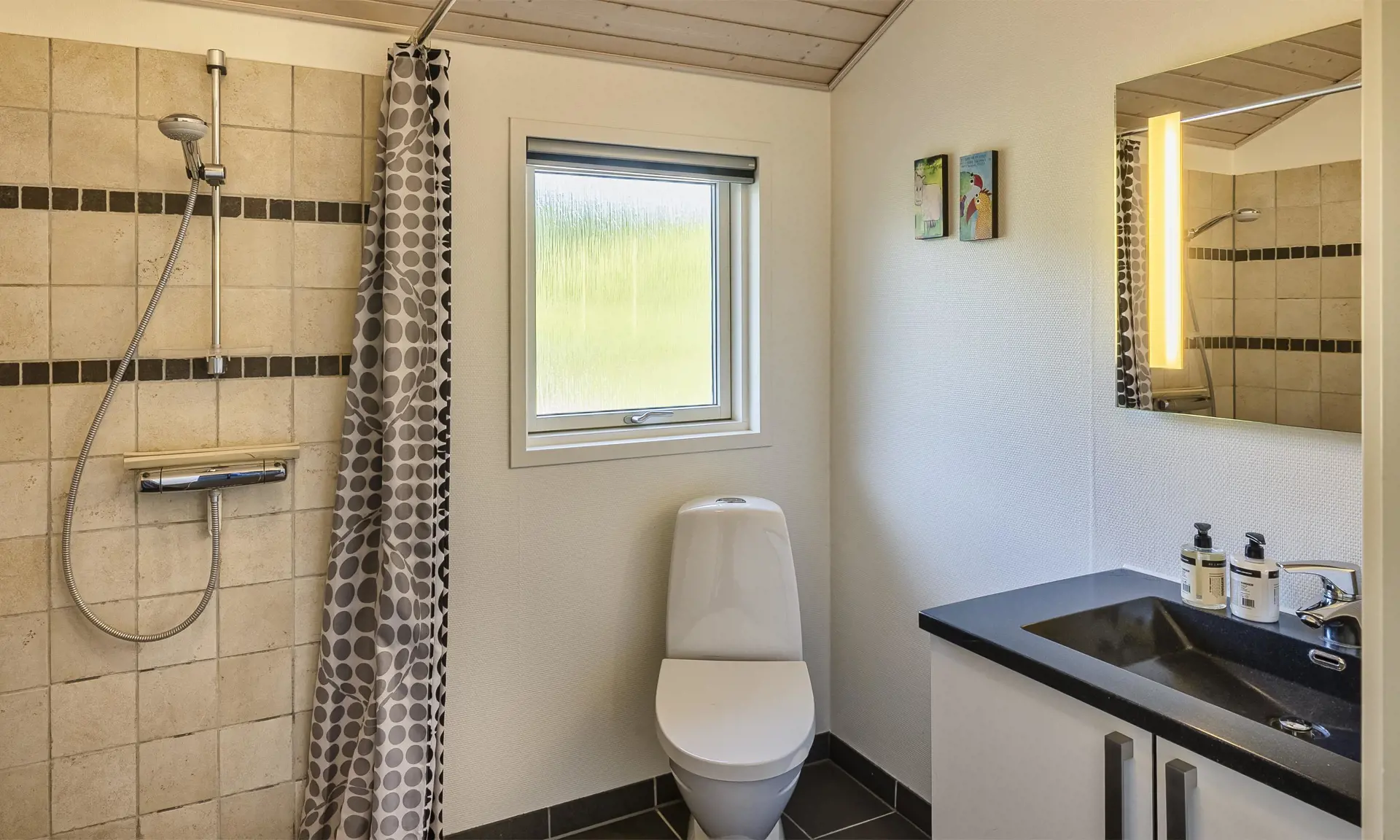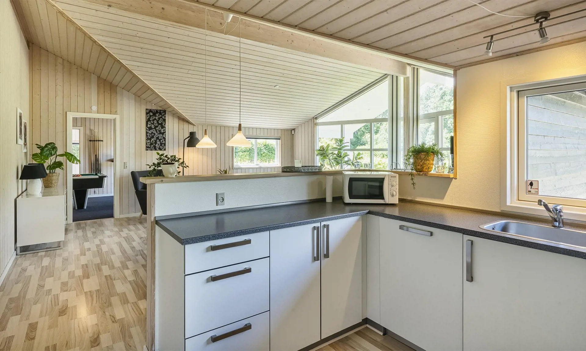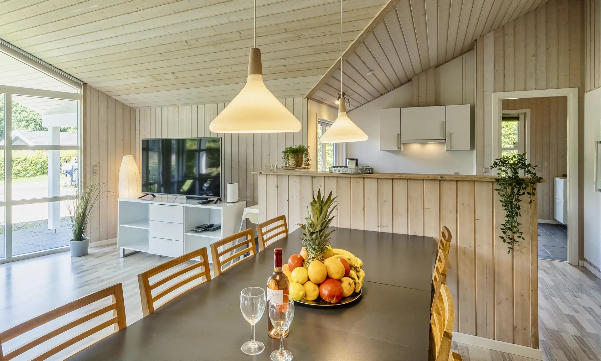Das Herzstück des Hauses ist das große, helle Wohnzimmer, dessen Panoramafenster viel Licht hereinlassen und einen wunderbaren Blick auf die Umgebung bieten. Hier können Sie zusammen spielen, köstliche Mahlzeiten genießen oder einfach in der gemütlichen Sofaecke entspannen. Die offene Küche ist voll ausgestattet und lädt zu gemeinsamen Kochabenteuern ein – vom einfachen Frühstück bis zu gemütlichen Abendessen.