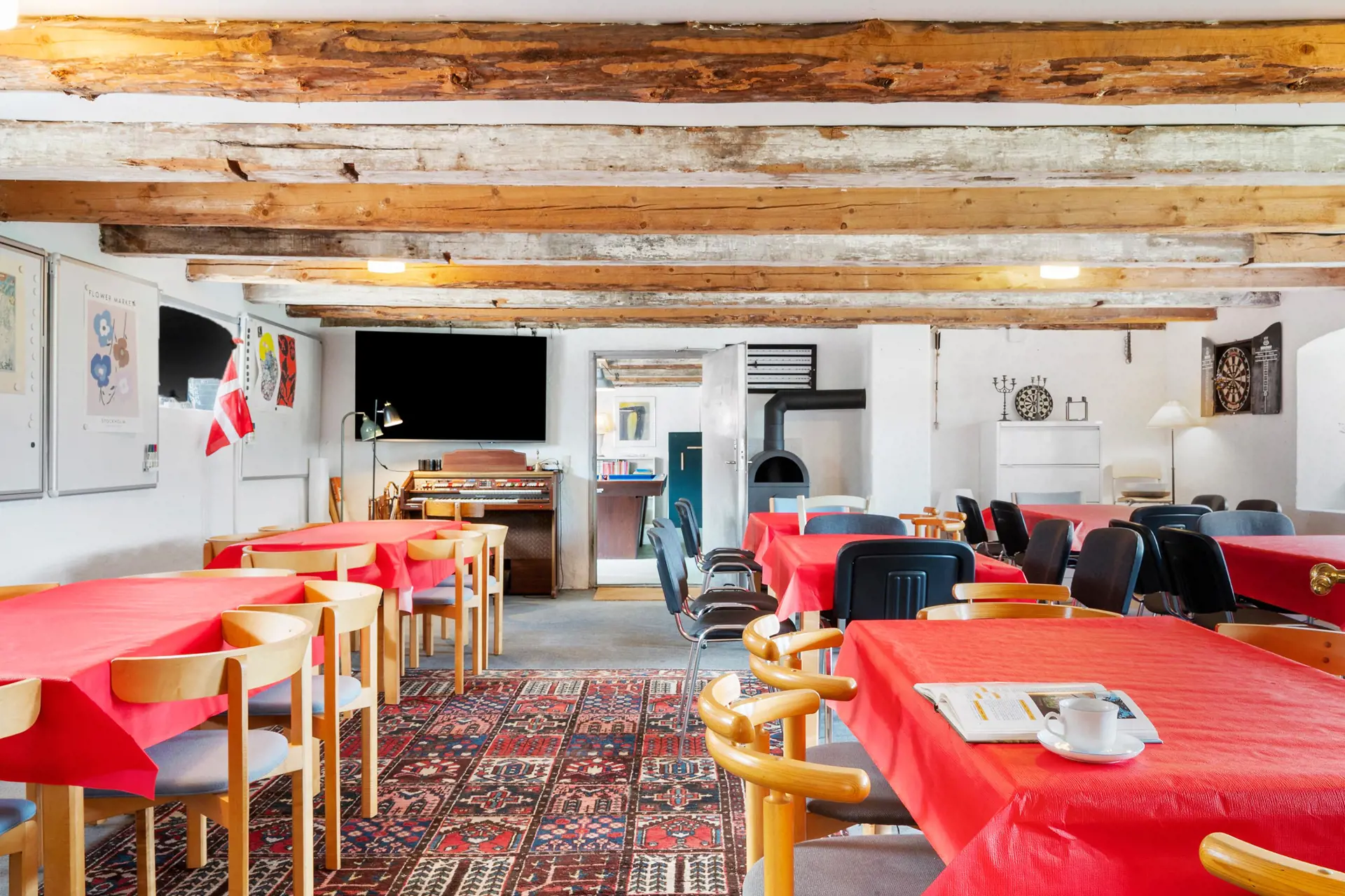 Heute hat das Gebäude ein rotes Ziegeldach, flankiert von wunderschönen Giebeln, an denen noch immer Holz und Details aus dem 17. Jahrhundert zu sehen sind. Die Geschichte steckt in den Wänden – und wenn man durch die Räume geht, merkt man deutlich, dass dieses Haus seit über 150 Jahren für Alltag, Studentenleben, Versammlungen und Feste genutzt wird.