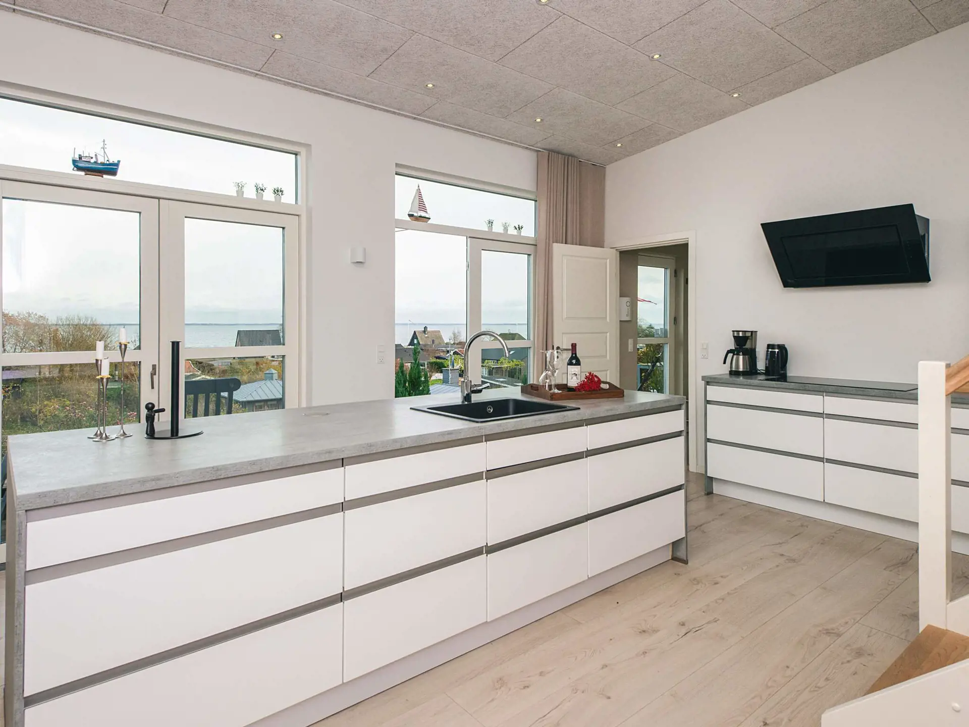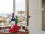 Die Küche ist gut ausgestattet und verfügt über einen großen Kühlschrank, ein breites Kochfeld, eine Dunstabzugshaube, einen Backofen und eine Mikrowelle. Im Flur befindet sich außerdem ein Kühl-/Gefrierschrank, sodass ausreichend Platz für Getränke vorhanden ist. Das Wohnzimmer bietet außerdem einen großen Esstisch mit bequemen Stühlen und eine gemütliche Ecke, von der aus man bei jedem Wetter die Aussicht genießen kann. Das Haus ist von schönen Terrassen umgeben, auf denen Sie die Aussicht genießen können.