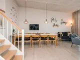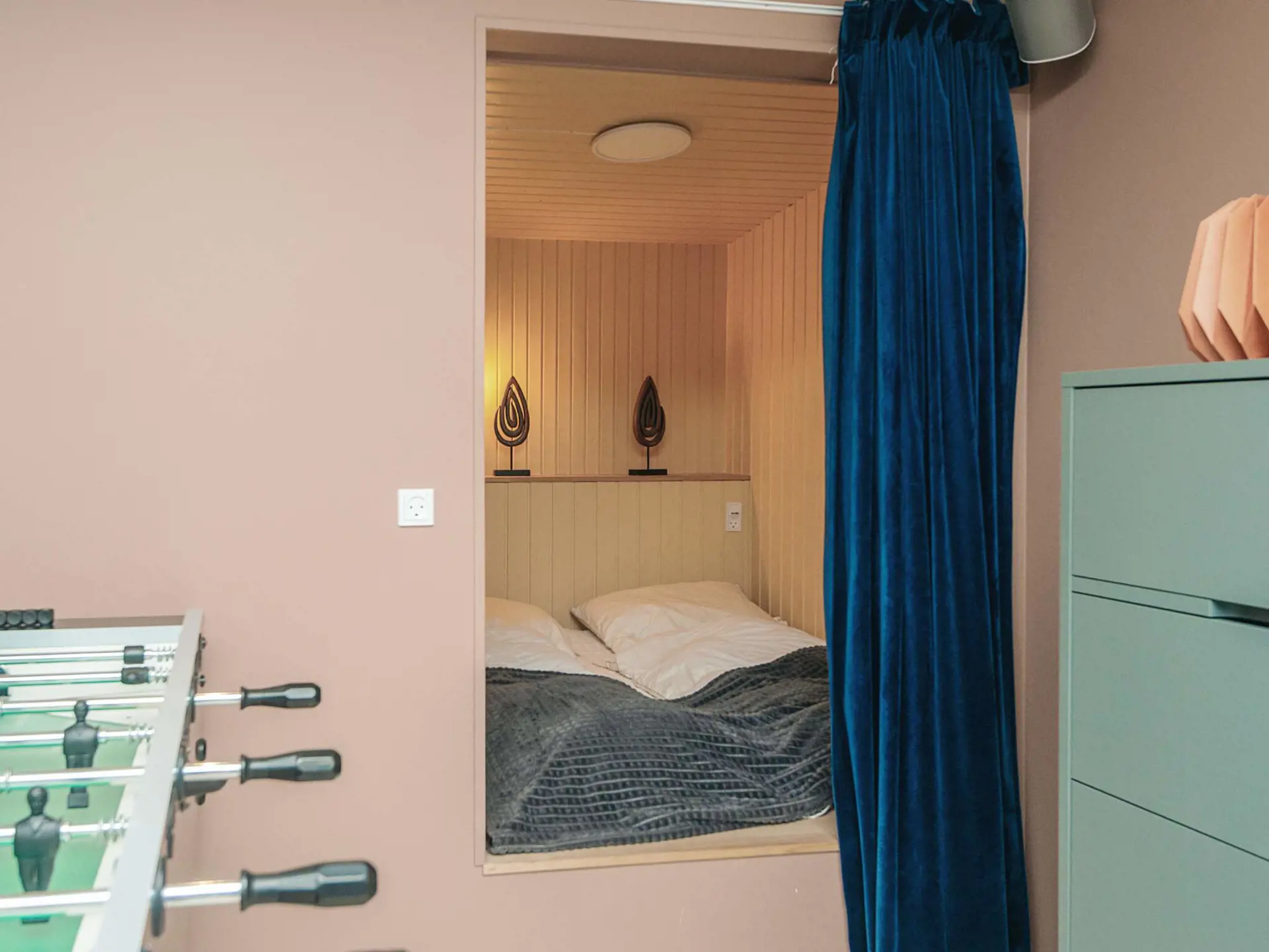 Im Wohnzimmer gibt es neben einer gemütlichen Sitzecke vor dem Fernseher auch einen Kickertisch zum Entspannen.