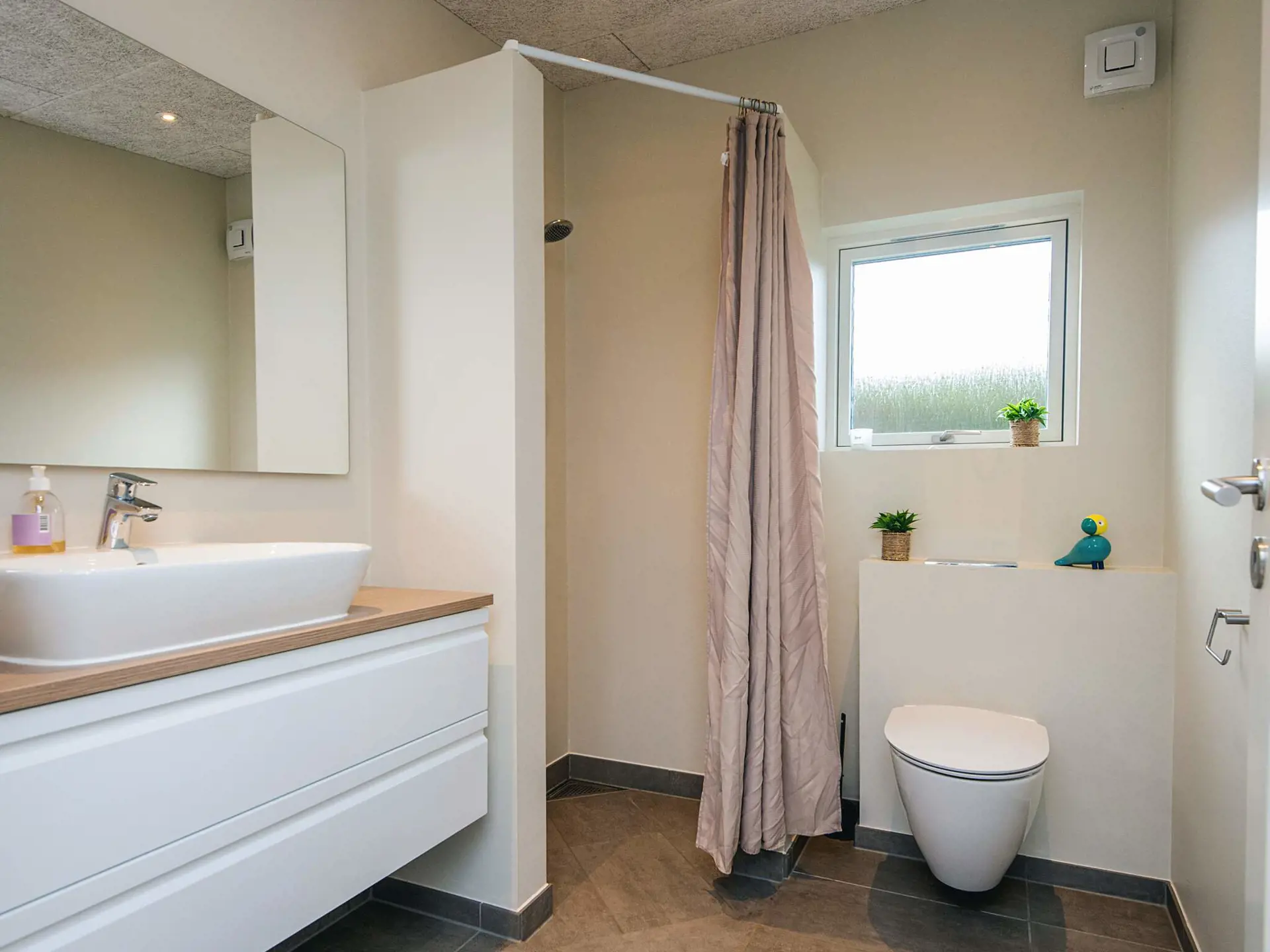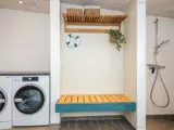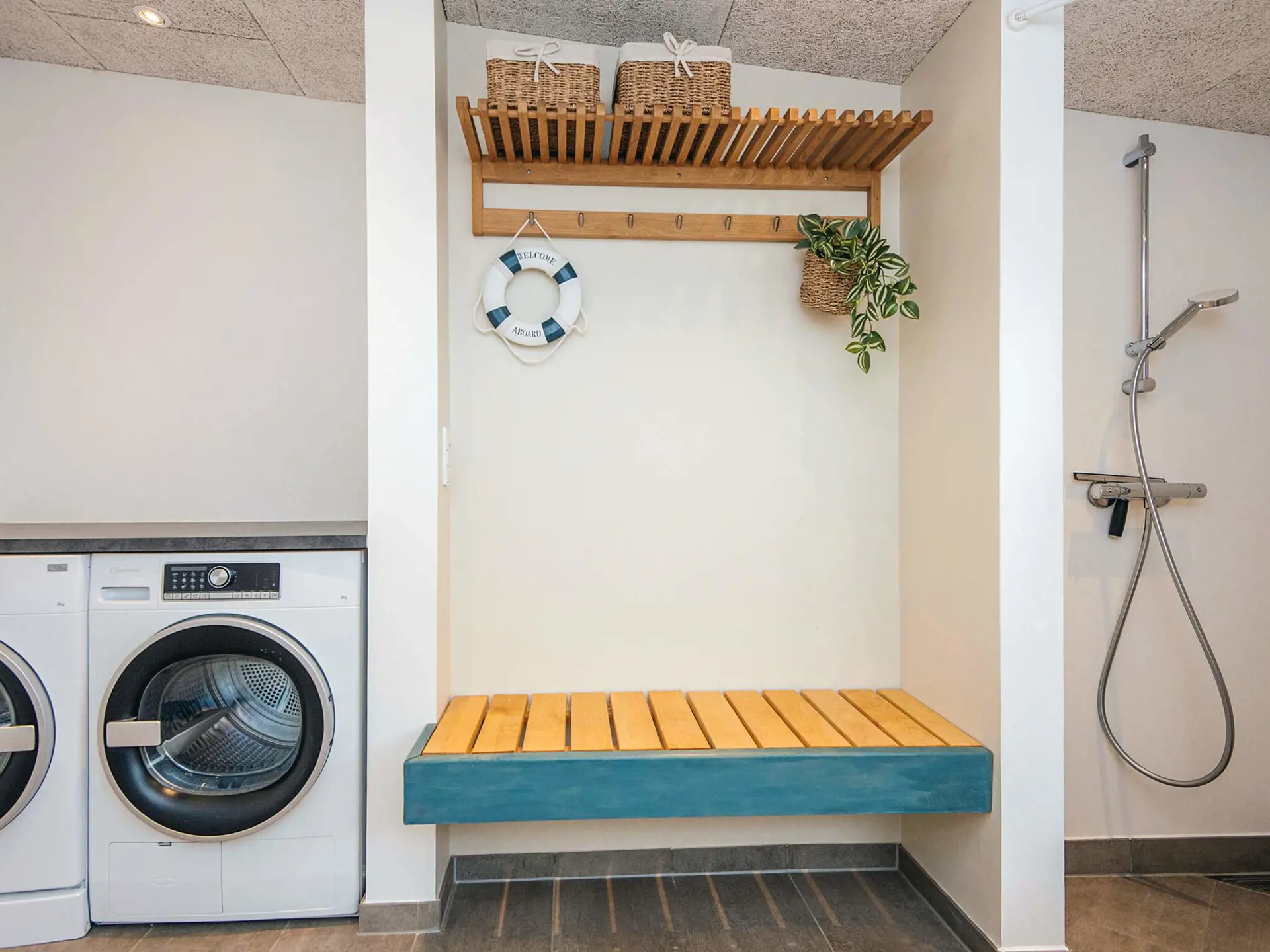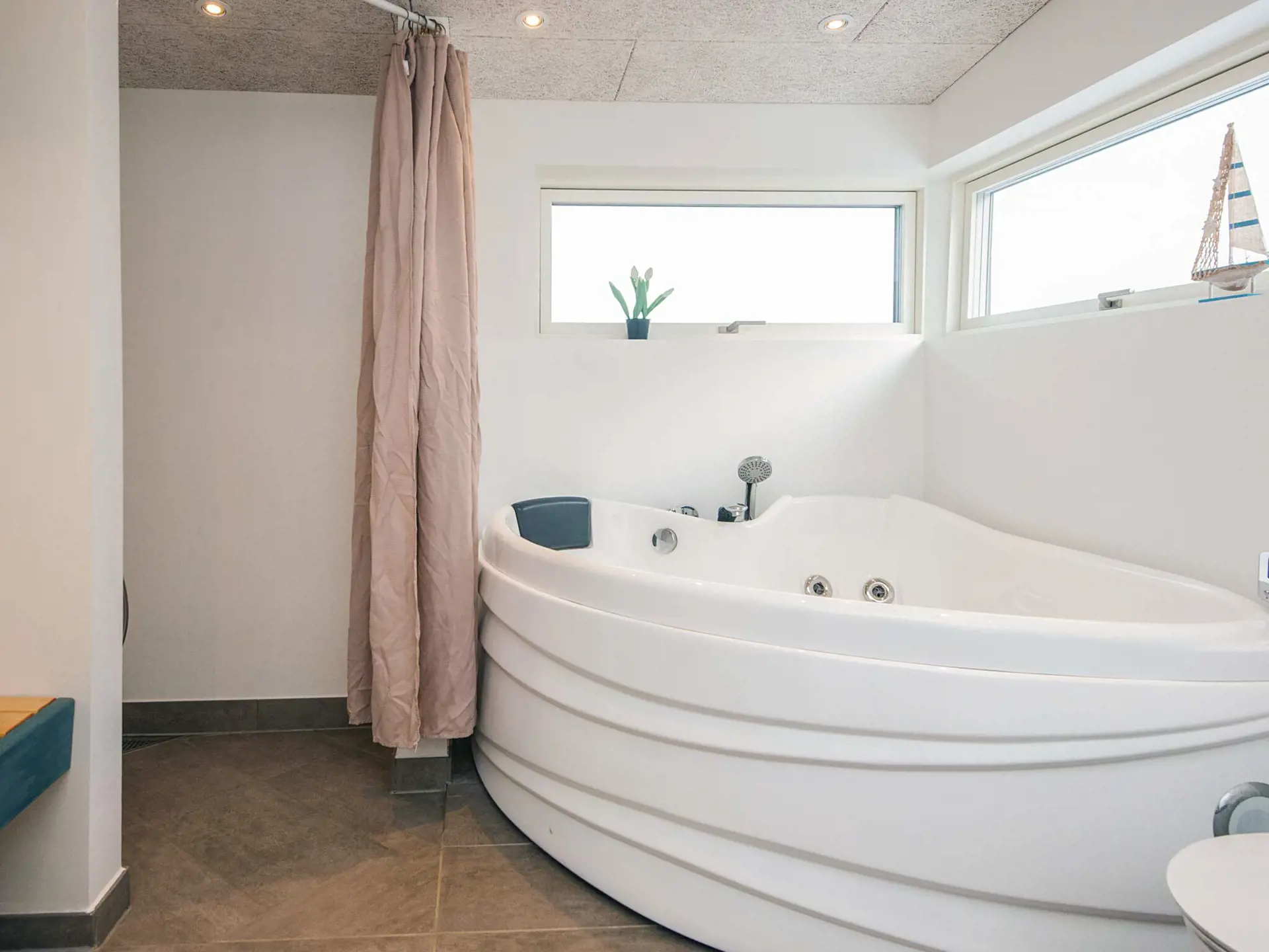 Das Ferienhaus selbst verfügt über drei Schlafzimmer mit Doppelbett und eine Schlafnische für zwei Personen – alle mit guten Betten. Es gibt zwei Badezimmer mit WC und Dusche – eines davon zusätzlich mit Waschmaschine/Trockner und Whirlpool.