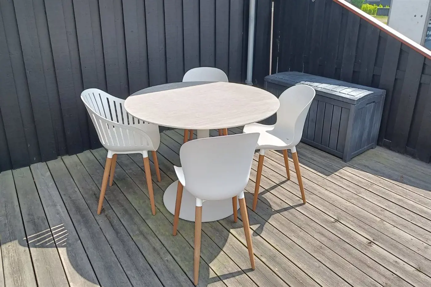 Draußen erwartet dich eine Terrasse mit über 80 m², davon sind 10 m² überdacht. Gartenmöbel stehen sowohl im überdachten Bereich als auch auf der Terrasse mit Blick zum Wald bereit. Zusätzlich gibt es zwei Liegestühle, die du dort platzieren kannst, wo du die Sonne genießen möchtest. Auflagen für die Stühle findest du in der Auflagenbox.