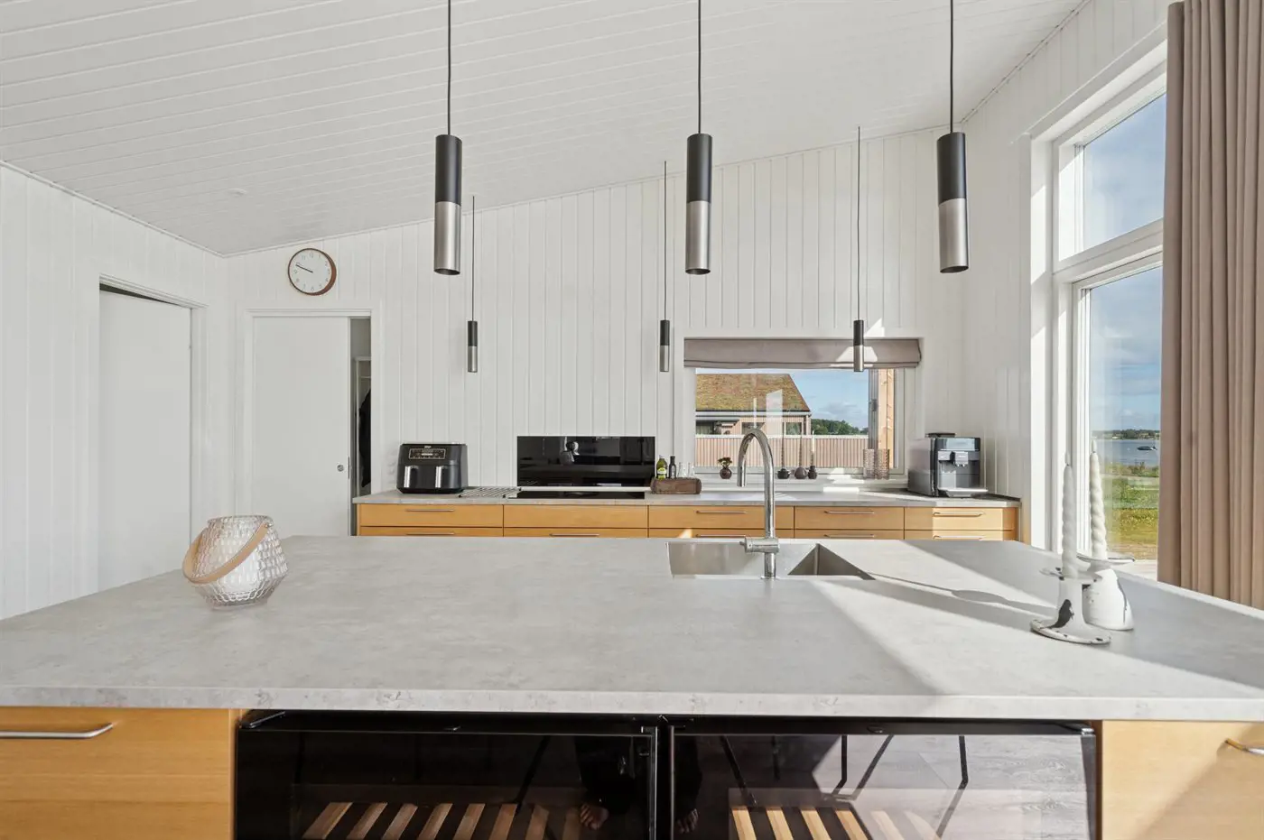 In dem wunderschönen Ferienhausgebiet von Grønninghoved liegt dieses einzigartige und herrliche Ferienhaus. Das Ferienhaus befindet sich in erster Reihe direkt am Wasser und ist damit perfekt gelegen mit einem fantastischen Panoramablick über den Lillebælt. Die Aussicht kann aus allen Blickwinkeln im großen Wohn- und Küchenbereich genossen werden – egal, ob du in der Küche das Abendessen vorbereitest oder im Sessel am breiten Fenster entspannst, du kannst jederzeit das Leben auf dem Wasser und den ruhigen Horizont verfolgen.